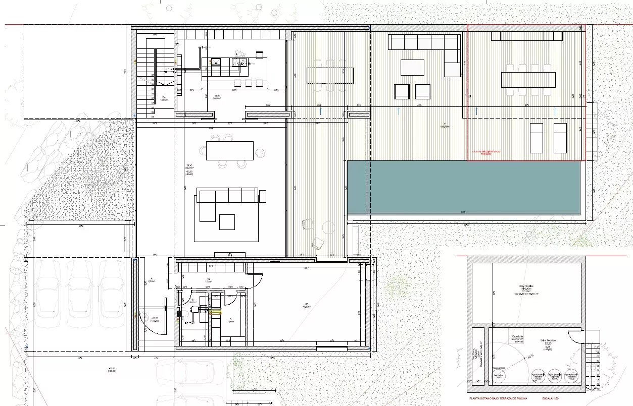 The villa project has 2 floors, the ground floor has a kitchen with central island, a spacious living dining room with large windows that open directly onto the terrace and garden. The ground floor has an extra room that can be used as a study or an additional bedroom. The terrace area has a covered porch next to a 15 metre long swimming pool.