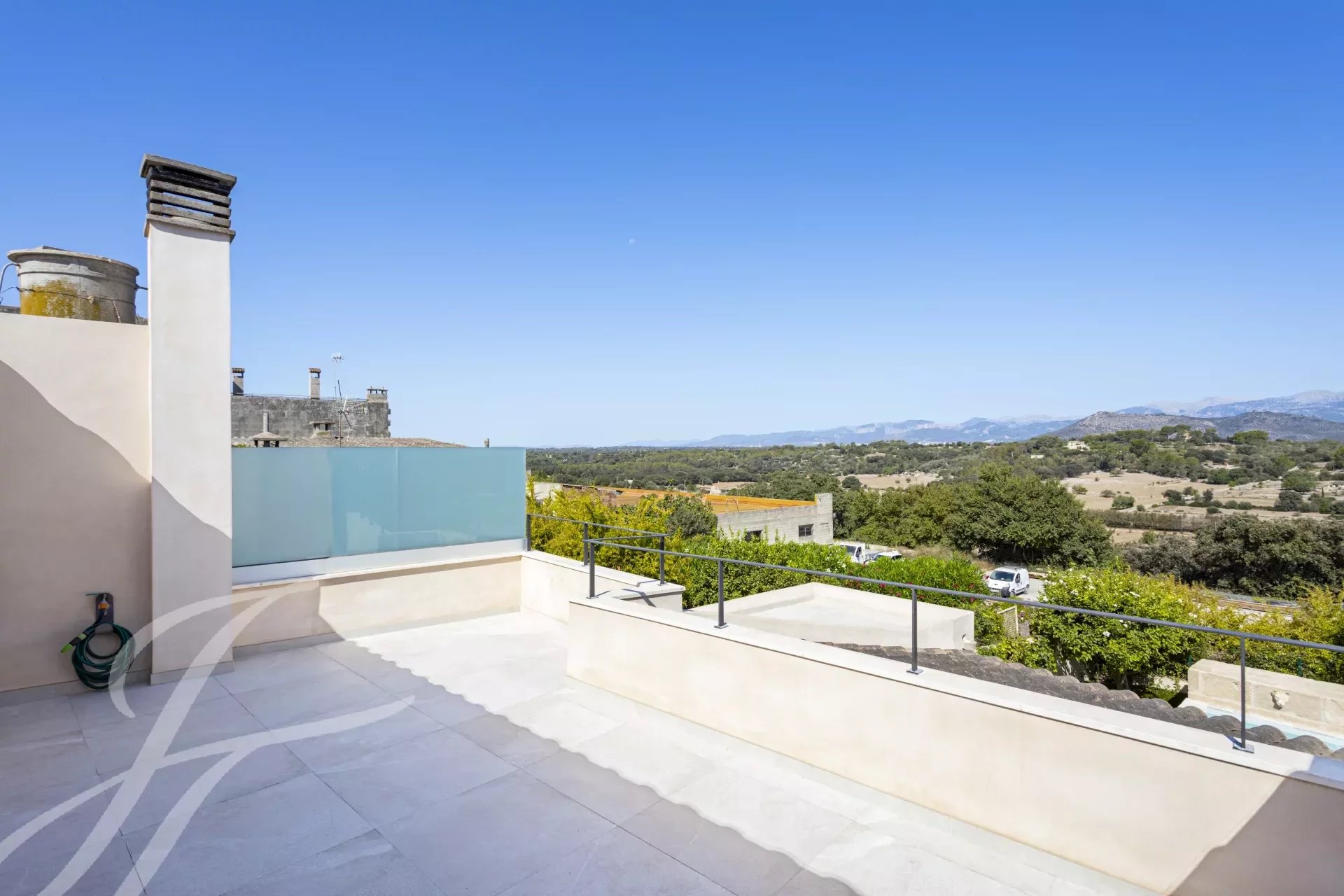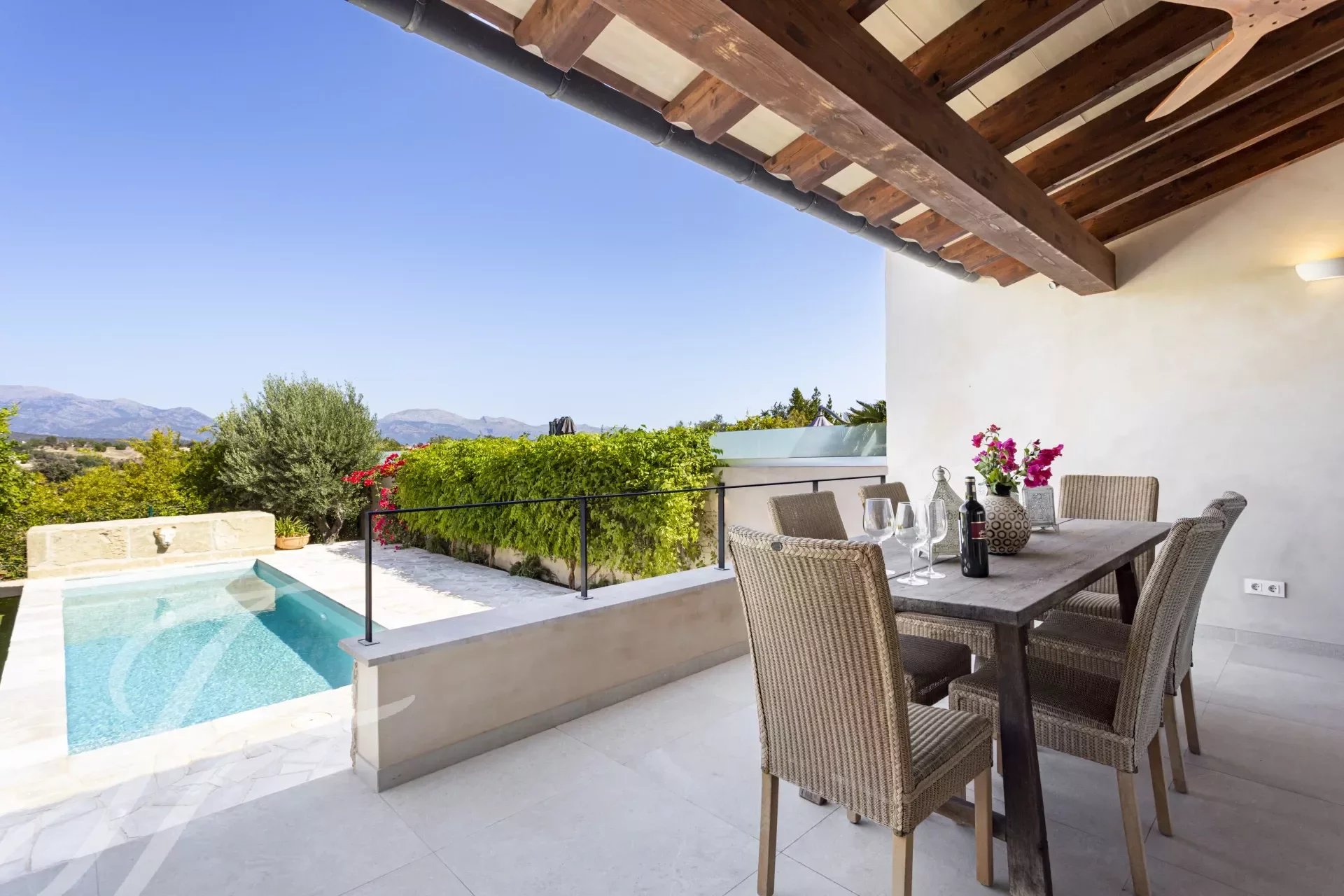 The garden area with Mediterranean plants is flat and equipped with a saltwater pool with marvelous views of the Mallorca countryside.