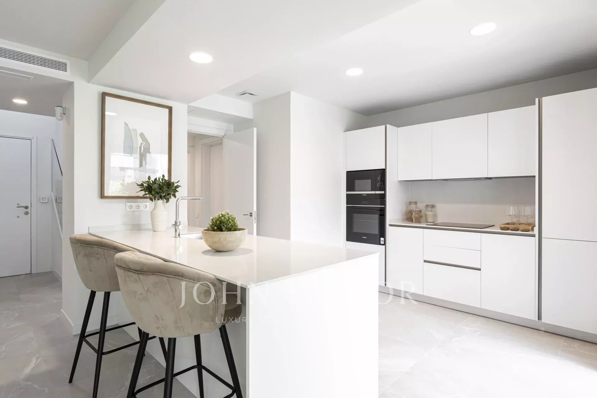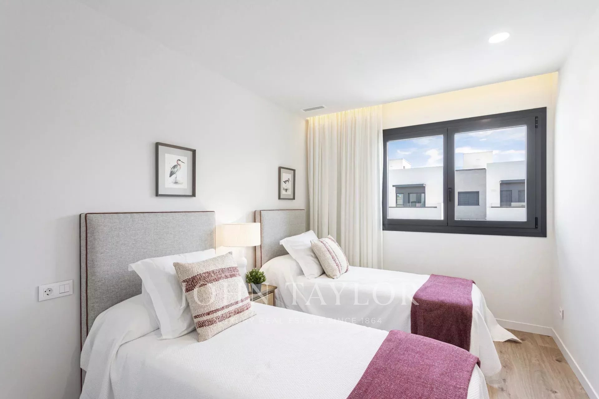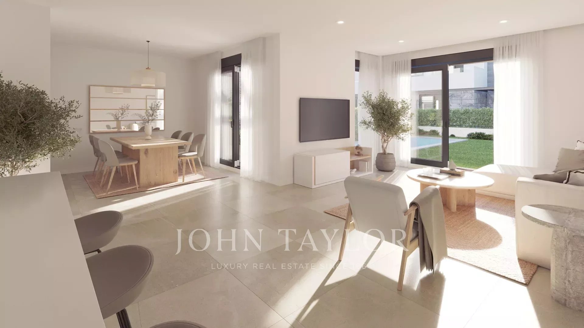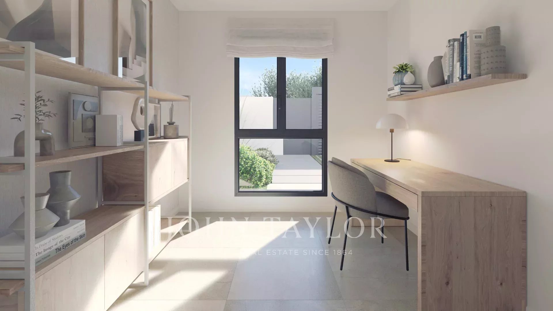 At the front, two open-air parking spaces framed by greenery offer a warm welcome and total convenience. At the back, a private garden with a porch and pool invites you to relax, entertain, and enjoy Mallorca’s exceptional climate while taking care of your well-being. Upstairs, the master bedroom opens onto a cozy balcony with a sofa and table — your private corner to unwind or start the day inspired.