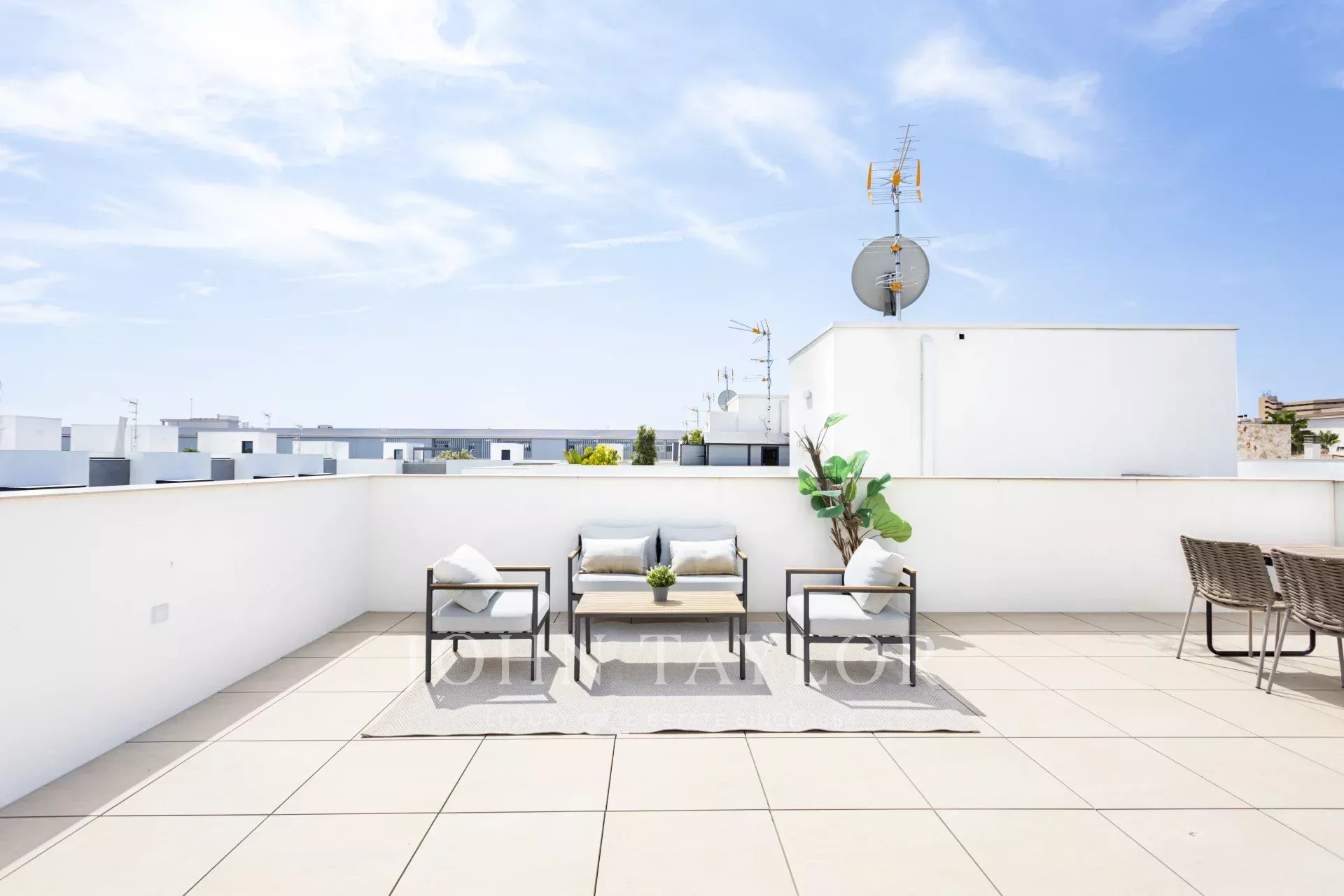 On the rooftop, a chill-out area with a dining table creates the perfect setting to embrace outdoor living, enjoy meals with loved ones, or admire the sunset.