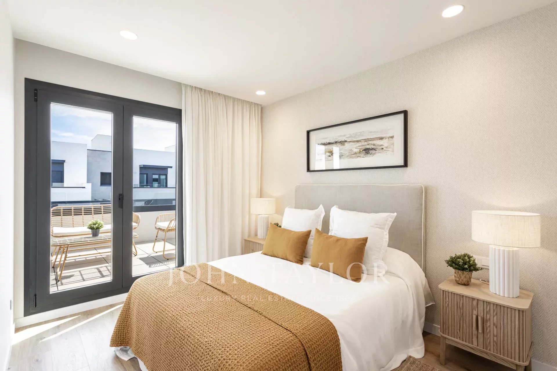 On the upper floor, the master bedroom opens onto a cozy balcony with sofa and table — a private space to unwind or start the day inspired.