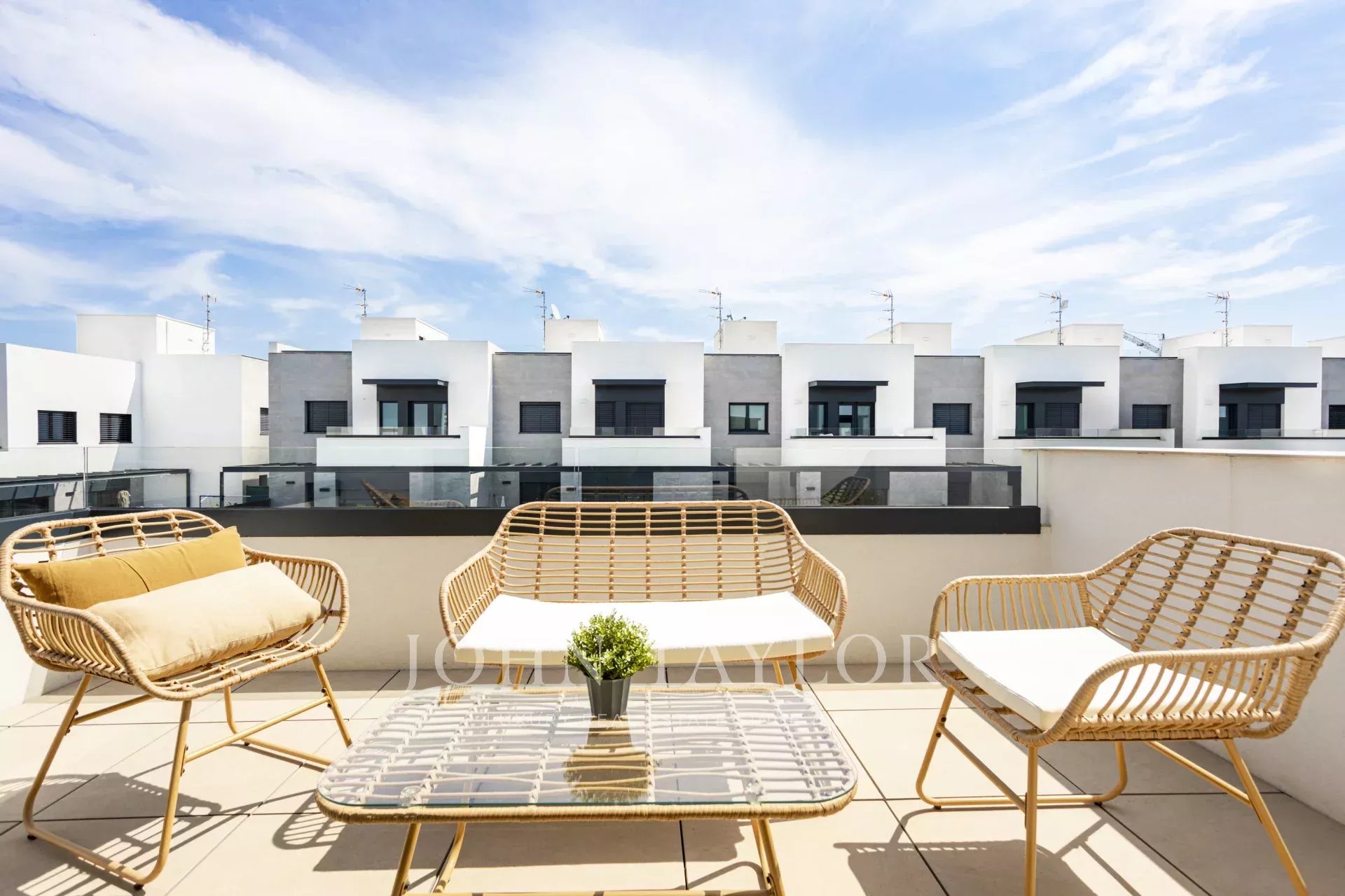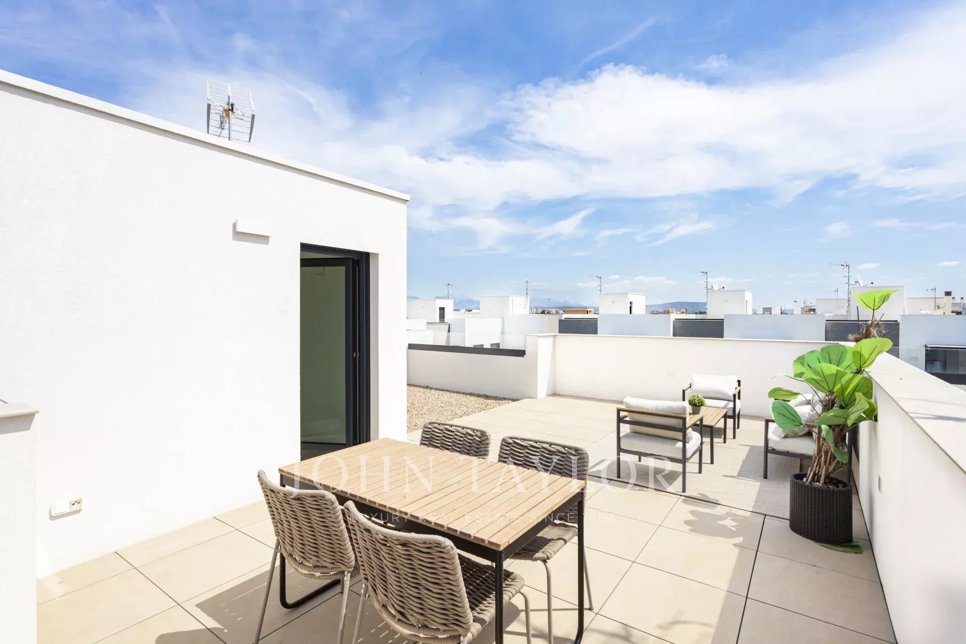 On the rooftop, a chill-out area with dining table is perfect to discover new ways to enjoy outdoor living, share meals with loved ones, or admire the sunset.