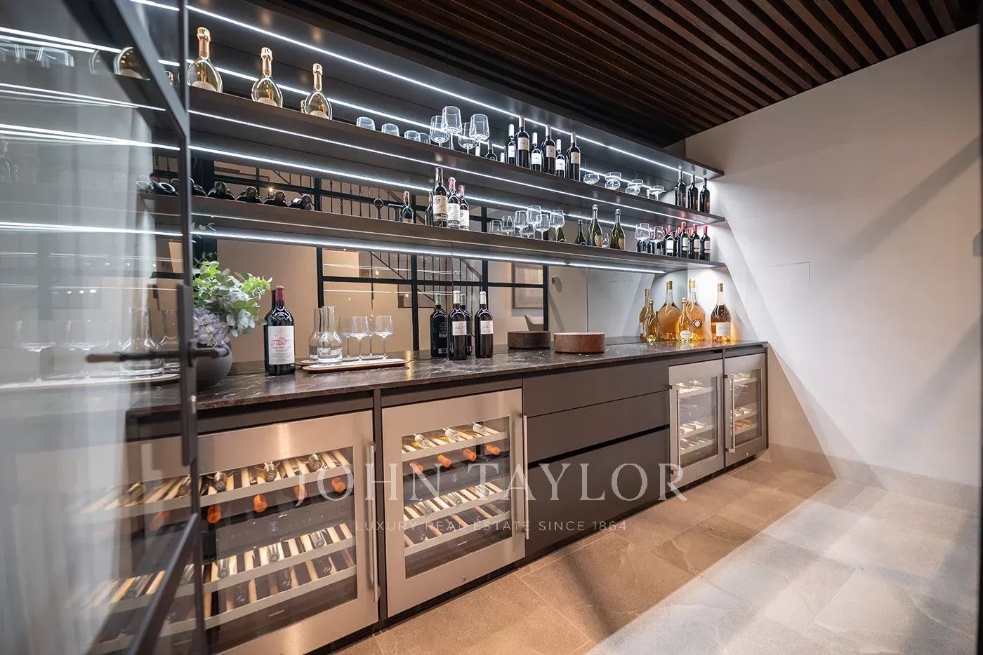 The ground floor welcomes with a welcoming lobby, a representative fireplace, high wooden ceilings, and unique stairs. Also on this floor is a magnificent wine bar, laundry room, and garage parking with plenty of room for cars and bicycles.