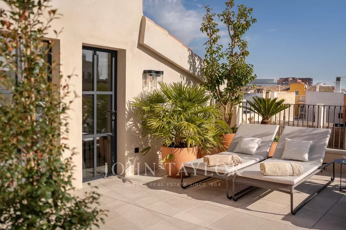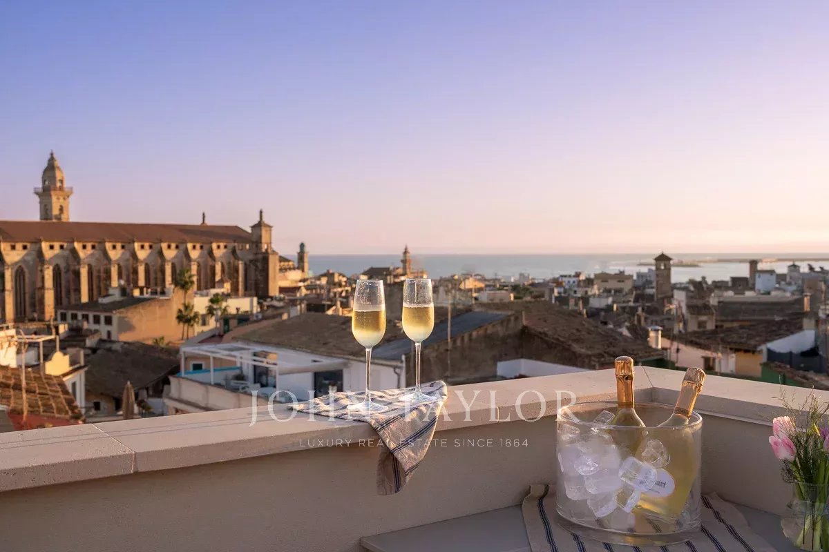 This bespoke design offers a seamless transition from the ground floor to the rooftop terrace, where you can have sweeping views of the Cathedral and the azure Mediterranean as you enjoy the sun on the sunbeds or a meal cooked in the fully furnished outdoor kitchen. At the additional rooftop Champagne bar, you have an undisturbed 360-degree view overlooking everything from Palma Bay to the impressive mountain backdrop. This is truly one of the most spectacular views of Palma Old Town.