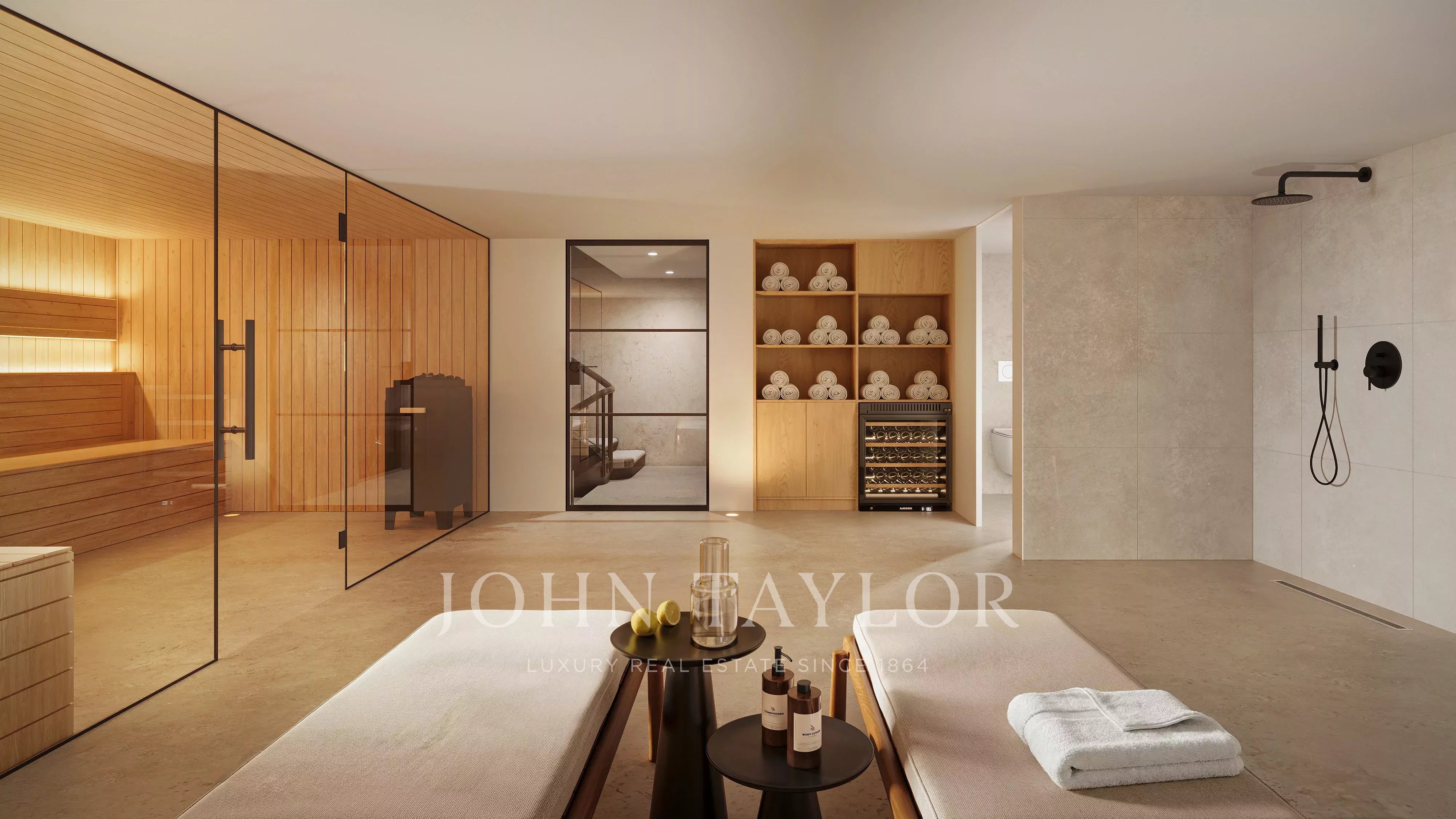 The original restored spiral staircase blends effortlessly into the space, preserving the home’s unique character. Three spacious bedrooms with en-suite bathrooms—plus two additional flexible-use rooms—a separate home office, a private spa area with sauna, a home cinema, a climate-controlled wine cellar, a stylish garage, and an exclusive rooftop terrace create a living experience that is truly unique in Palma’s Old Town.