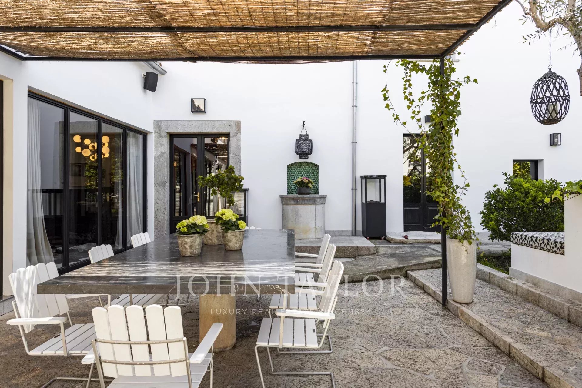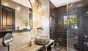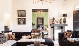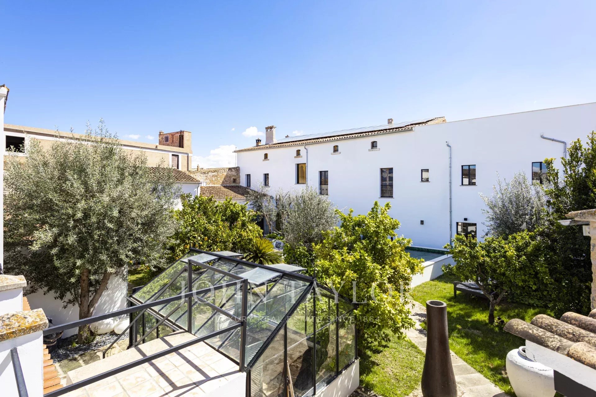 The ground floor leads out to the spectacular private interior patio and additional buildings, such as a private spa with an interior jacuzzi pool, a private wine cellar, a guest apartment, two garages for 10 cars, and an additional room with a bathroom and storage rooms.