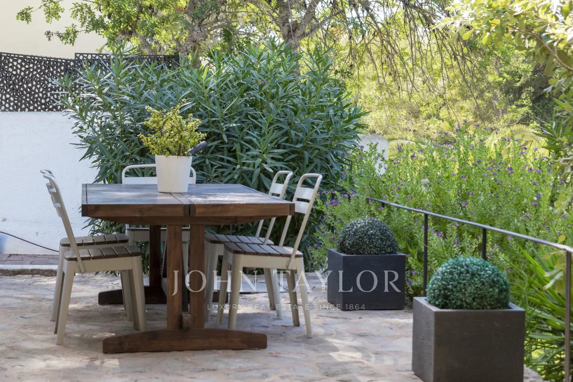 The principal villa, measuring 340 m², welcomes you with a luminous living room featuring a striking fireplace and expansive windows that open onto the manicured gardens. The recently renovated kitchen seamlessly blends style and functionality, with a spacious dining area and direct access to a large terrace with barbecue — perfect for entertaining and al fresco dining. On the ground floor, there is a generous suite with en-suite bathroom and office space, easily adaptable into a guest suite, along with two further bedrooms sharing a bathroom, a laundry room, and a guest WC. Upstairs, the master suite offers a walk-in wardrobe, private bathroom, and a large terrace with sweeping mountain views. Every detail is designed for year-round living, including underfloor heating and double-glazed windows. Various terraces and chill-out spaces lead to the enchanting pool area, surrounded by lush Mediterranean landscaping that ensures complete privacy.