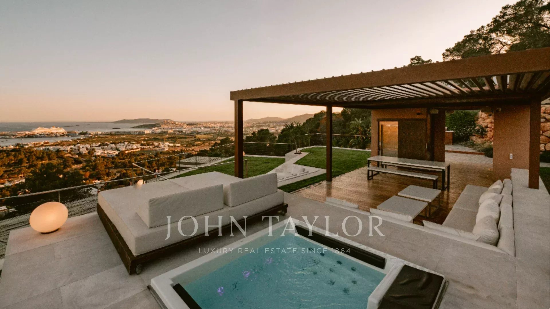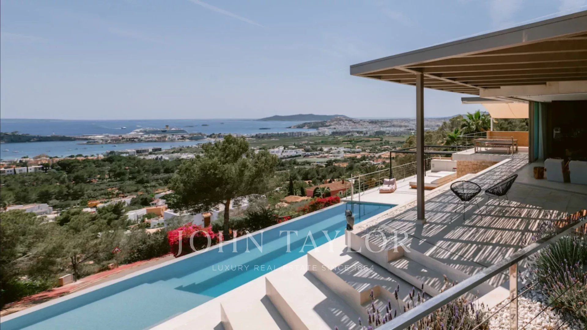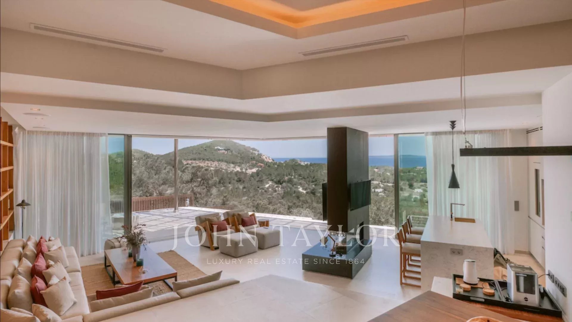 With natural stone walls and warm wooden accents, the villa exudes a cozy yet sophisticated ambiance. Stunning panoramic views of the azure Mediterranean Sea, the historic old town of Dalt Vila, and the idyllic island of Formentera can be enjoyed from nearly every corner of the house.
