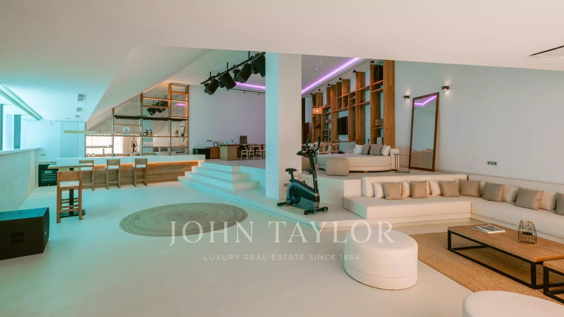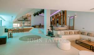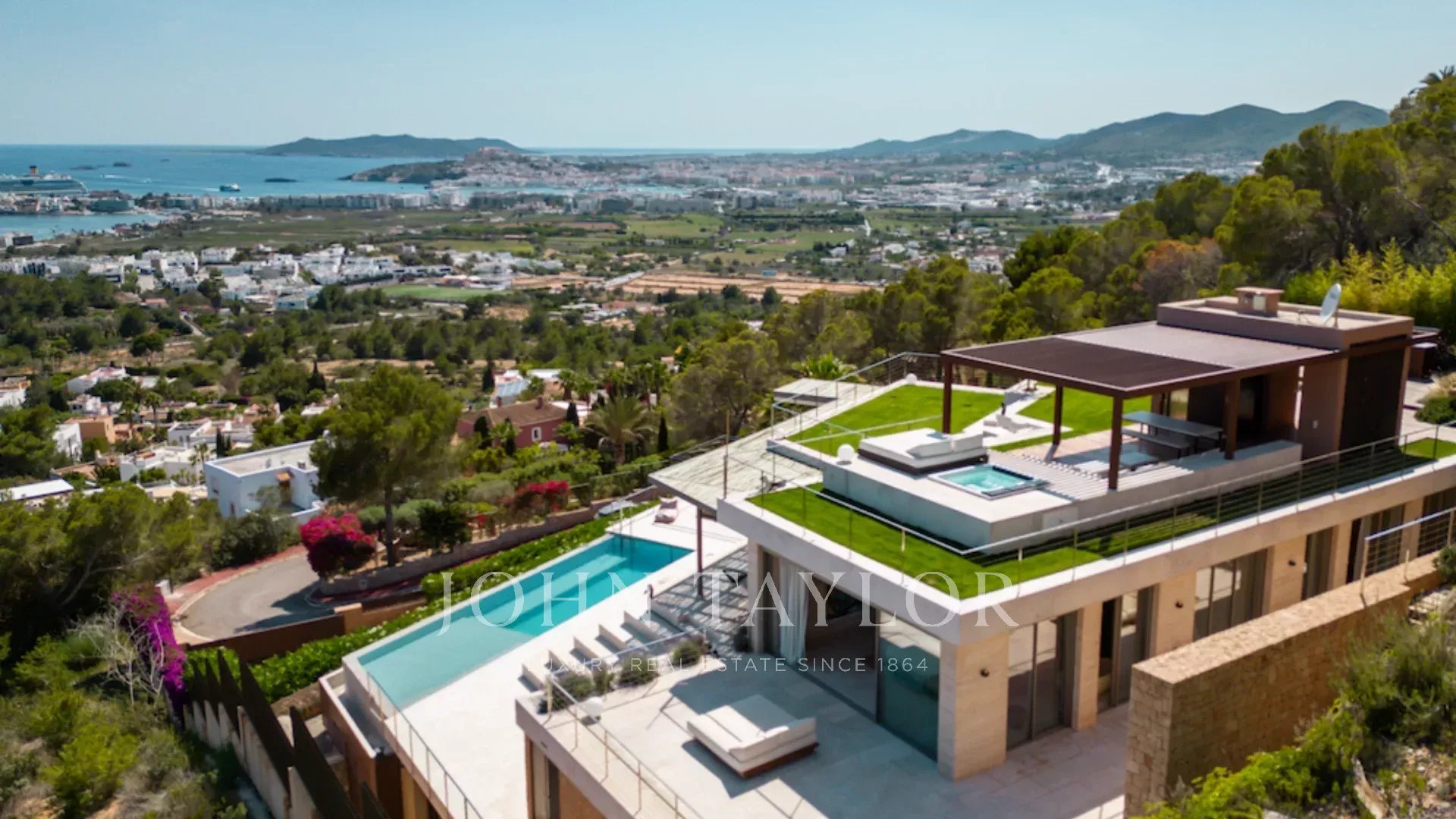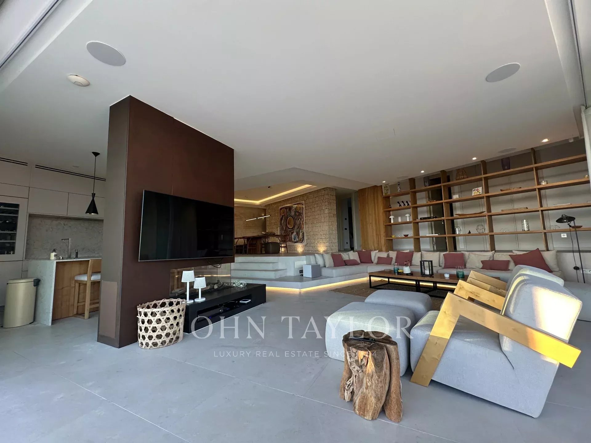 With natural stone walls and warm wooden accents, the villa exudes a cozy yet sophisticated ambiance. Stunning panoramic views of the azure Mediterranean Sea, the historic old town of Dalt Vila, and the idyllic island of Formentera can be enjoyed from nearly every corner of the house.