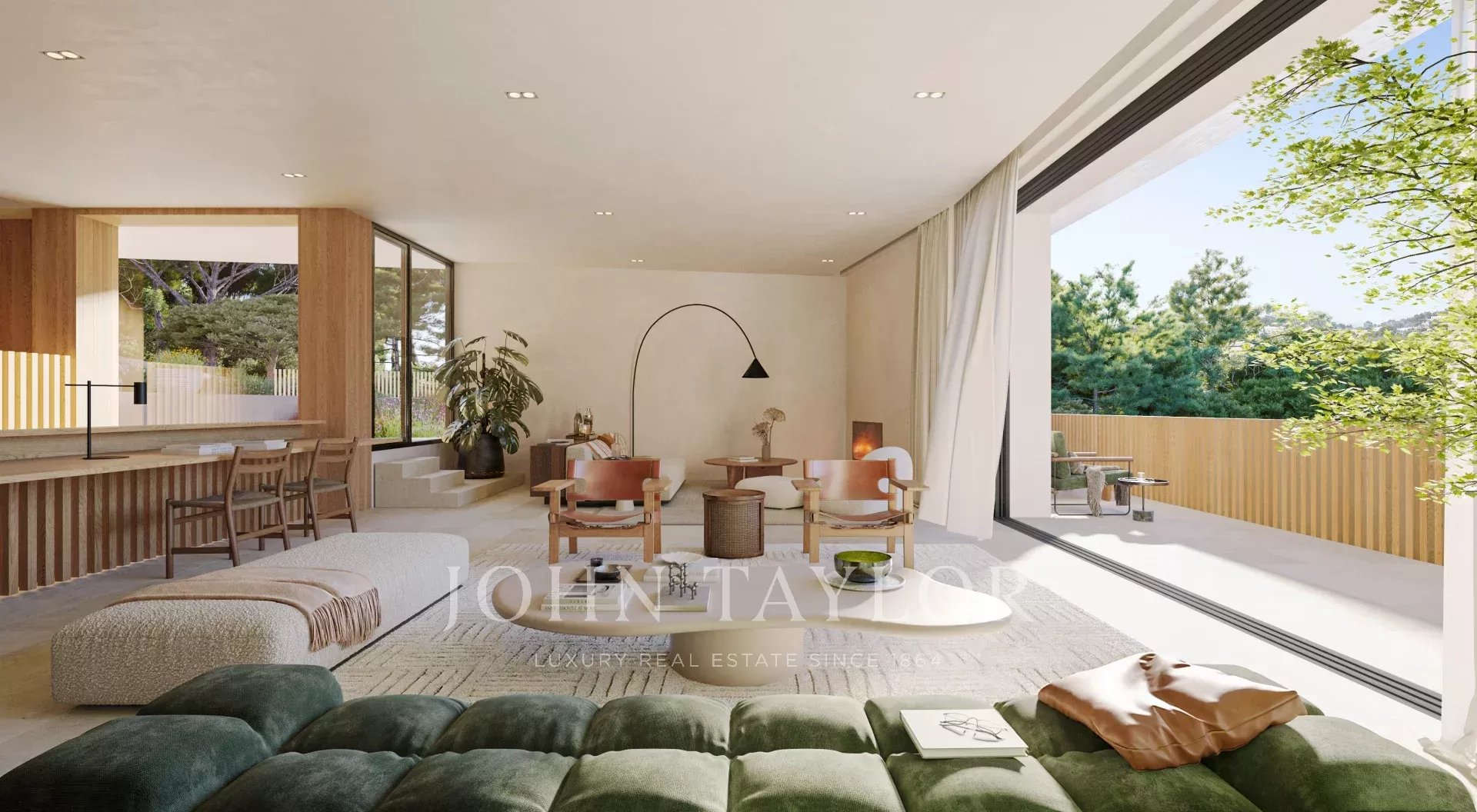 From the main floor, a staircase leads to three en-suite bedrooms on the upper floor, including a stunning master suite with open views. At the top, a green rooftop enhances the connection with nature. Natural materials like wood and landscaping integrate the villa into its forested surroundings, while high-end interiors create a warm and contemporary atmosphere.