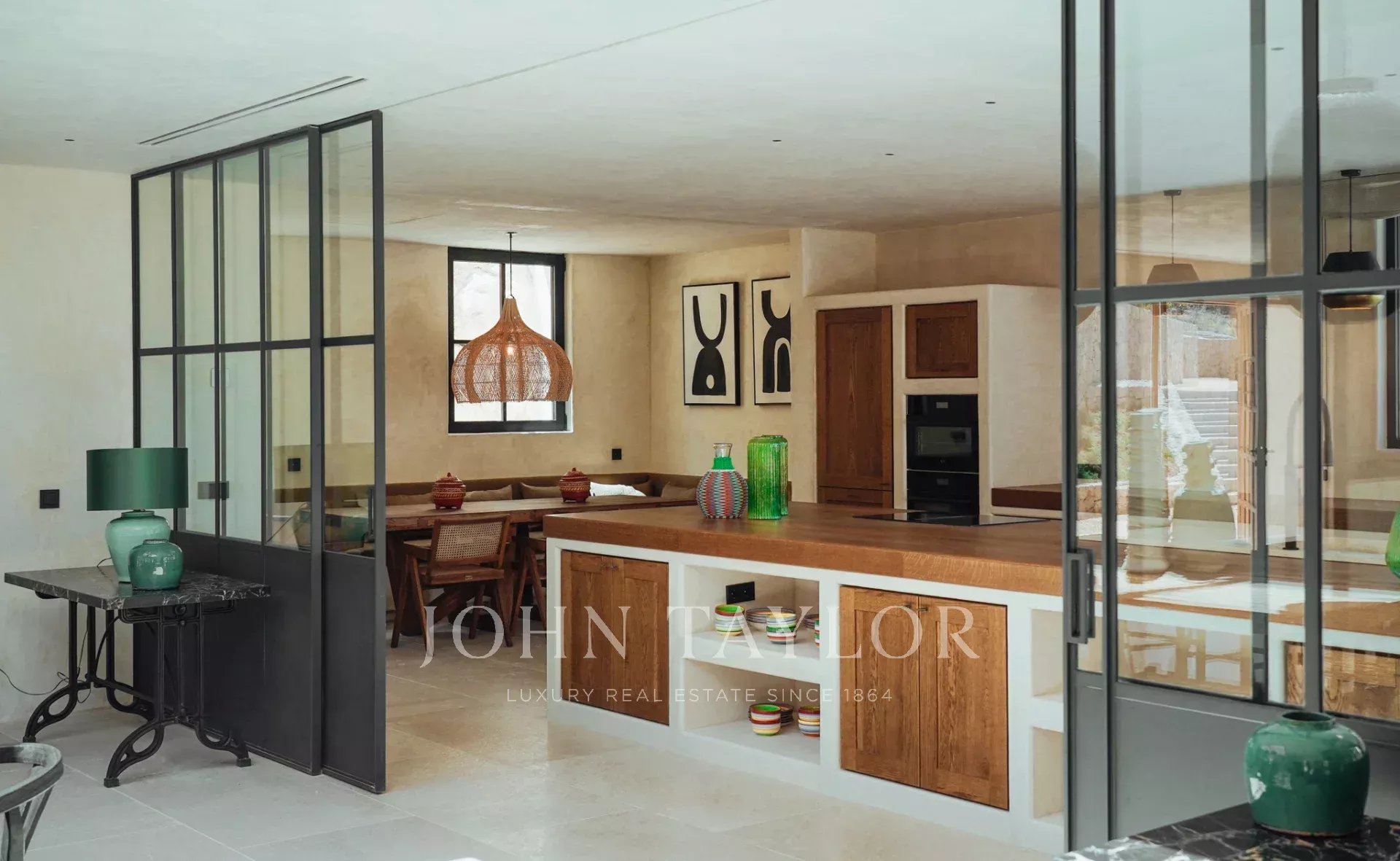 The spacious kitchen can be completely closed off to be soundproofed with special sliding glass doors.