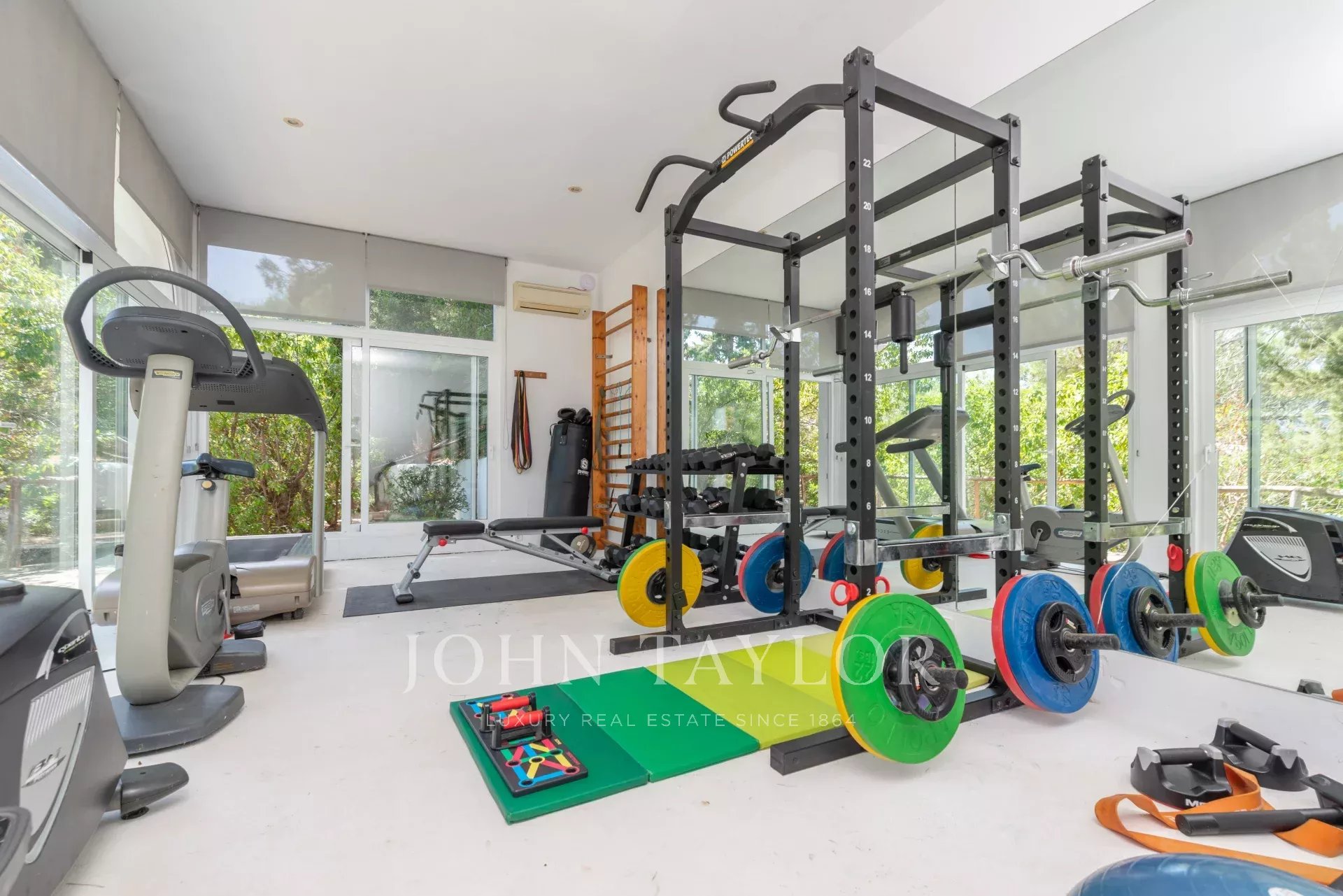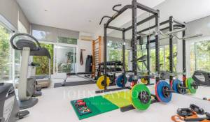 The property also includes a large 162 m² garage with space for up to six vehicles, as well as a state-of-the-art fitness studio equipped with Technogym and stunning sea views. Additional amenities include air conditioning, electric heating, high-speed internet, IPTV, SONOS sound system, laundry room, and outdoor lighting with over 350 lamps.