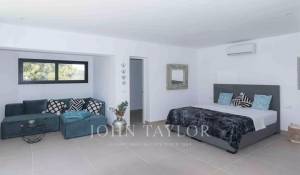 The main house, erected in 1978, features an appealing tower housing the master bedroom with an en suite bathroom. A generous terrace adjacent to the master bedroom provides a splendid view of the sea and nearby islands. Two additional bedrooms, a spacious living room, and a dining room complete the main house.