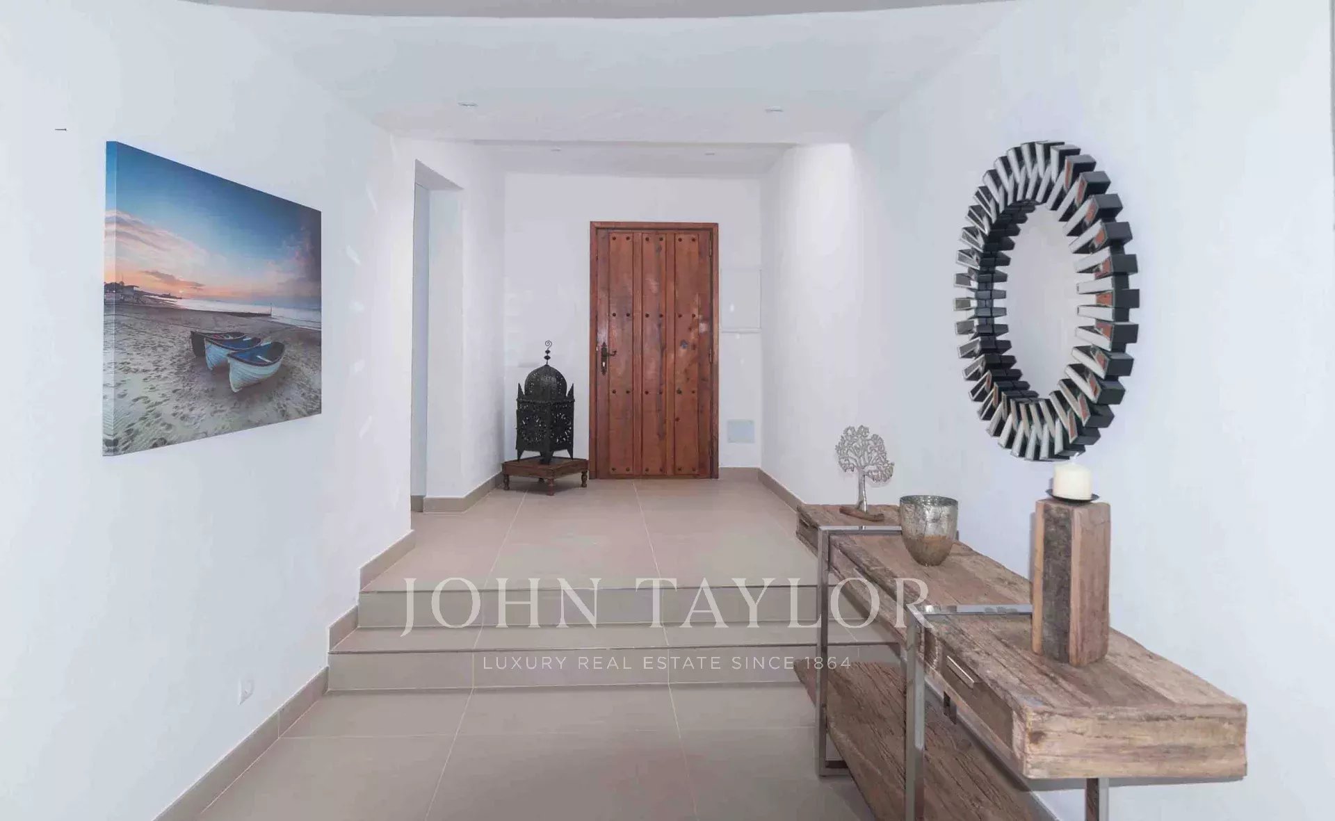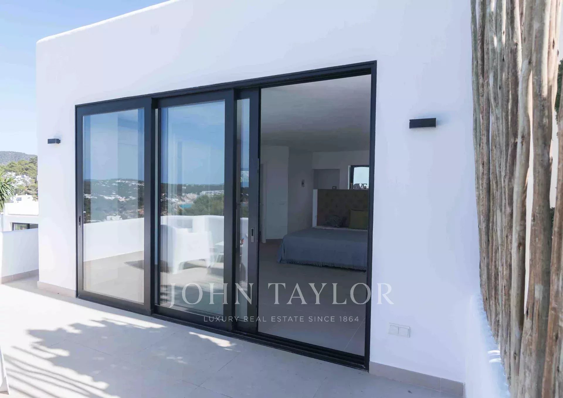 The outdoor area encompasses various terraces covering 640 m2 of tiled surfaces. The central cluster of old trees encloses an outdoor hot water shower, imparting a sense of freedom. From the elevated infinity pool, one can relish spectacular views of Cala Tarida, surrounded by inviting outdoor spaces for sunbathing, sitting, and relaxation.