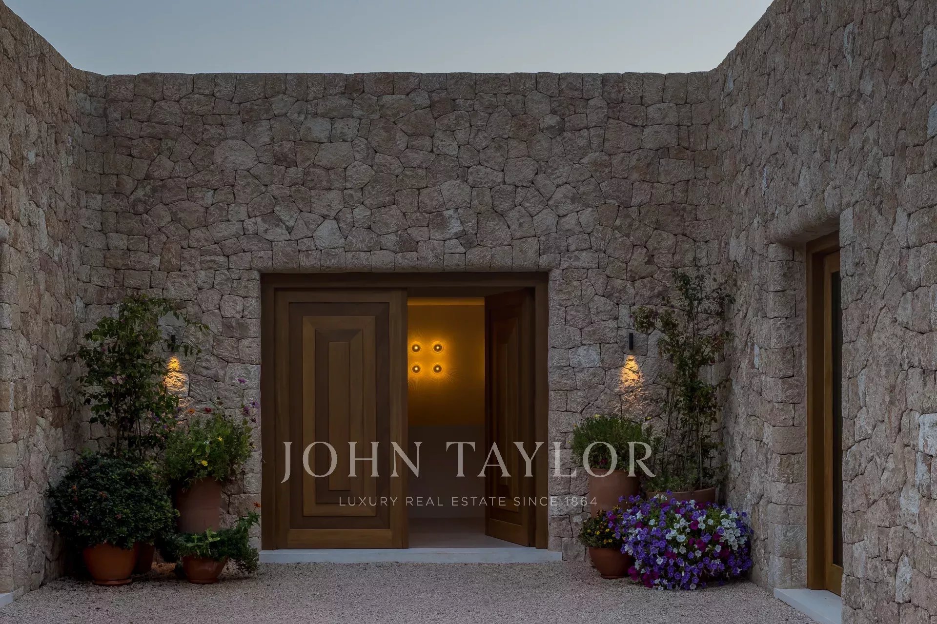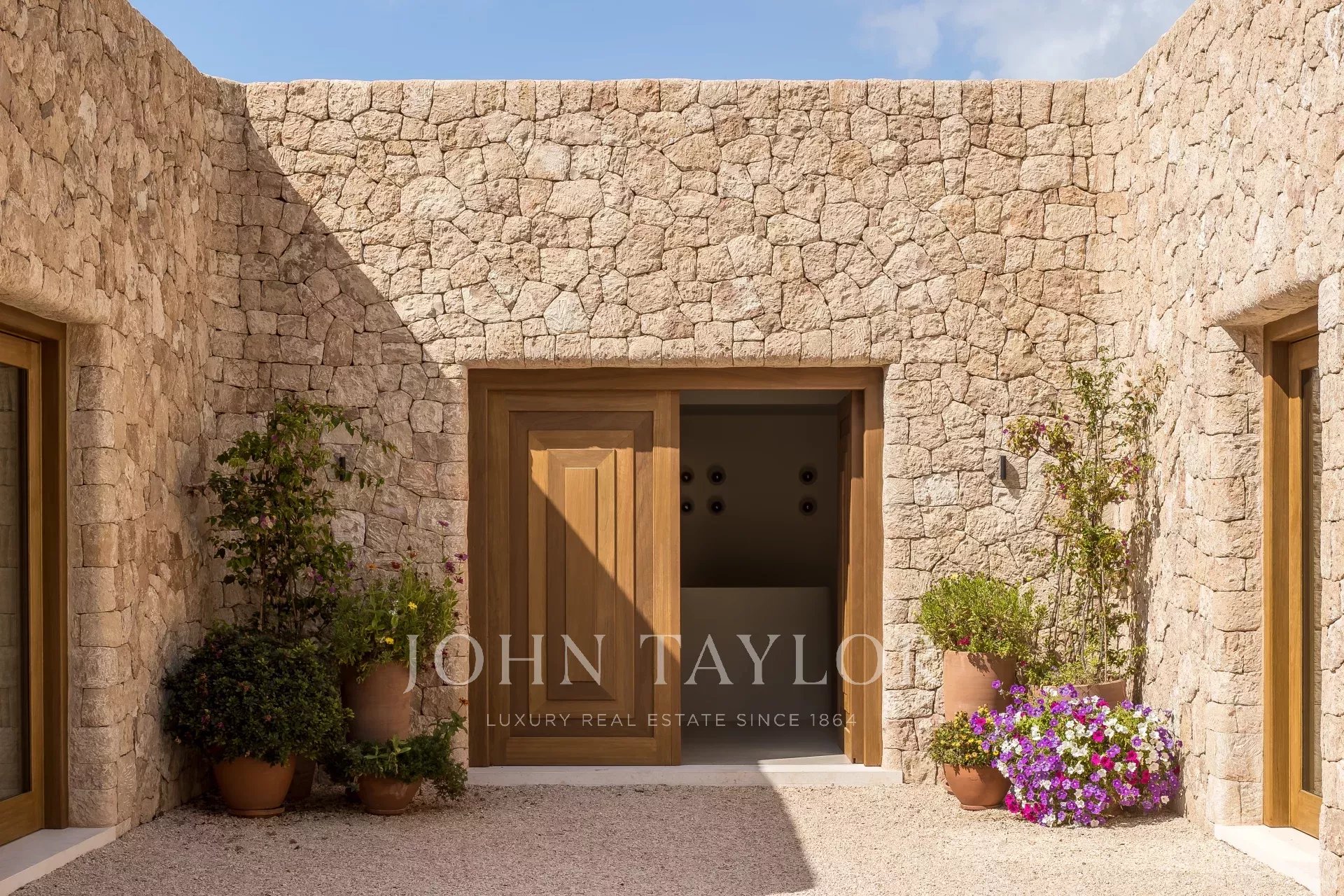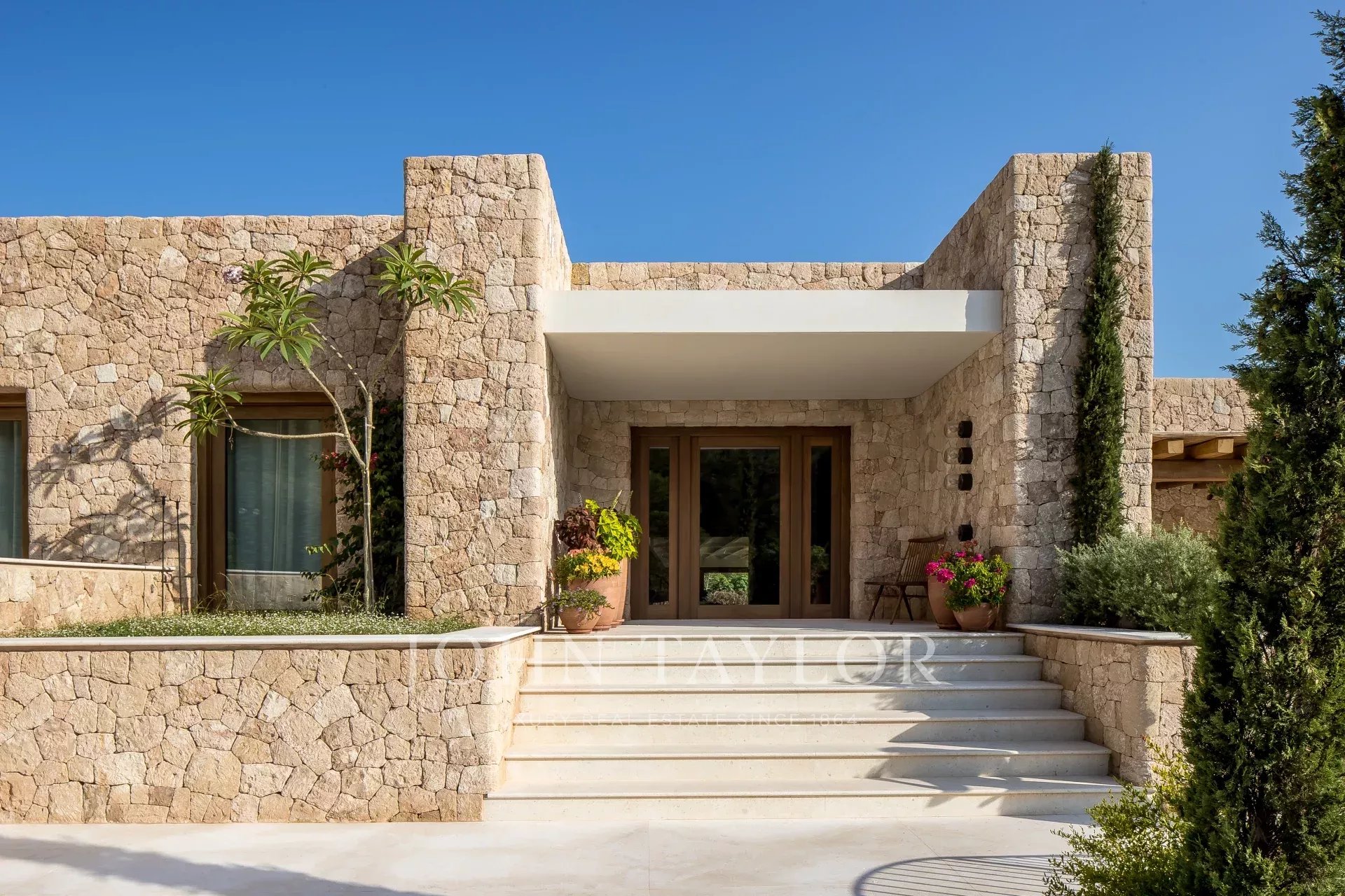 Just a few steps from Cala Mastella and close to the traditional village of San Carlos, this house is set on a large plot of land with distant sea views. The property is in perfect harmony with the surrounding landscape. The way the house has been built, using traditional design and architecture with a subtle blend of contemporary elements, is truly unique.
