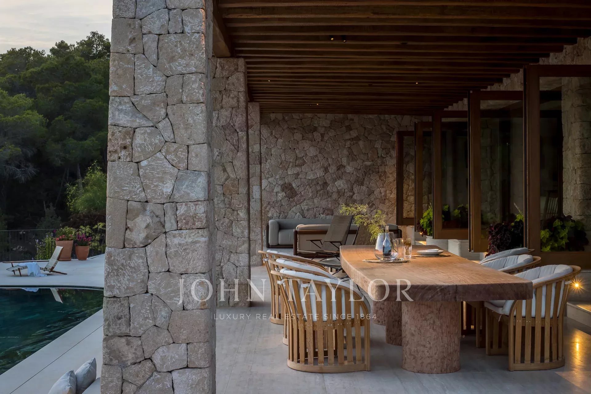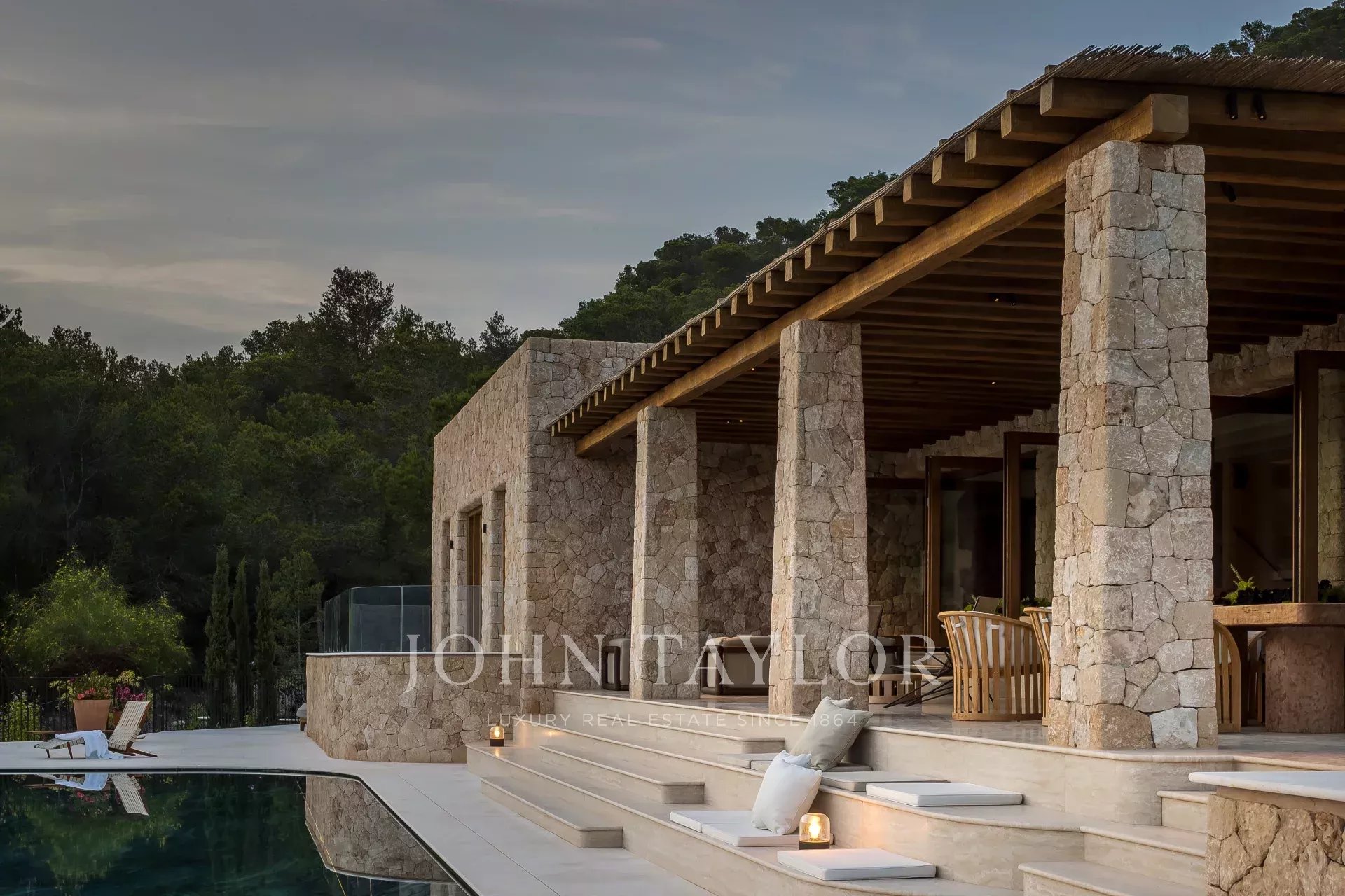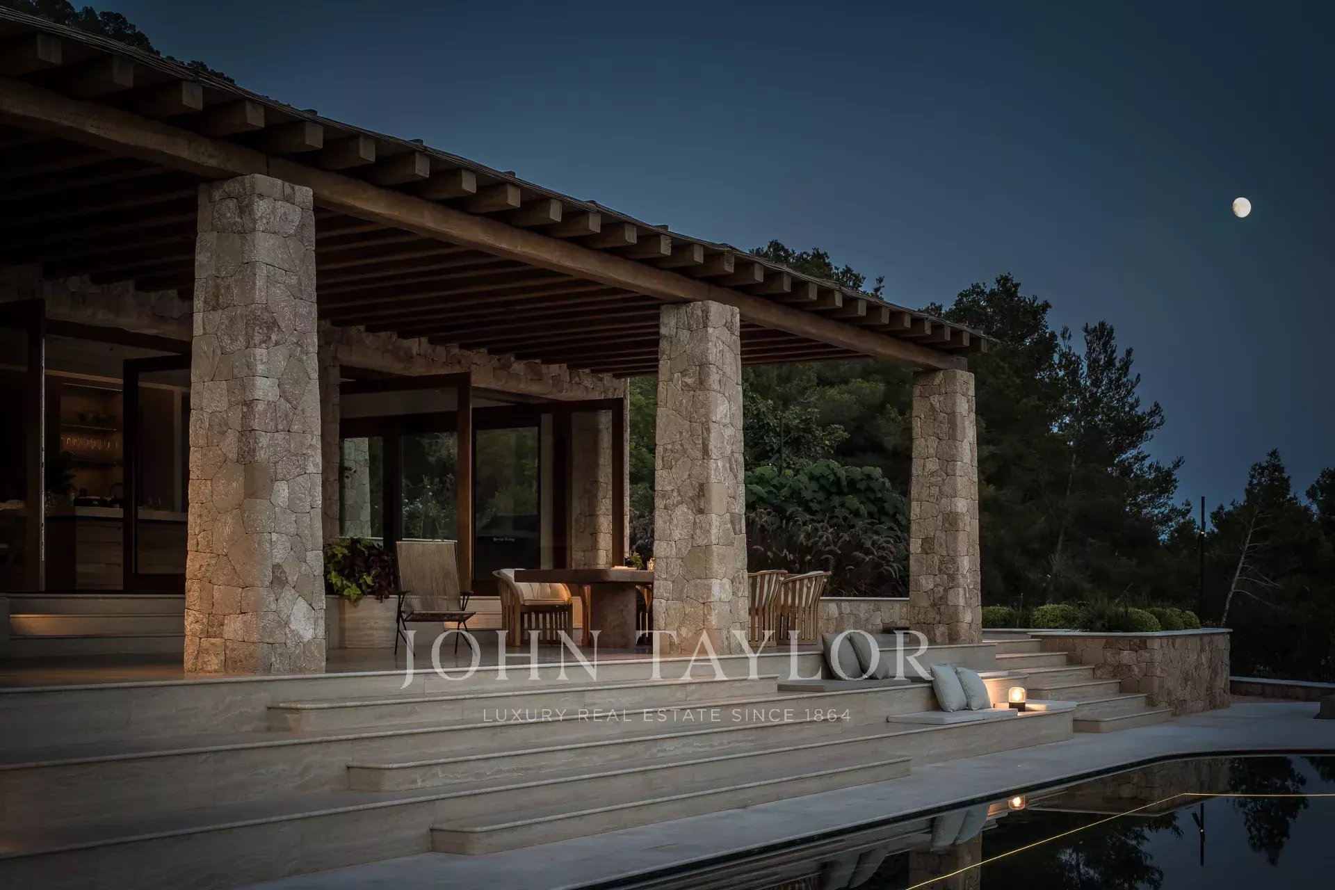Large automatic glass doors open to the terrace, which provides ample space for a chill-out area as well as an outdoor dining area. The steps leading from the terrace to the pool are carefully designed to offer another place to sit or lounge and enjoy the Ibizan sun beside the striking heated pool made of Lapponia Verde marble. A complete sound system provides the perfect musical experience inside and outside the house.