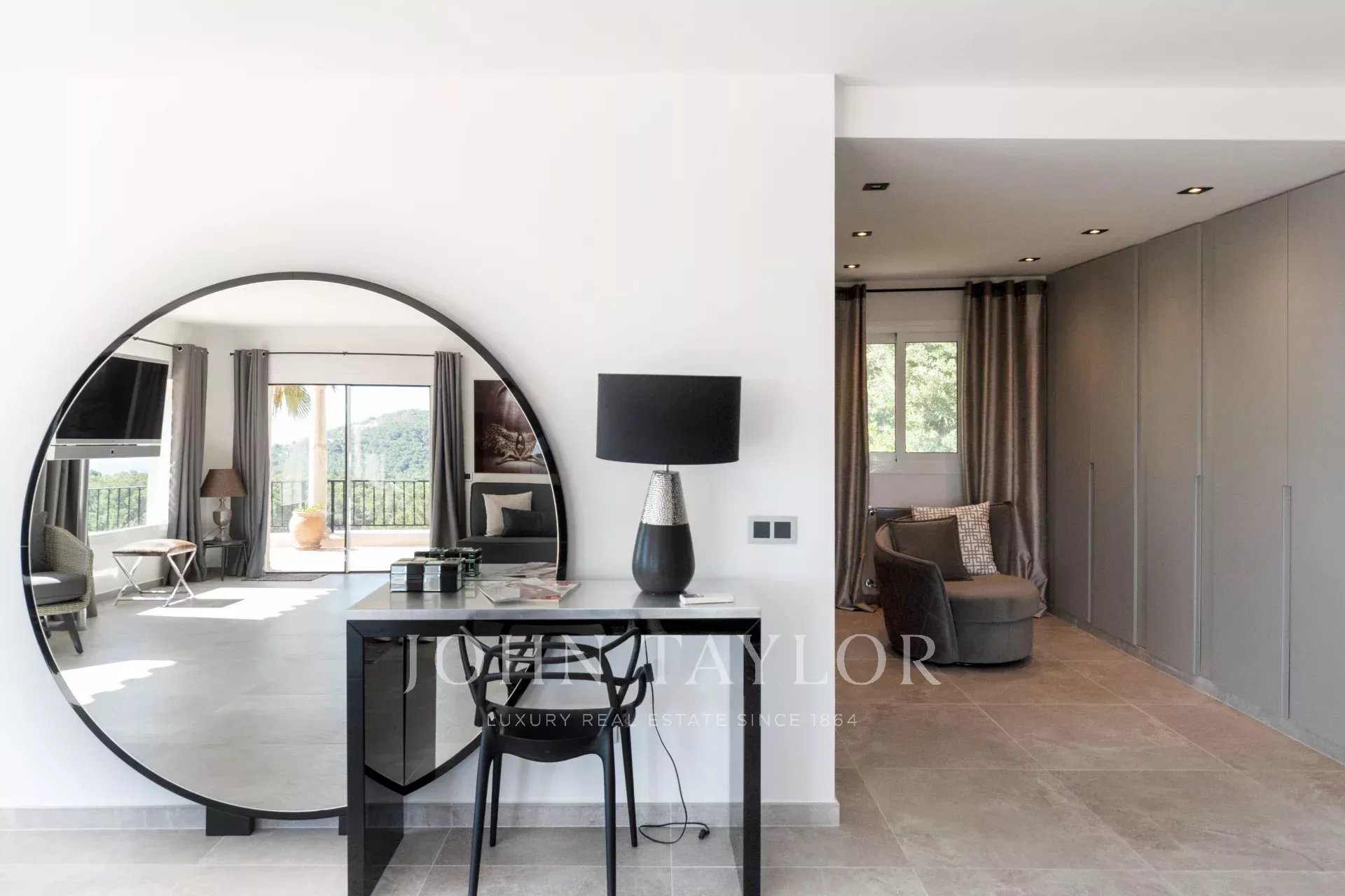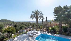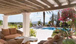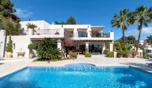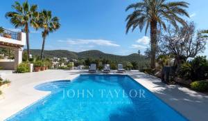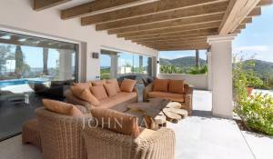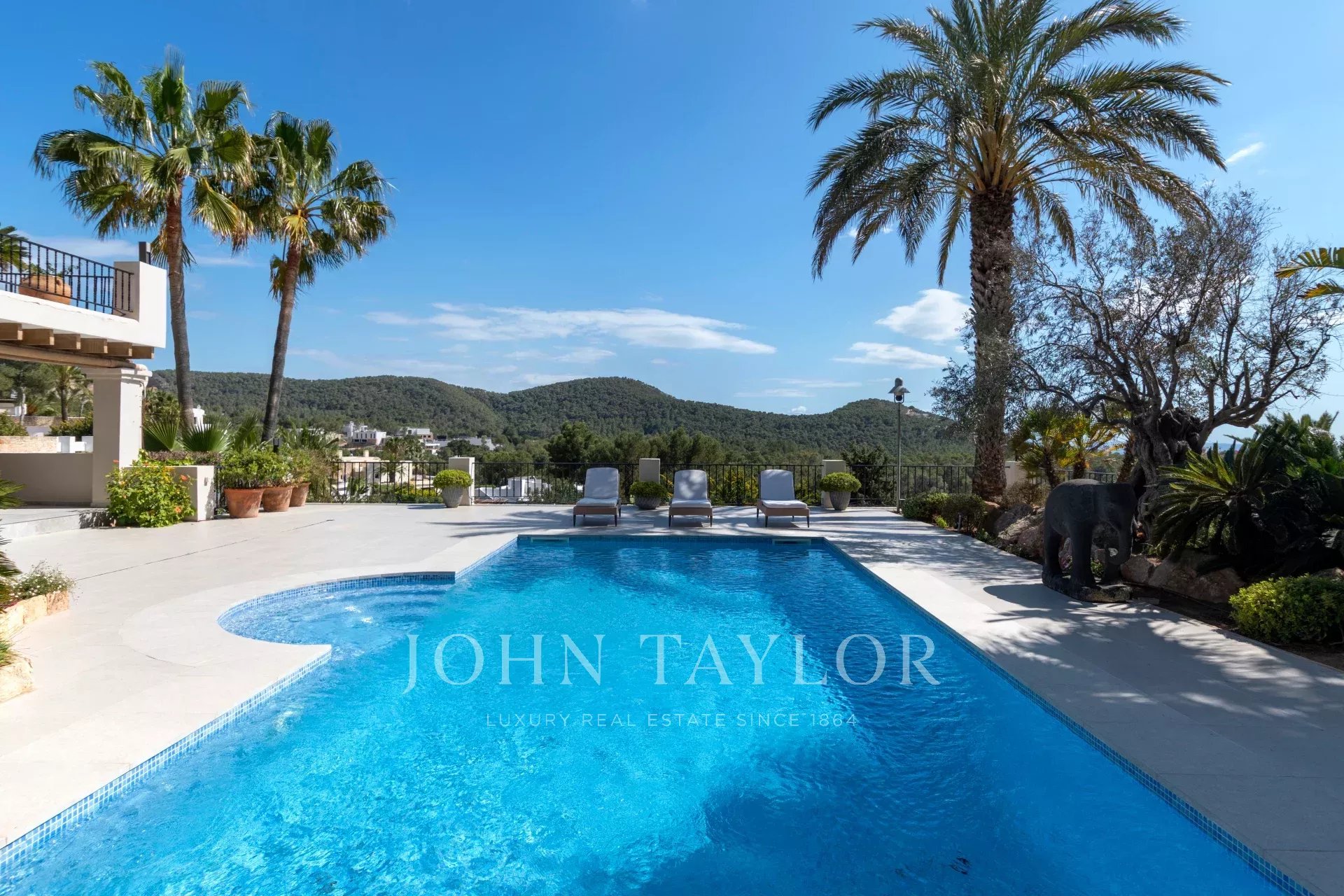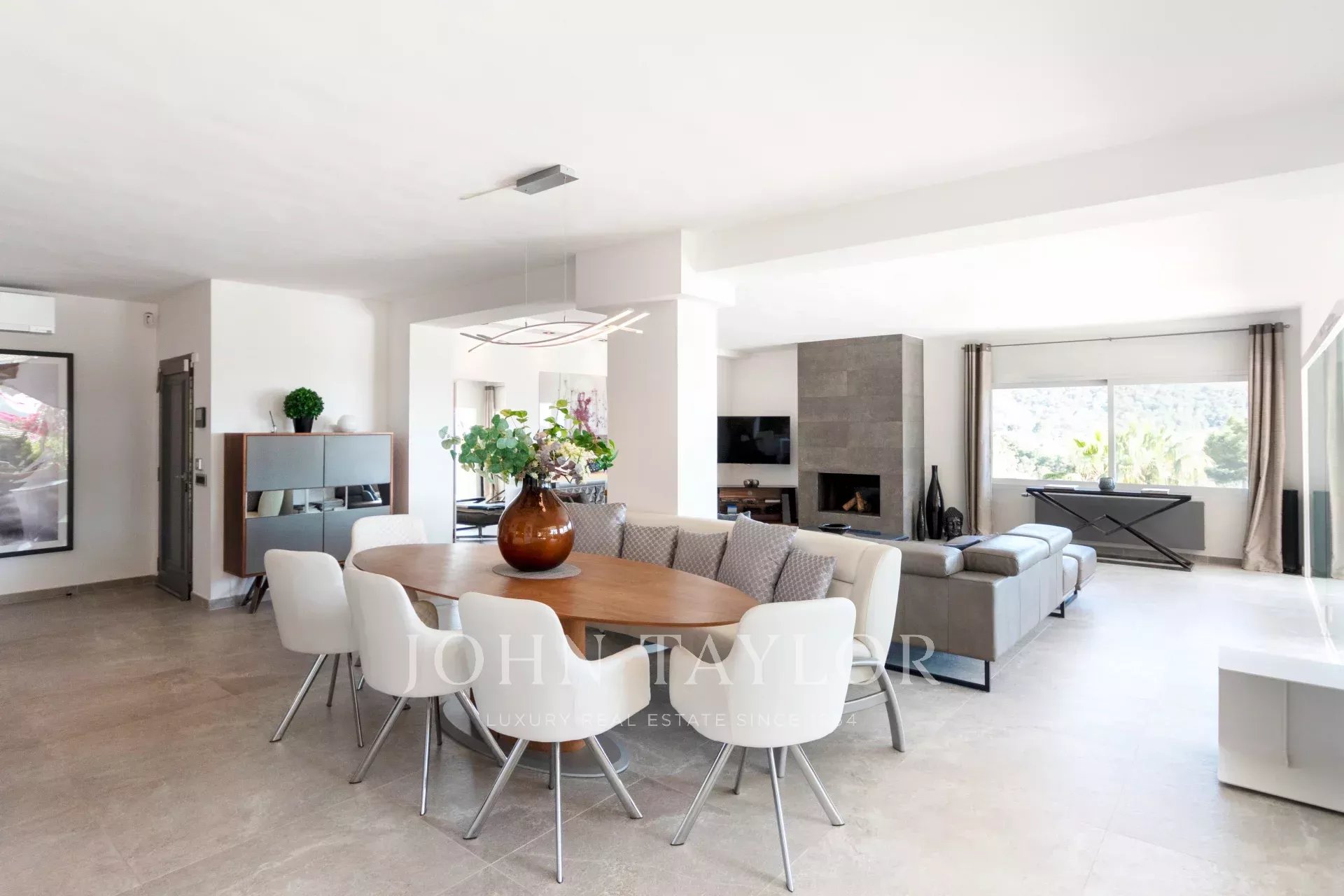 The spacious living-dining room provides access to a large terrace with swimming pool, as well as stunning views of the mountains and Ibiza. The open-plan but discreetly located kitchen adds a modern and functional touch to the space.