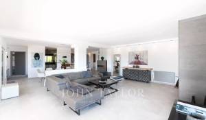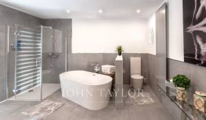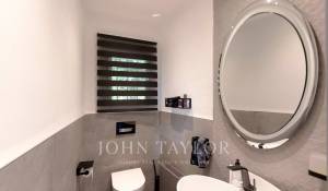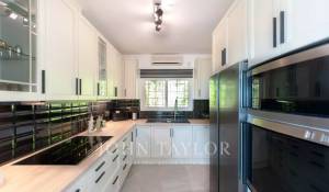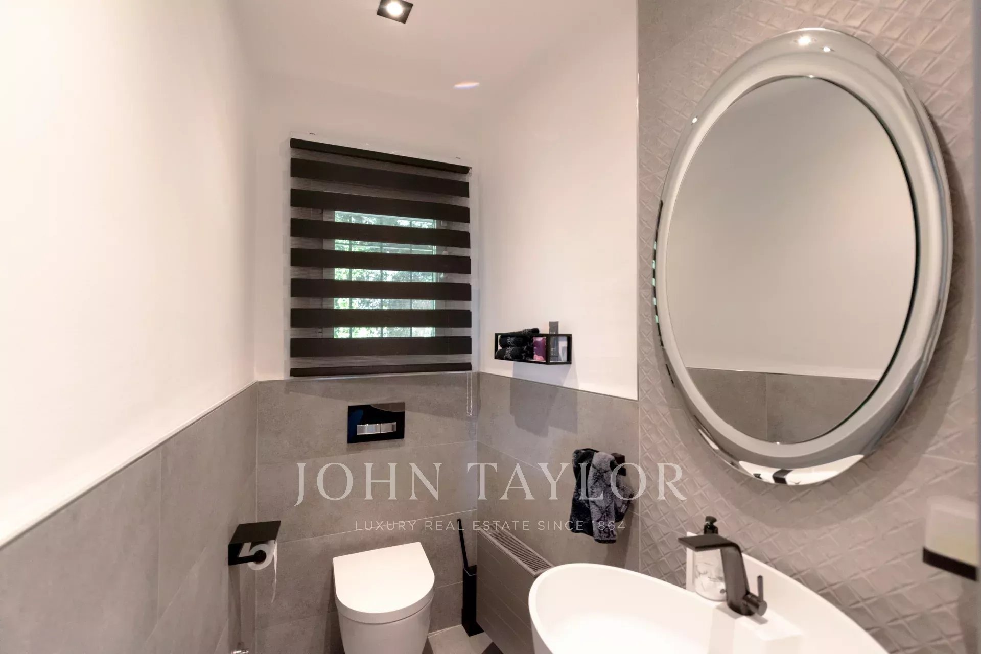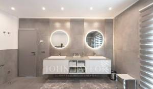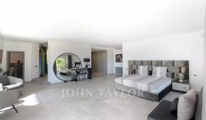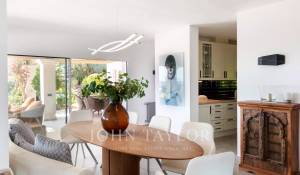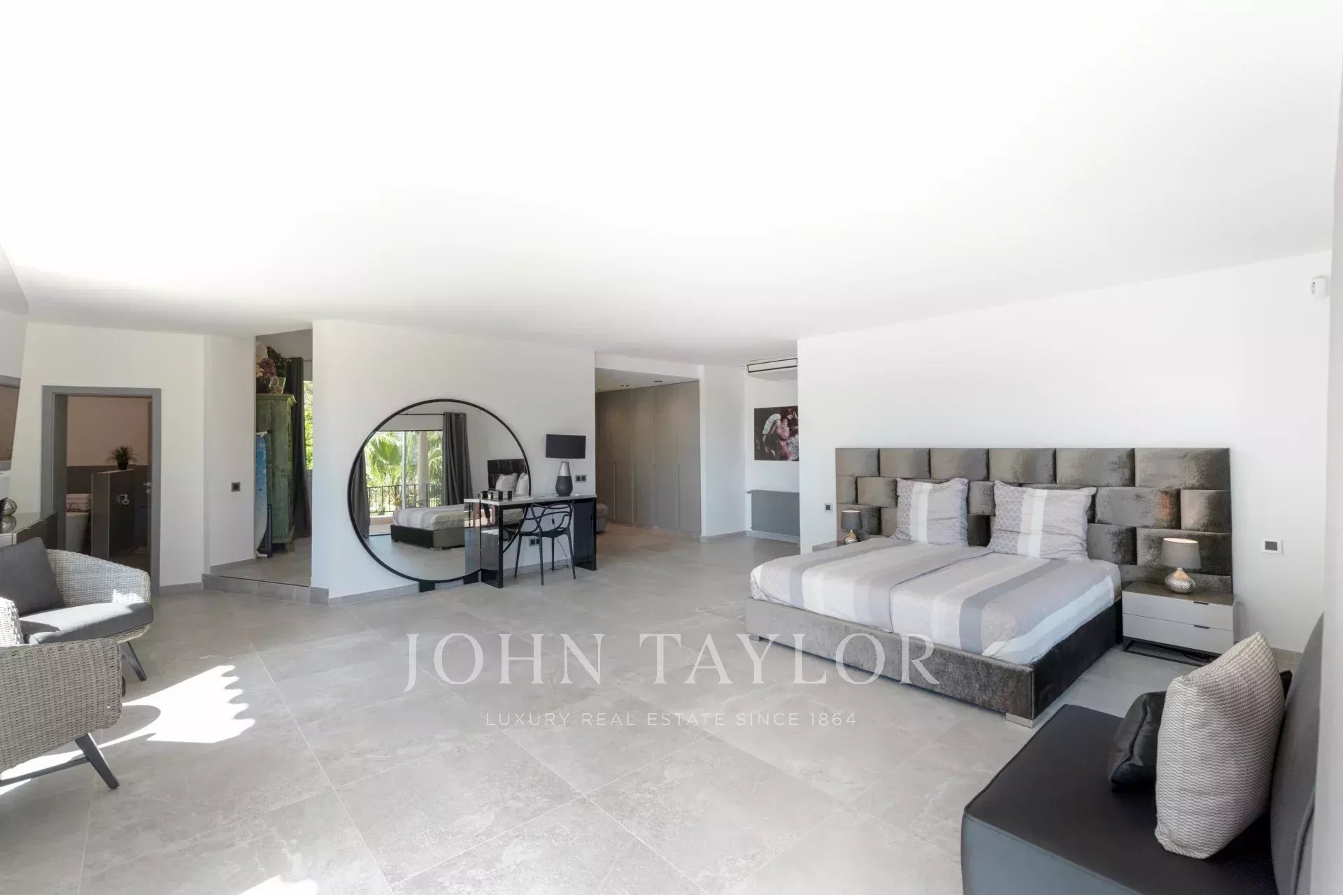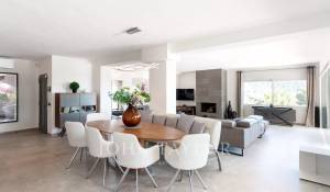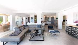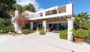 The spacious living-dining room provides access to a large terrace with swimming pool, as well as stunning views of the mountains and Ibiza. The open-plan but discreetly located kitchen adds a modern and functional touch to the space.