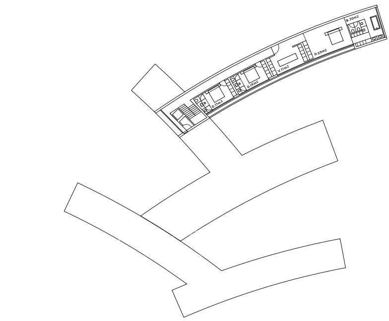 The night area of this villa is located in the solid volume at the level of the second floor. A circulation along the volume connects the rooms that have elevated views over the plot through a discreet longitudinal opening.