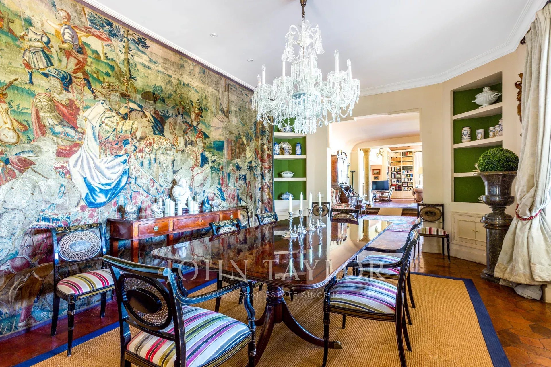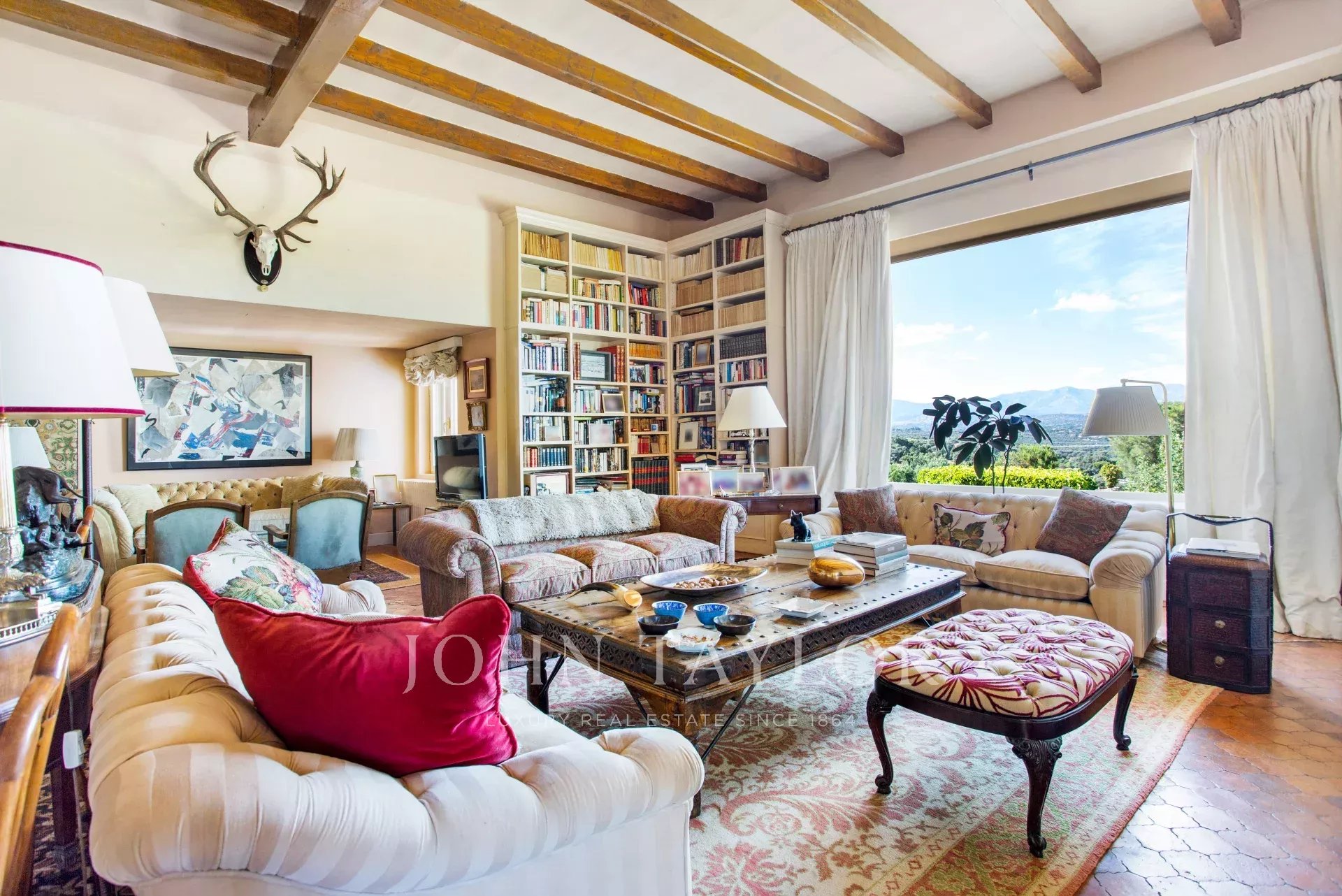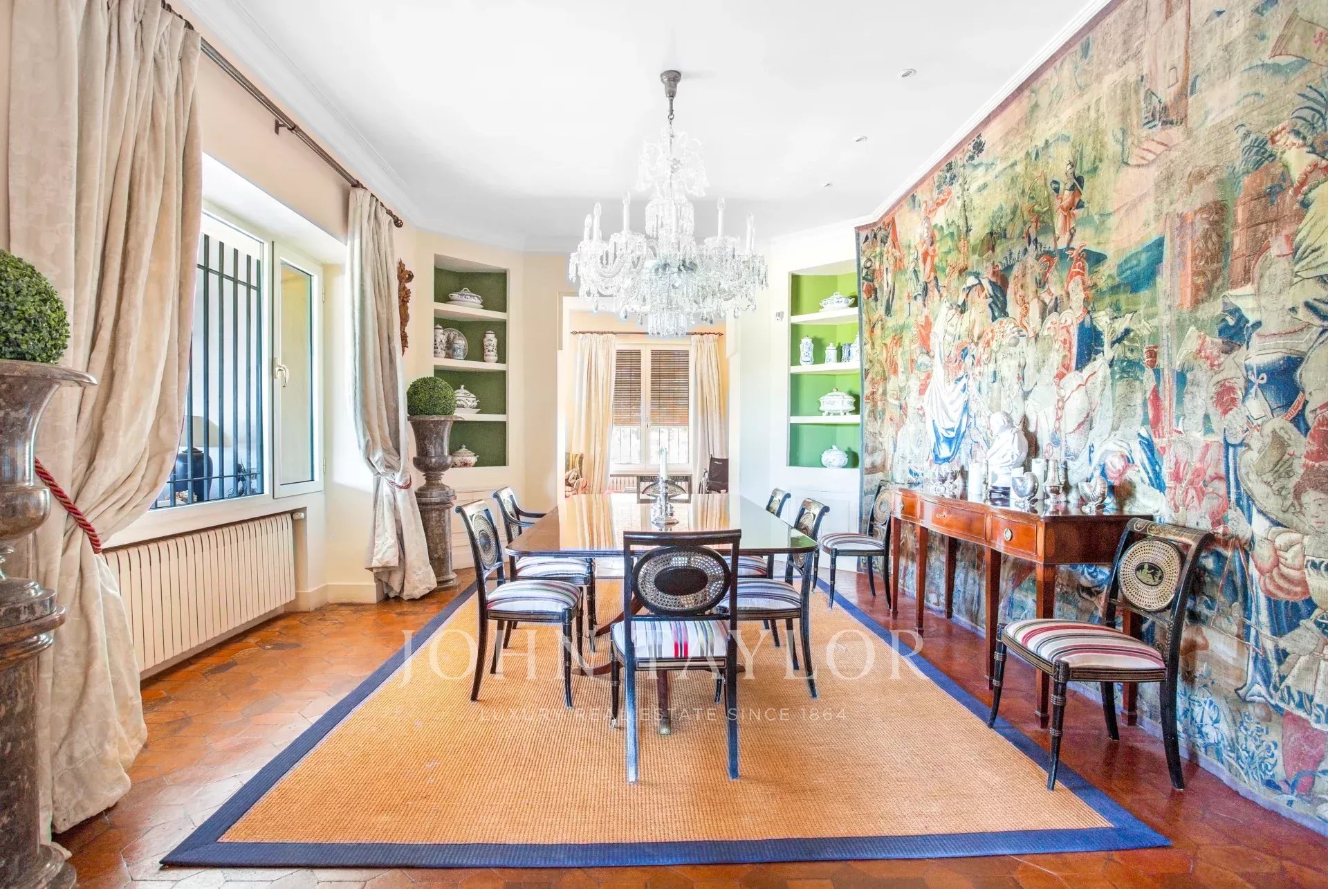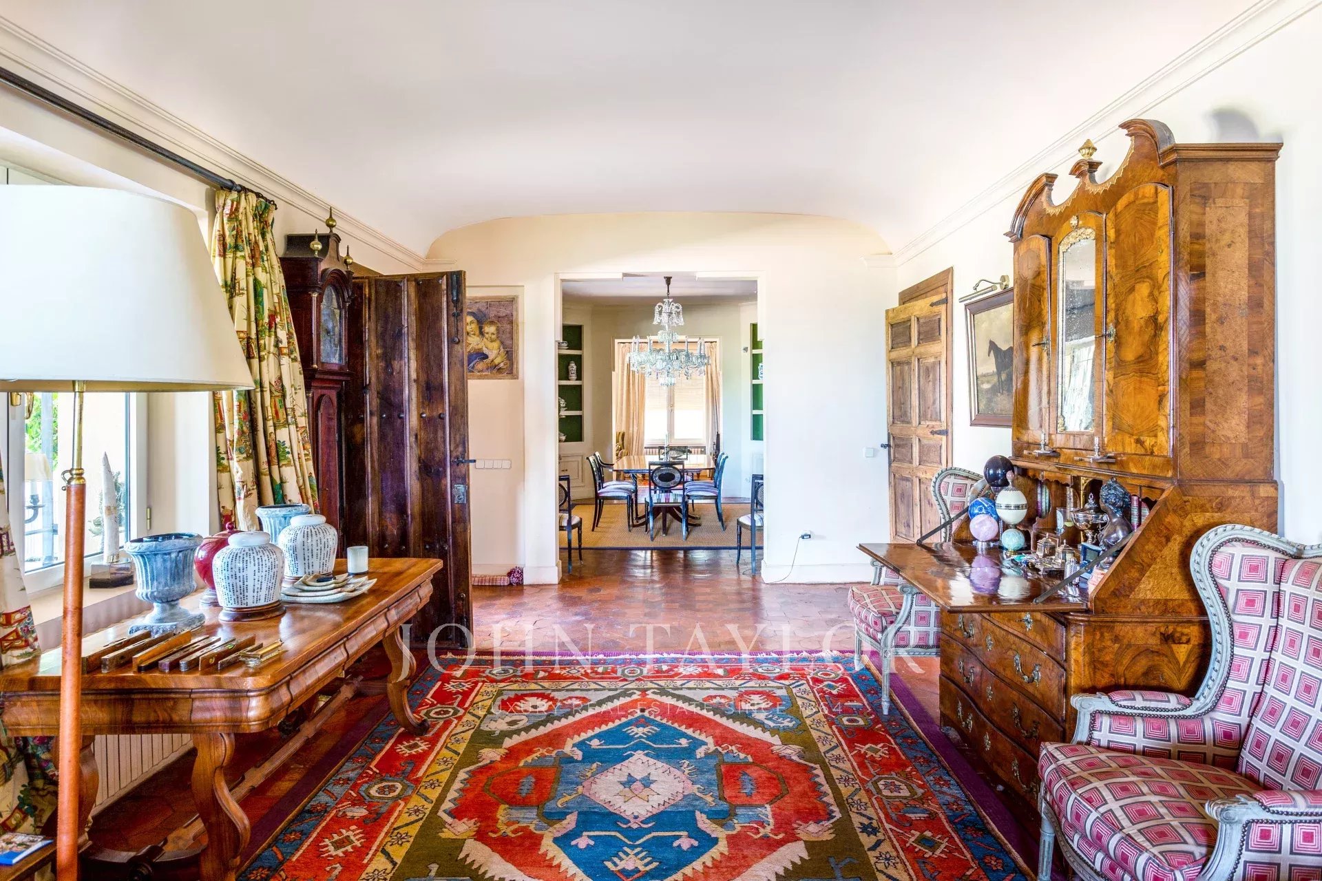 Main house: Upon entering the property, we are greeted by a fabulous porch that invites you to rest, peace and tranquility, undoubtedly one of the most desired places in the house for its orientation, its freshness and the sound of water falling into the fountain located in the garden. We access the interior of the house, through a welcoming hall that leads to the living room (90m²) with fireplace distributed in several rooms. This bright and intimate area is equipped with large windows that flood the room with light and offer unbeatable views. In the opposite area we find a dining area (20m²) that leads to the living room (35m²) also with fireplace. The sleeping area consists of five large bedrooms all with en suite bathrooms. The master bedroom has a separate dressing room. The kitchen area is distributed in office area, kitchen, technical room, and service bedroom with bathroom. From this area we can access the garden areas of the property.