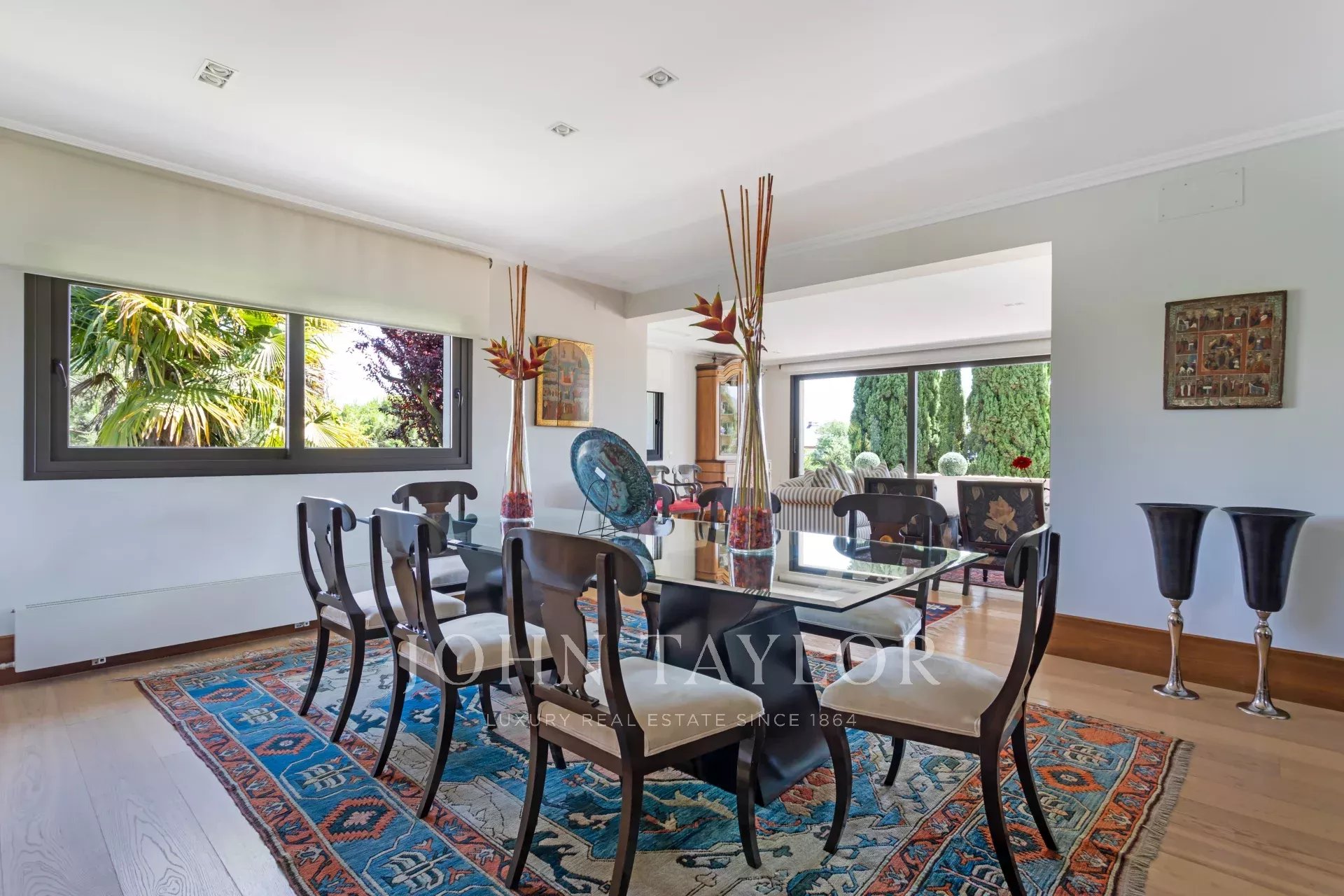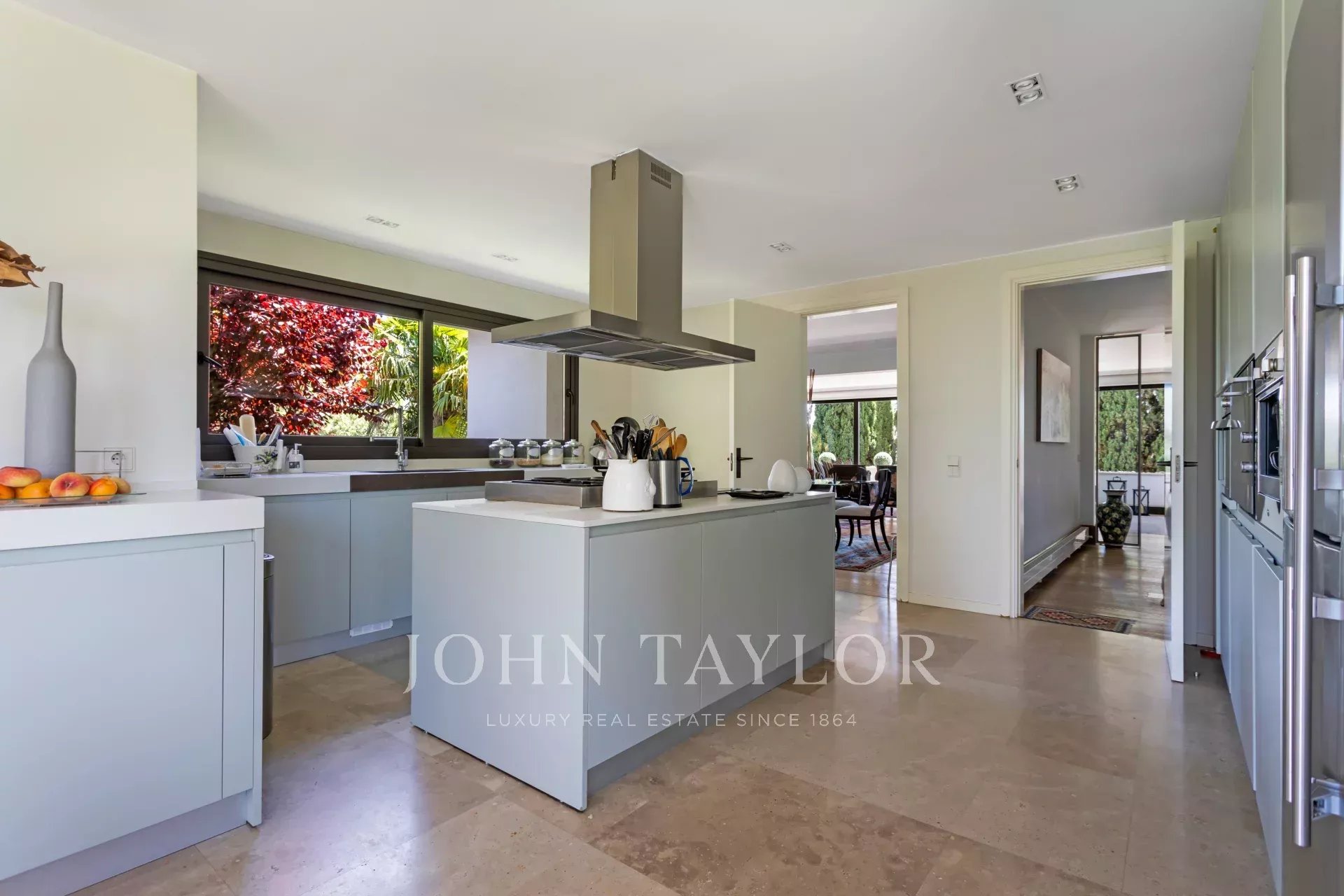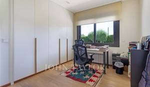 On the main floor, a magnificent hall offers an open layout that connects both the private and common areas of the house. The living room, spacious and welcoming, is designed to be a multifunctional space, ideal for relaxing or entertaining. The dining room, elegantly decorated, has enough space for large family gatherings or formal dinners. The kitchen is one of the highlights of the home. With a center island that serves not only as an additional work space, but also as a place for informal gatherings, the kitchen is equipped with state-of-the-art appliances and designer cabinetry. The office, a space adjacent to the kitchen, has large windows that allow plenty of natural light and offers direct access to the garden and the Japanese garden, creating a serene and relaxing atmosphere.