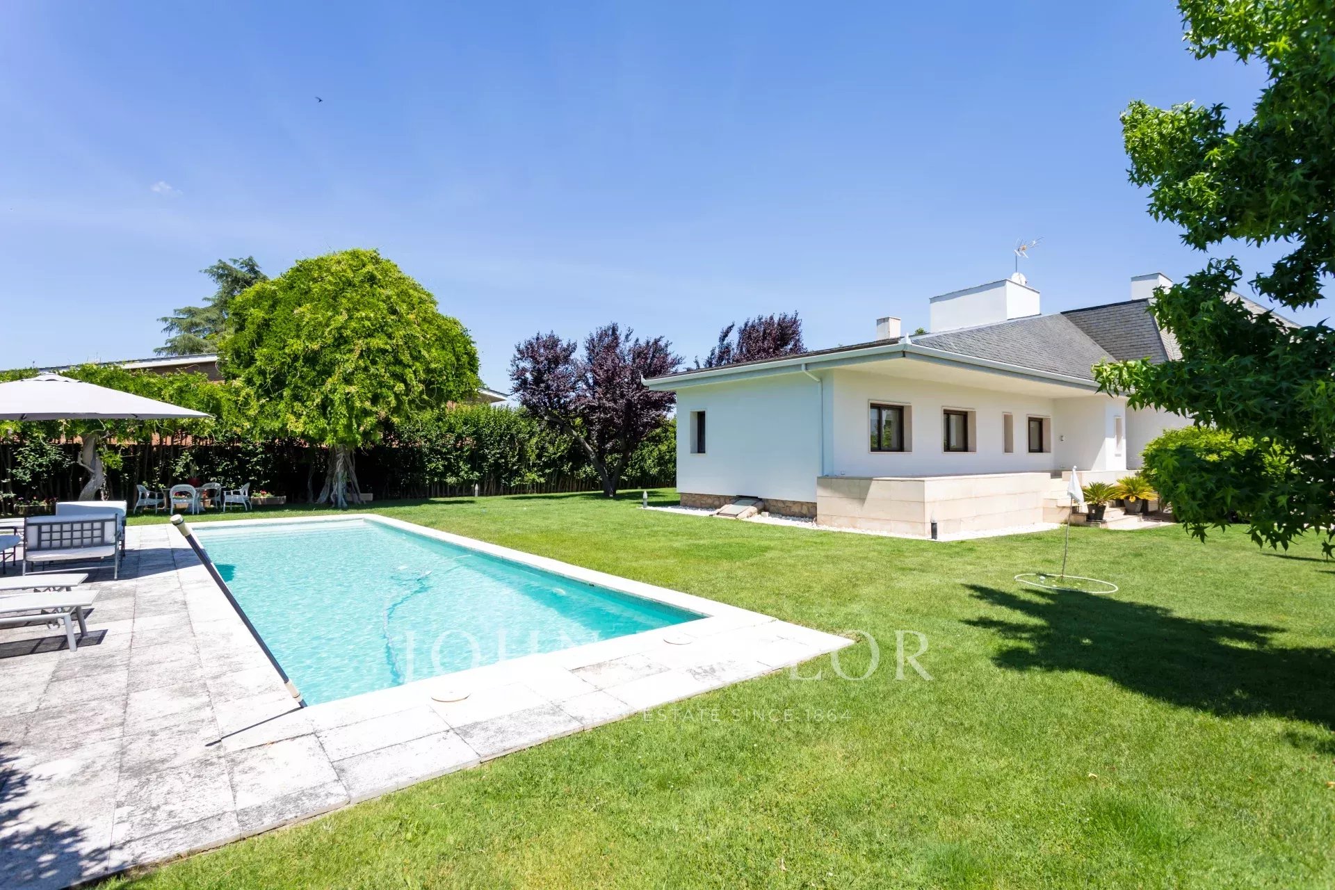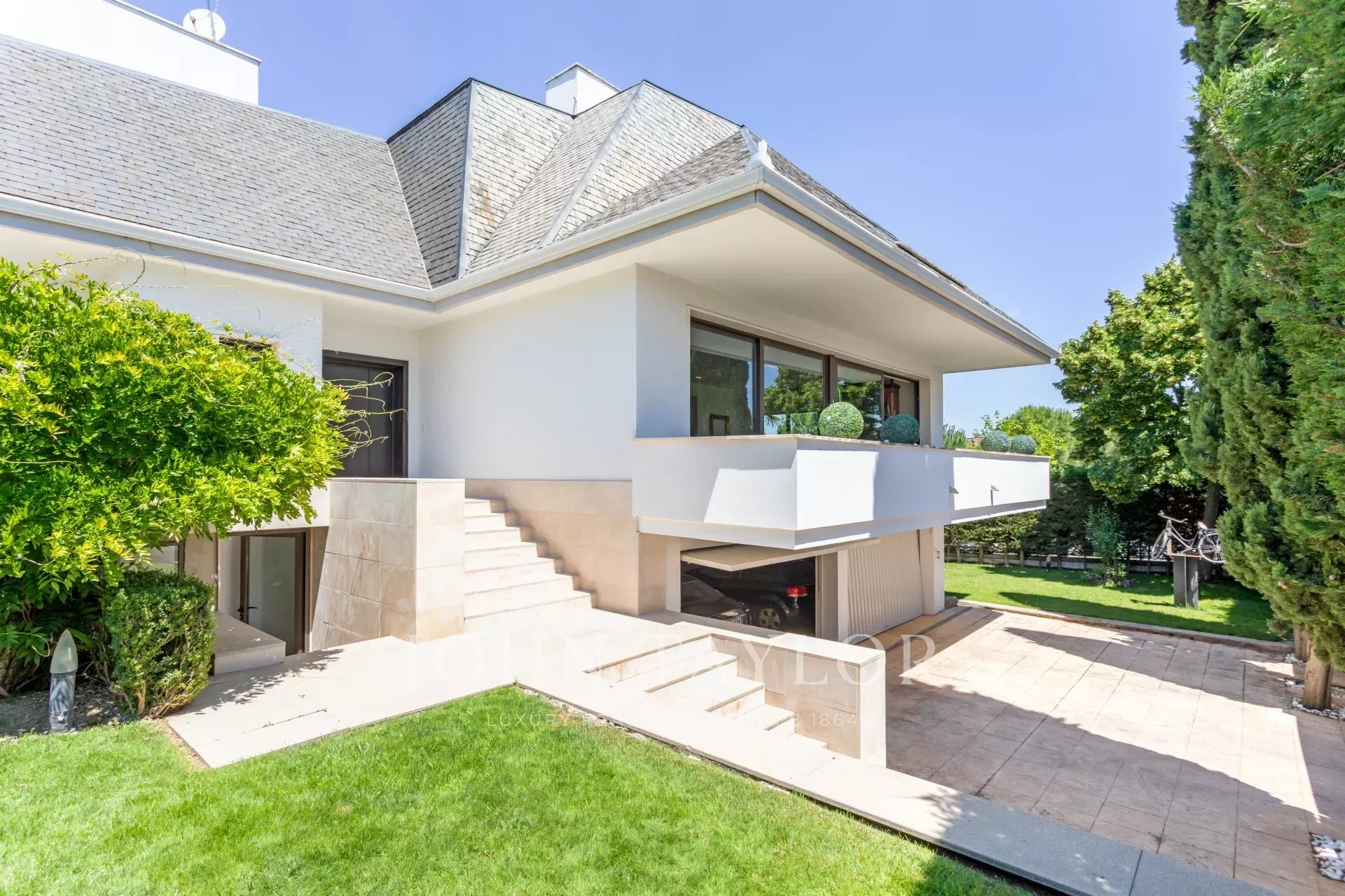 Impressive and bright house is located in Monte del Monte del Pilar, one of the most prestigious areas of Majadahonda. It stands out for its unique design that prioritizes large windows and the use of high quality materials in floors, windows and solid wood doors. The facade of the house, with modern and elegant lines, integrates perfectly with the natural environment, offering a perfect balance between nature and modernity.