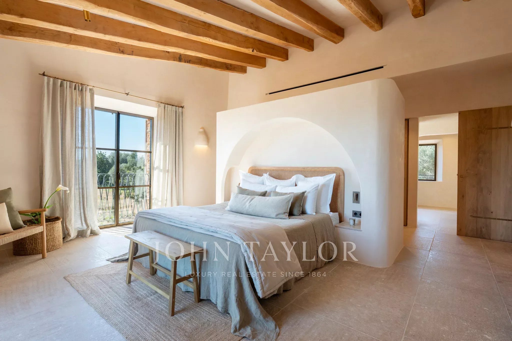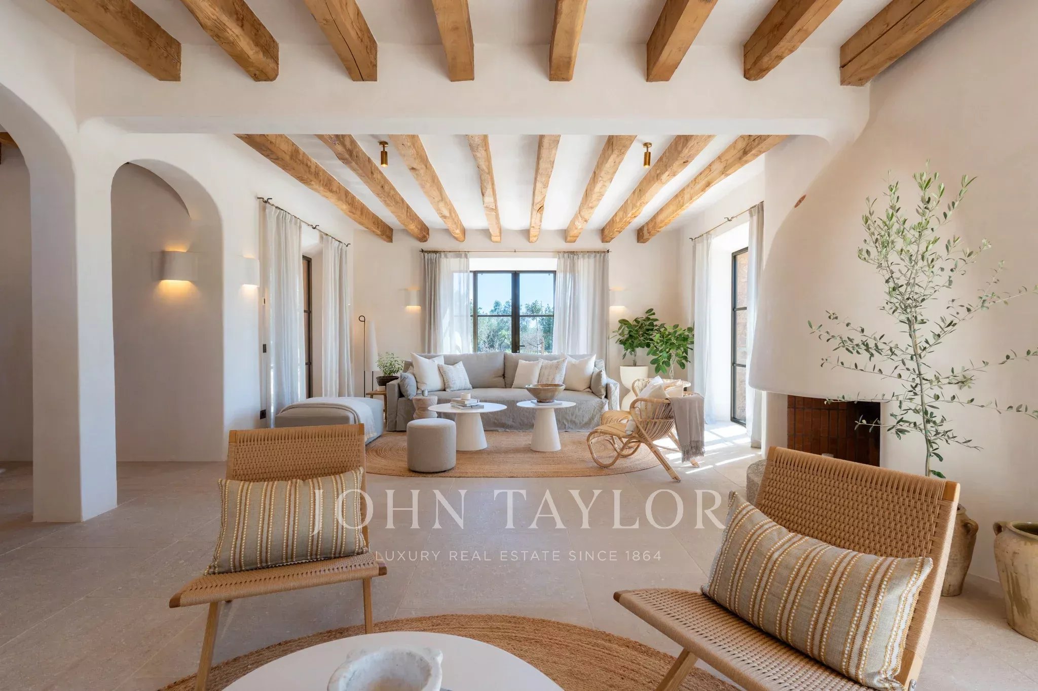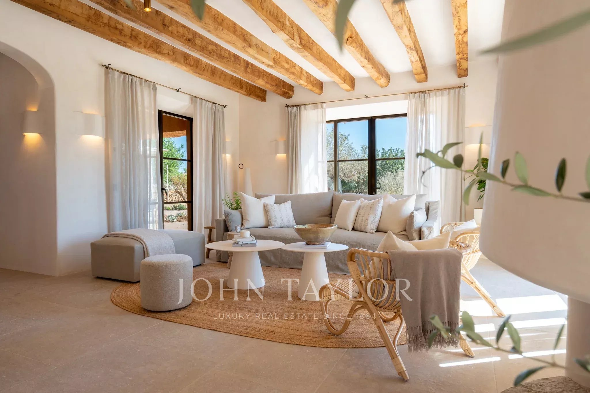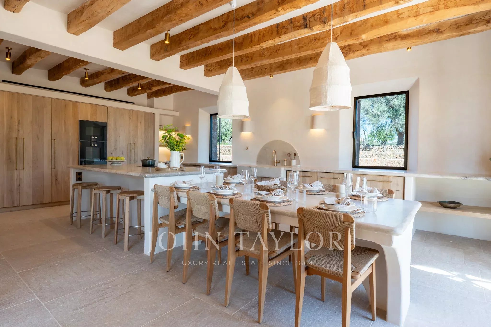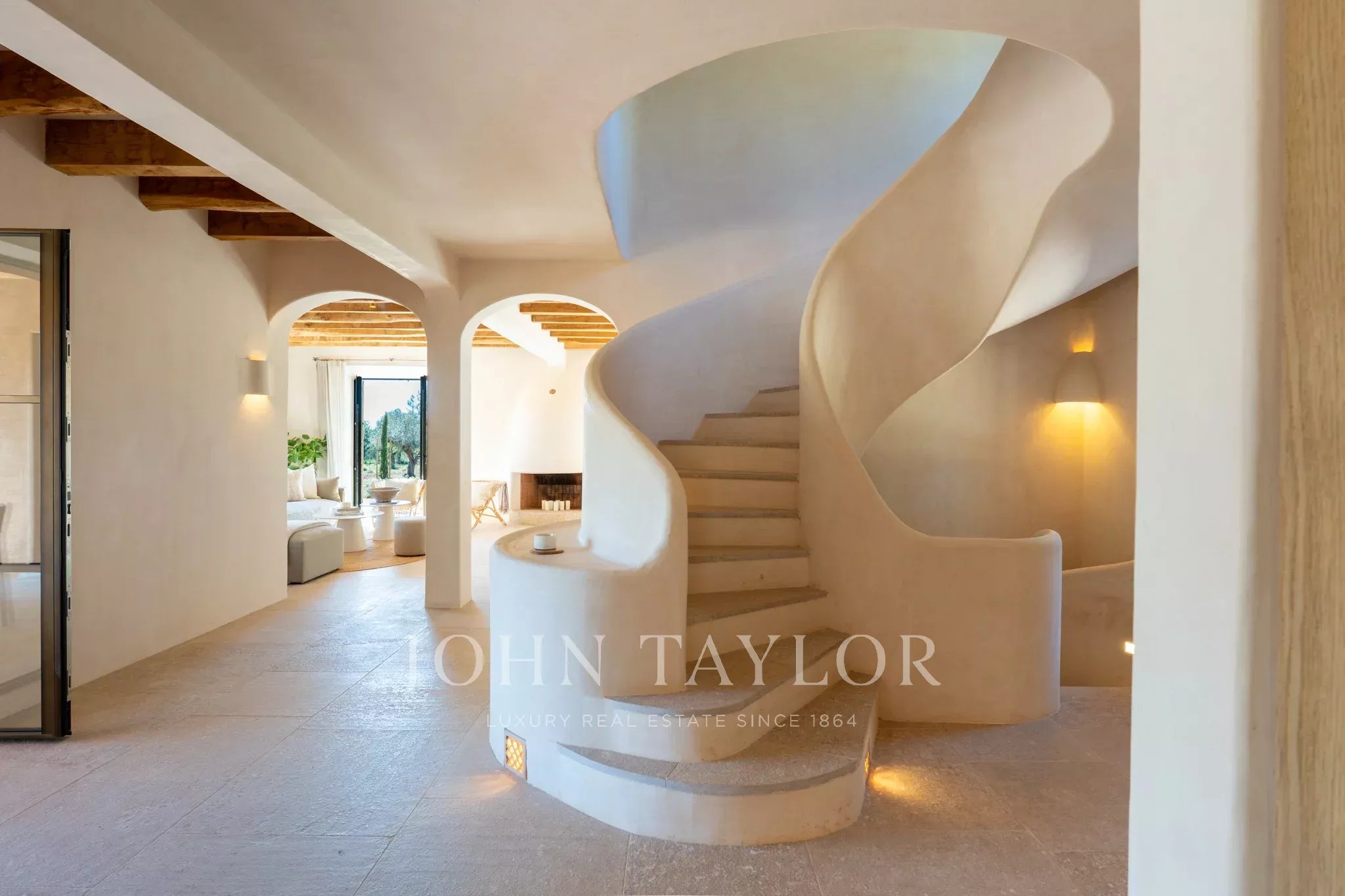 Tanca D Olivar has just completed construction and is designed to integrate into its country surroundings, featuring a natural stone facade, olive-green windows and shutters, and traditional clay roofing. The property will be surrounded by lush Mediterranean gardens, which together offer a harmonious environment. Upon entering the stone flooring, warm neutral colours, high ceilings, wooden beams, a stunning staircase that is a work of art in itself, and architectural contours used throughout, based on an open-plan layout, offer an inviting and luxurious interior.