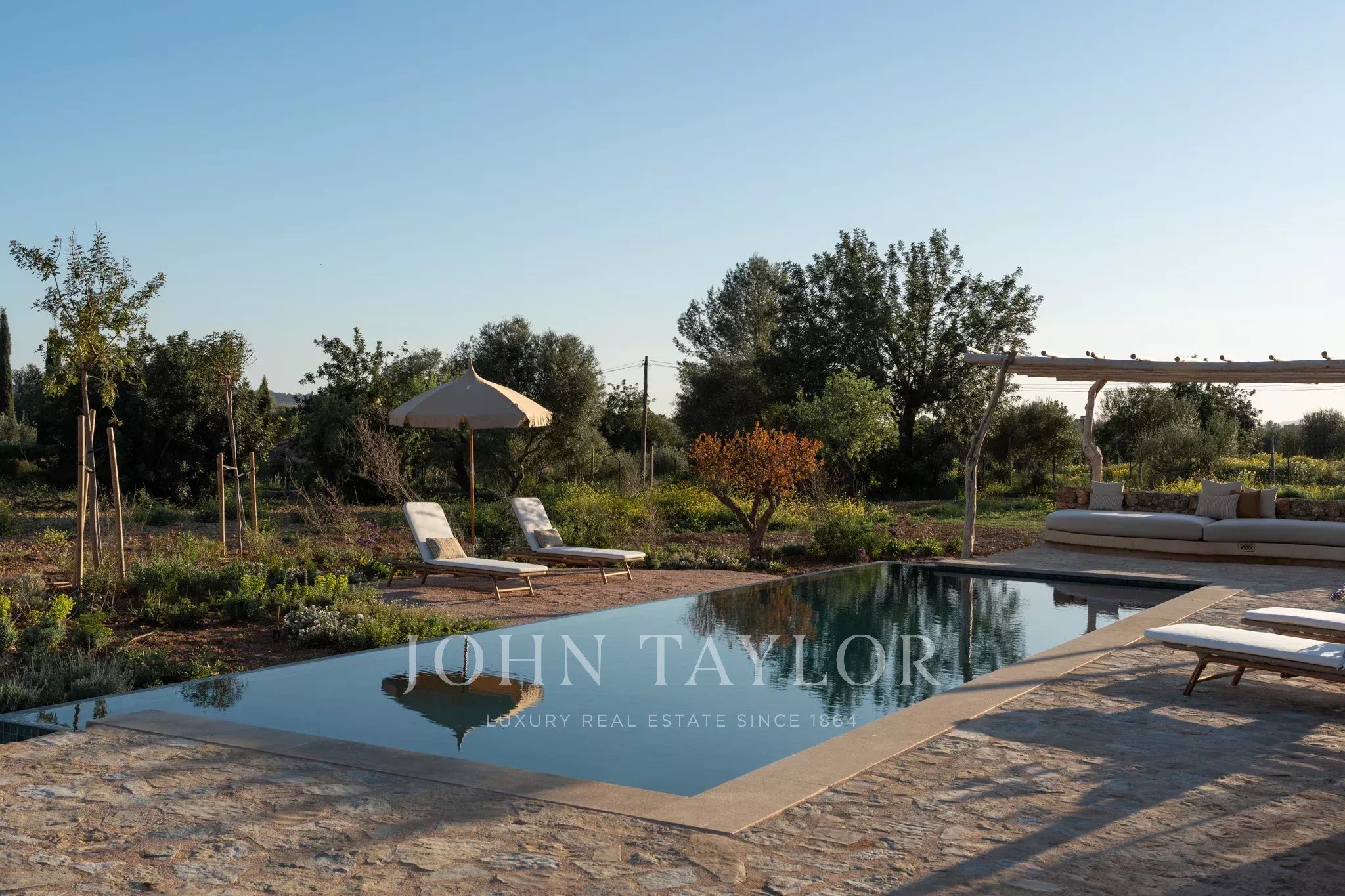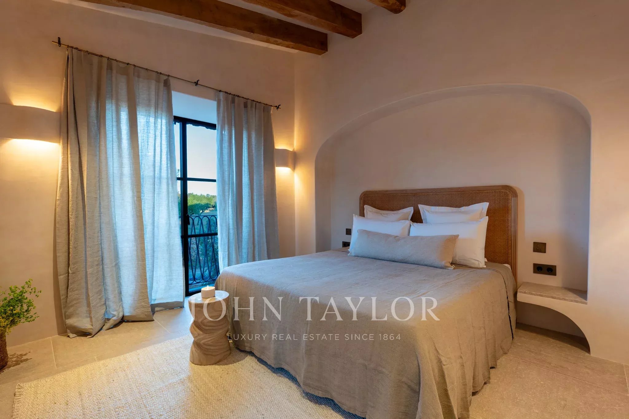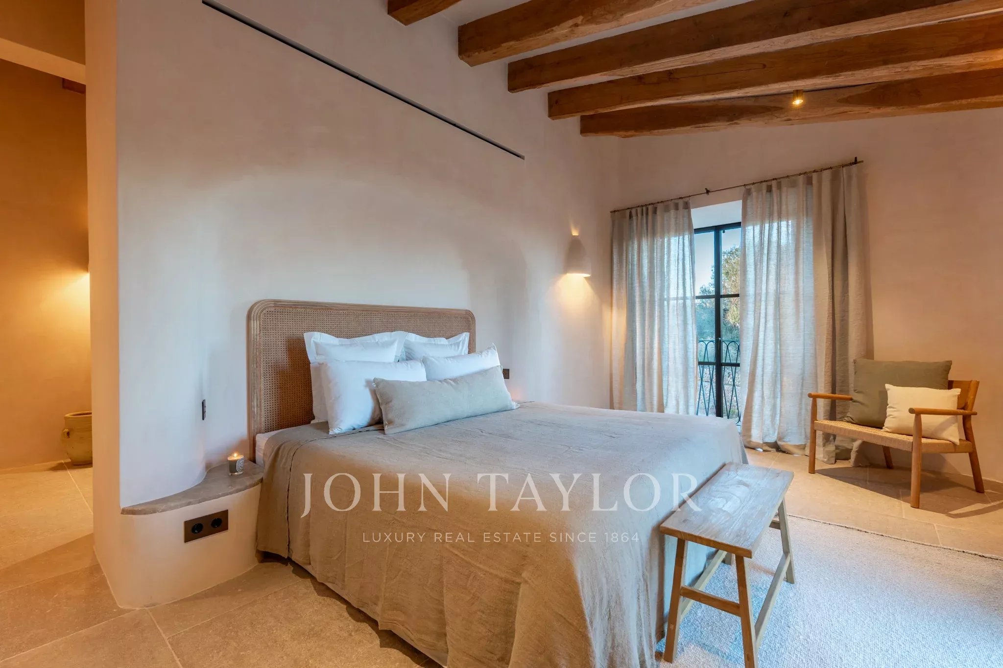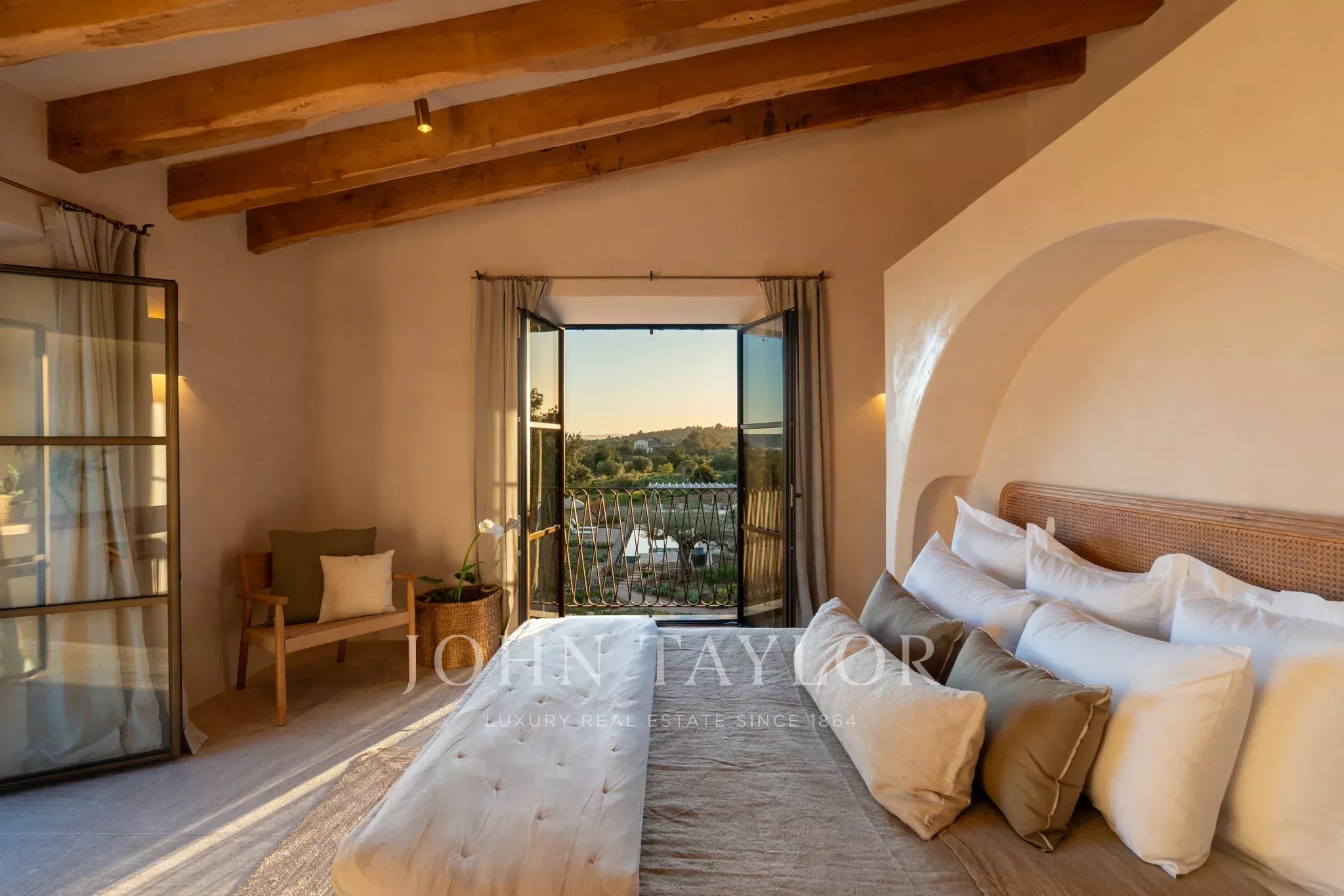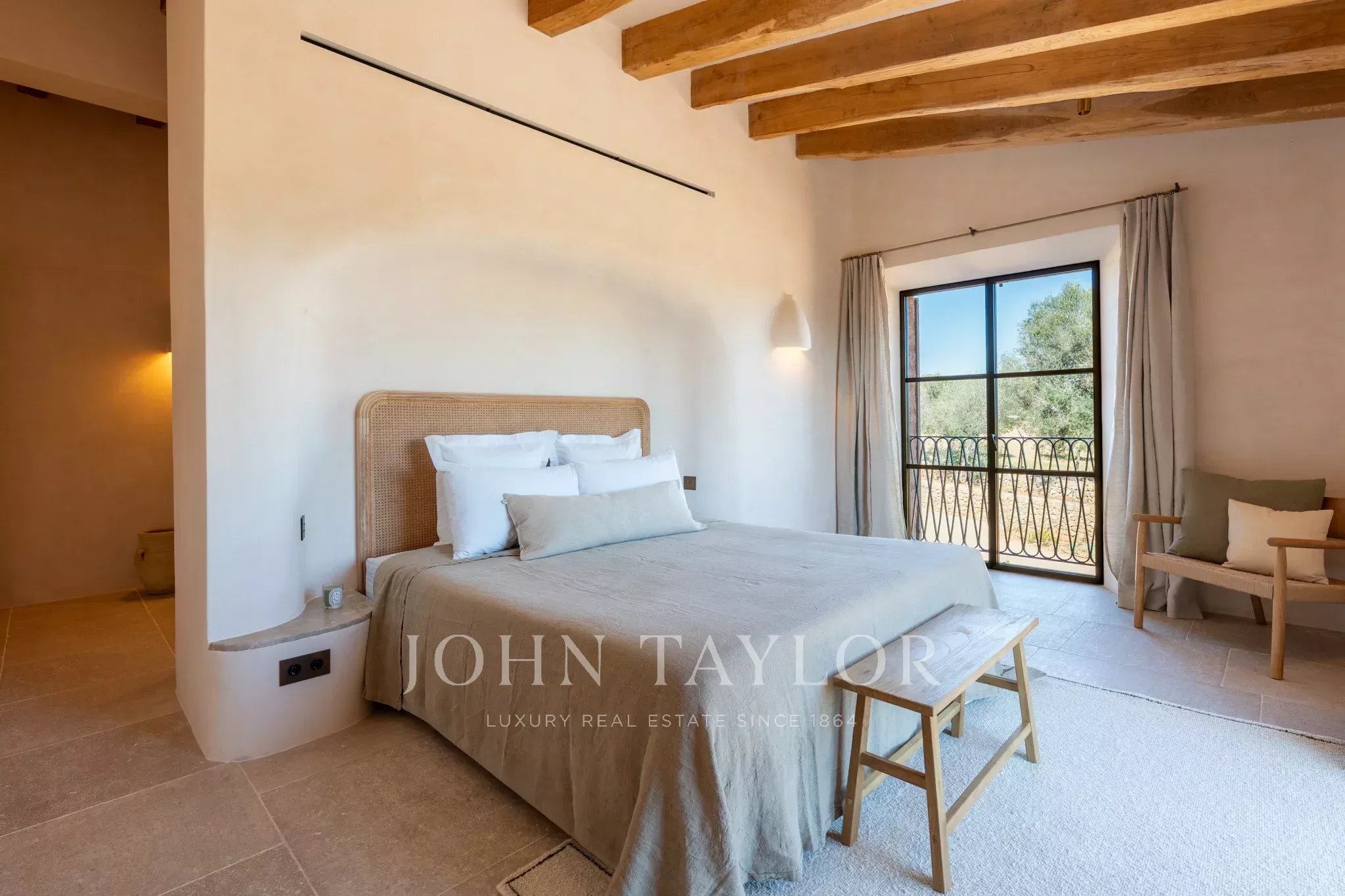Tanca D Olivar has just completed construction and is designed to integrate into its country surroundings, featuring a natural stone facade, olive-green windows and shutters, and traditional clay roofing. The property will be surrounded by lush Mediterranean gardens, which together offer a harmonious environment. Upon entering the stone flooring, warm neutral colours, high ceilings, wooden beams, a stunning staircase that is a work of art in itself, and architectural contours used throughout, based on an open-plan layout, offer an inviting and luxurious interior.