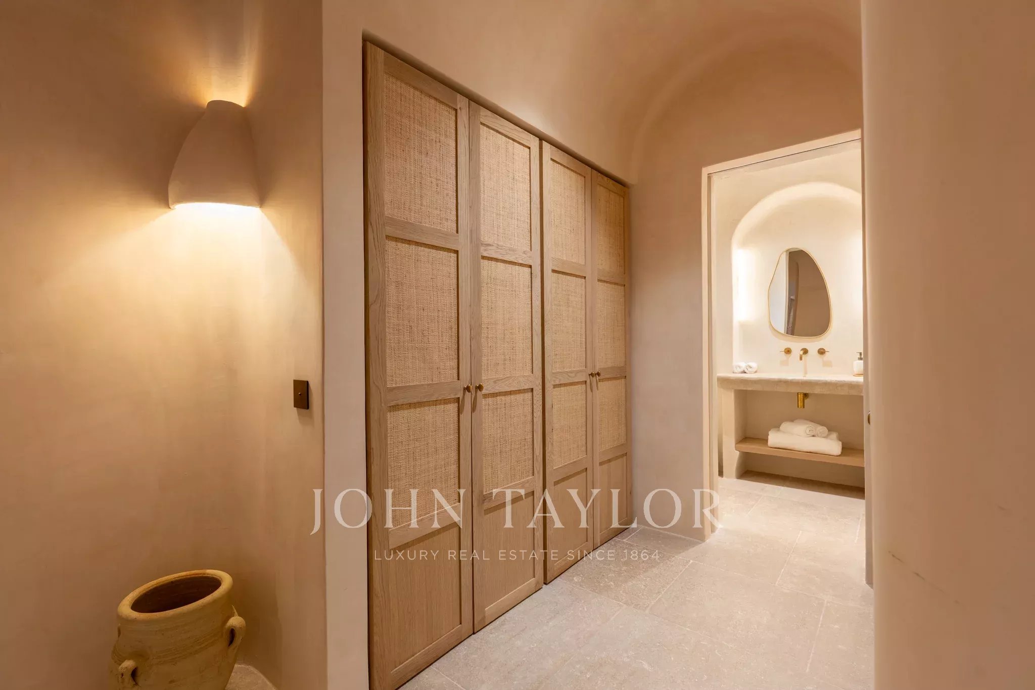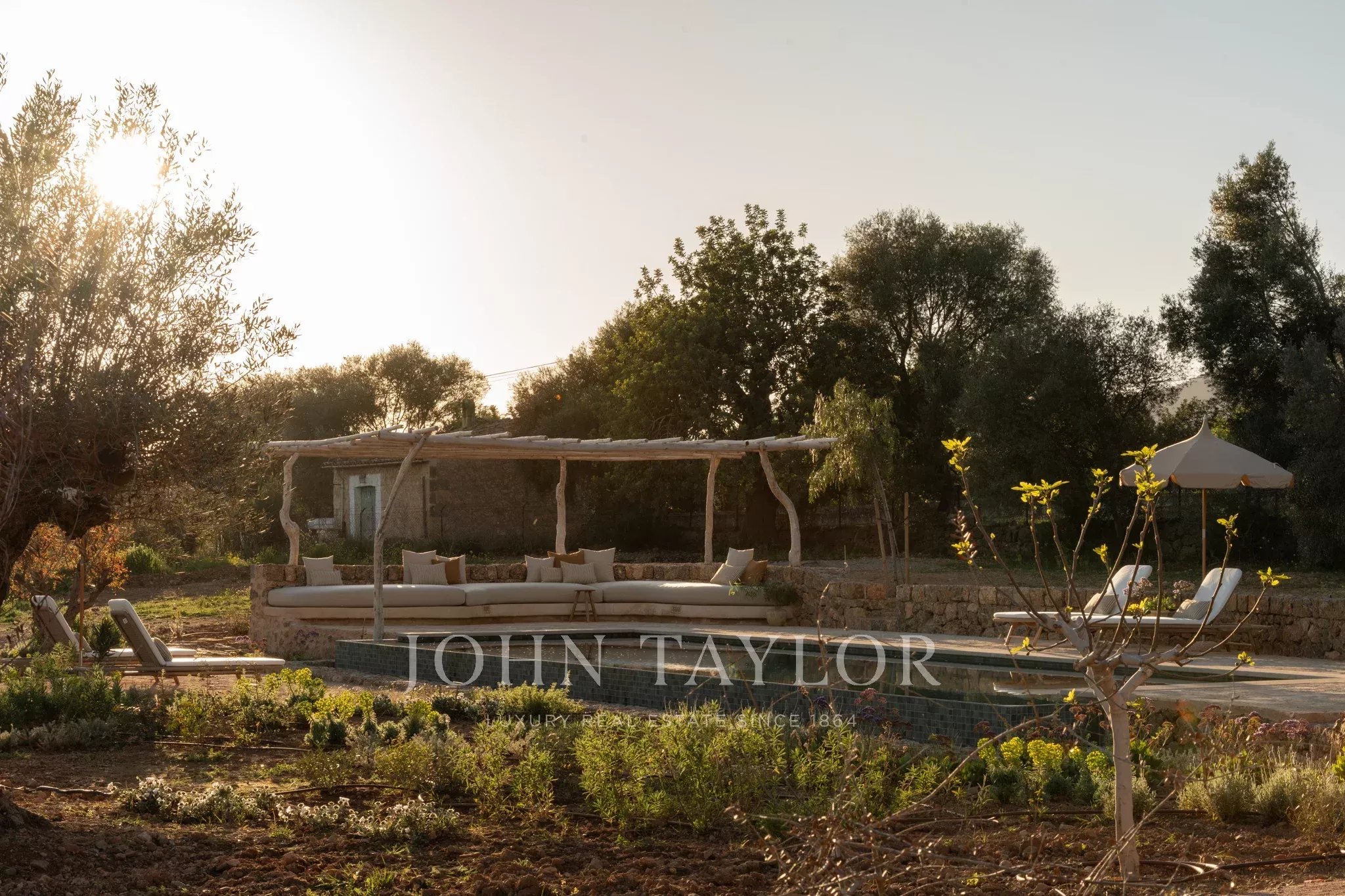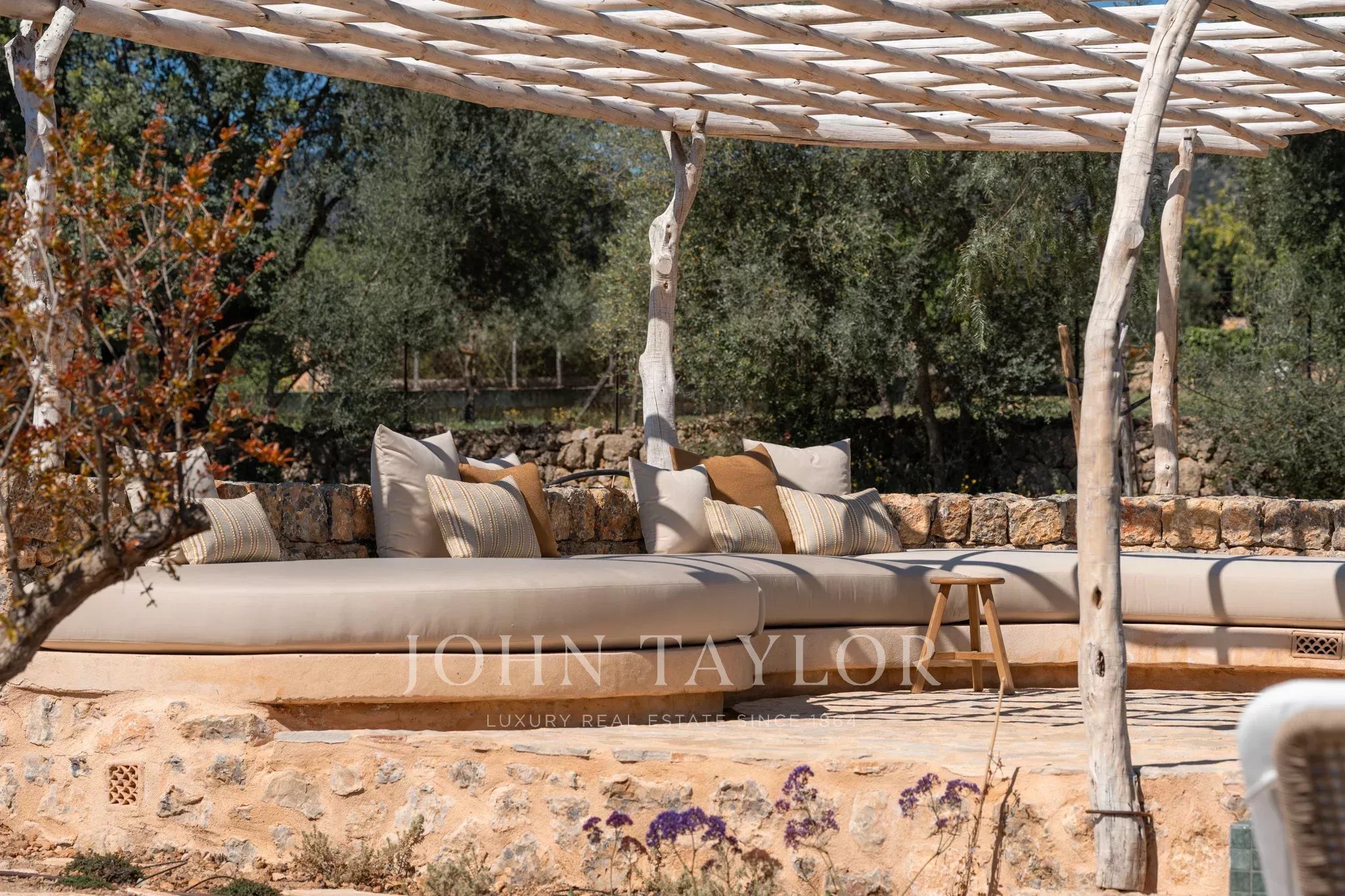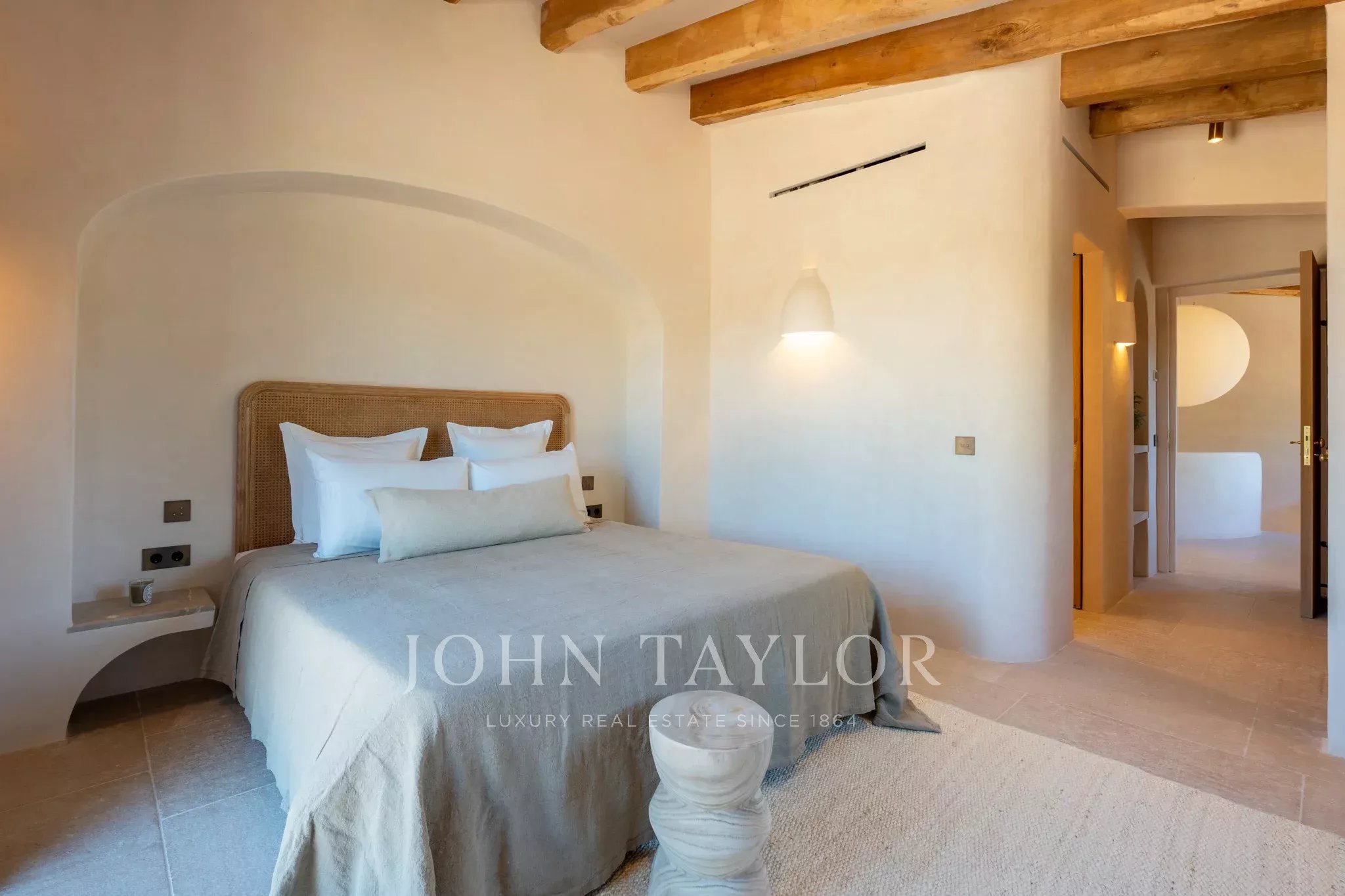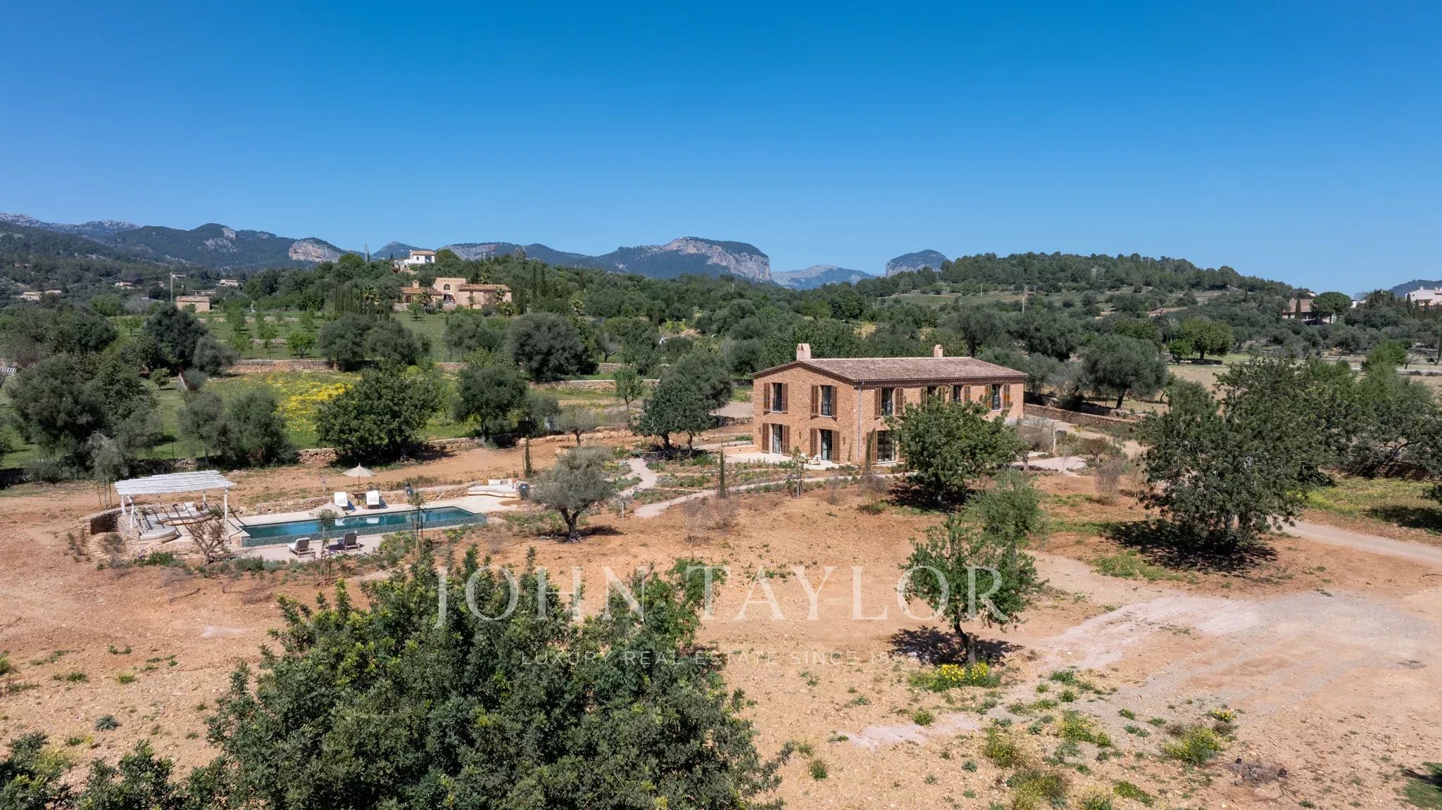 Tanca D Olivar has just completed construction and is designed to integrate into its country surroundings, featuring a natural stone facade, olive-green windows and shutters, and traditional clay roofing. The property will be surrounded by lush Mediterranean gardens, which together offer a harmonious environment. Upon entering the stone flooring, warm neutral colours, high ceilings, wooden beams, a stunning staircase that is a work of art in itself, and architectural contours used throughout, based on an open-plan layout, offer an inviting and luxurious interior.
