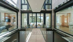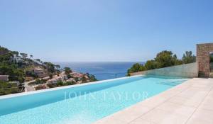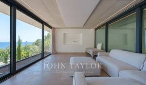 The property stands out for its impressive architectural design and glass façade facing the sea, ensuring maximum natural light and sea views from every room. Upon driving into the private garage, you have both elevator and stair access to the lower floors. The second level includes three bedrooms, each with ensuite bathrooms. The third level is dedicated entirely to daily living. The fully fitted kitchen and dining room flow effortlessly into the living room, which has direct access to the outdoor lounge with a cozy fireplace, terrace, and pool area. The lower level includes a home cinema and private gym. Built using only the highest quality materials, the villa features central air conditioning, underfloor heating, an osmosis system, and home automation.