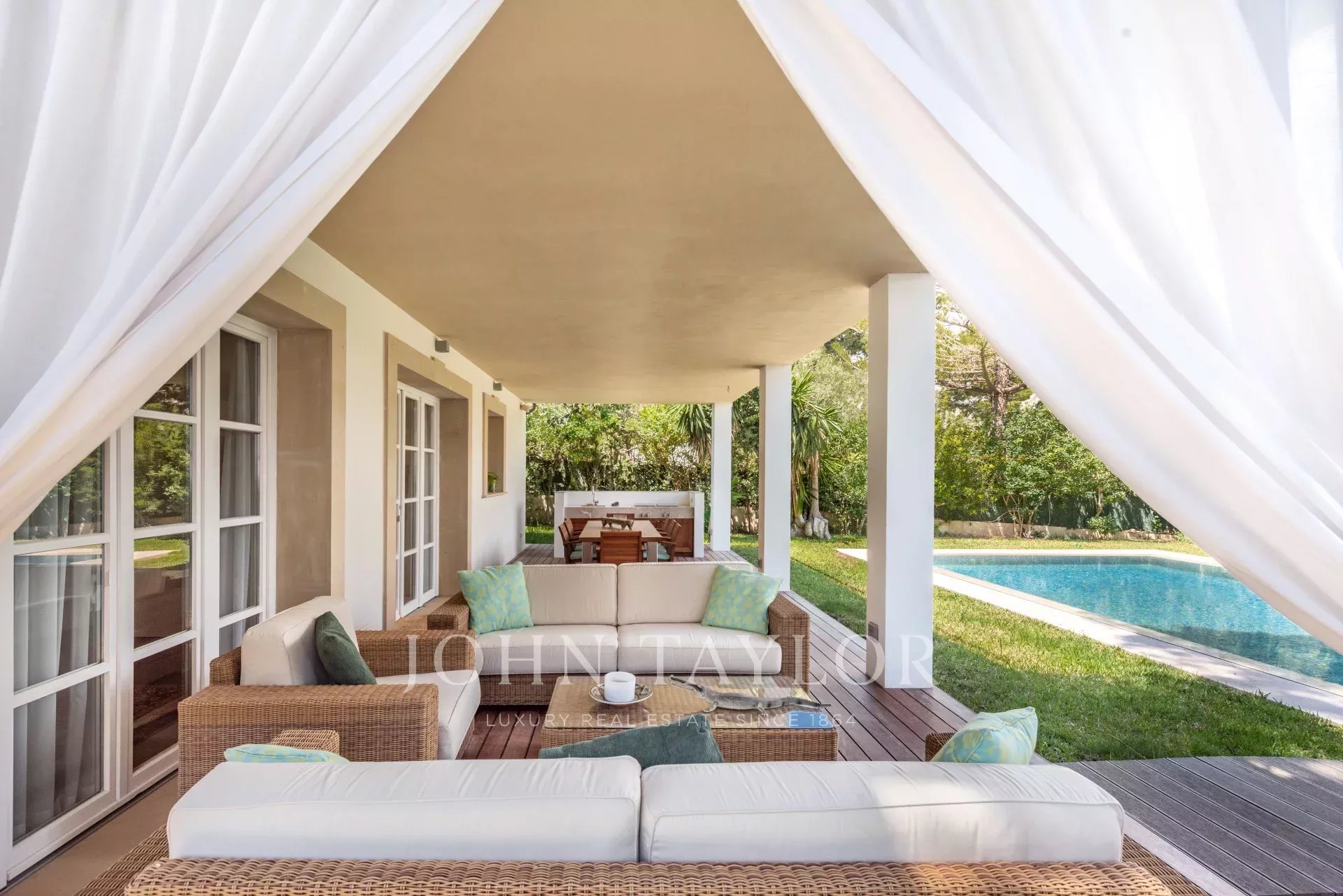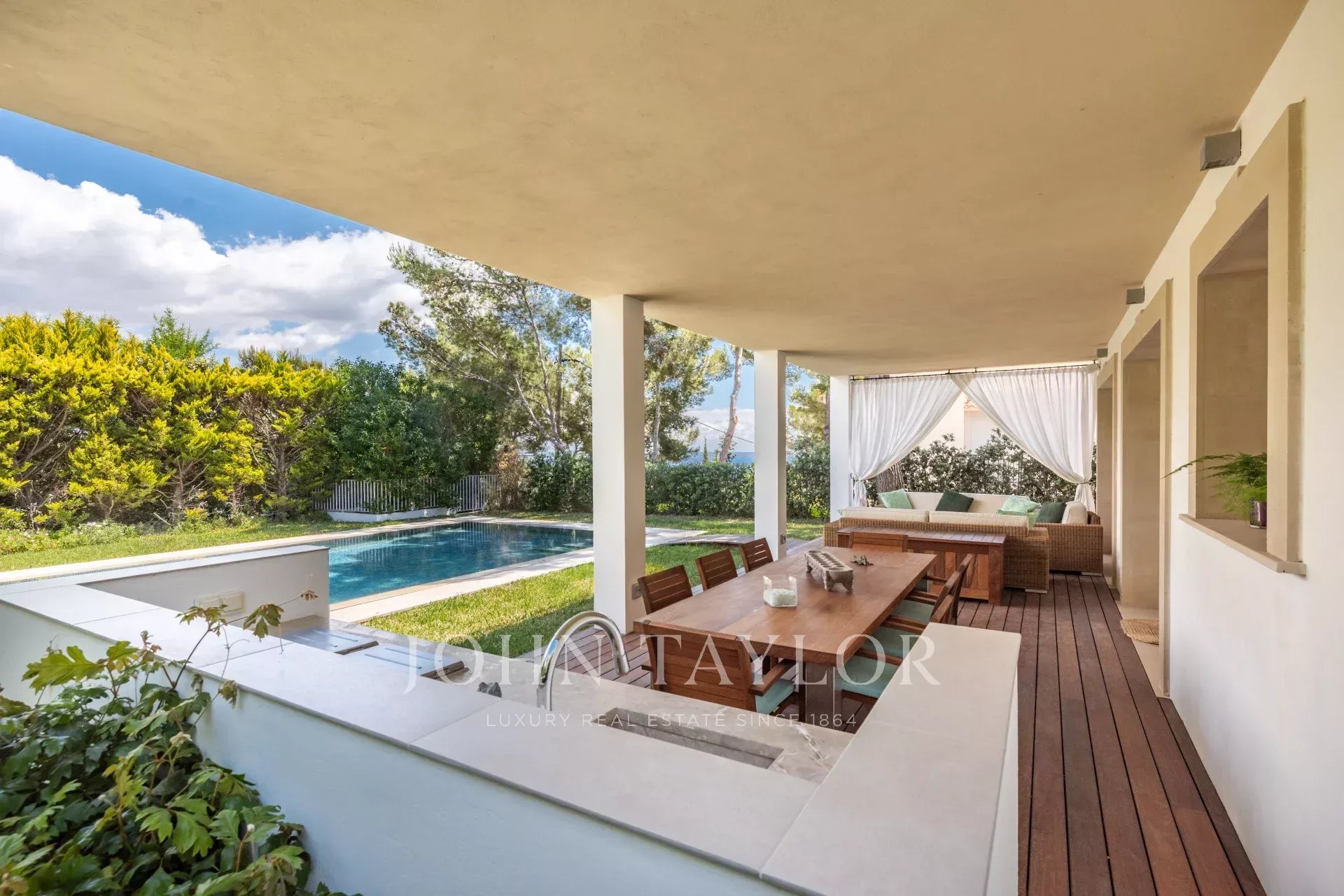 The terrace is a perfect place to enjoy the summer, with its outdoor kitchen and dining area for several diners, ideal for relaxing and enjoying peaceful moments. The property also has a large saltwater swimming pool, an automatic irrigation system, outdoor lighting, and a garage.