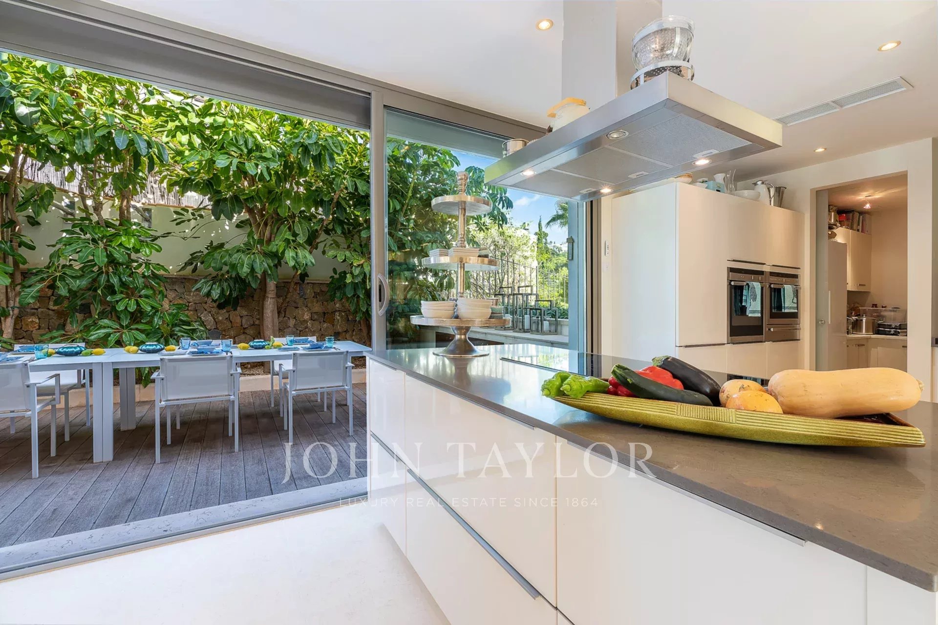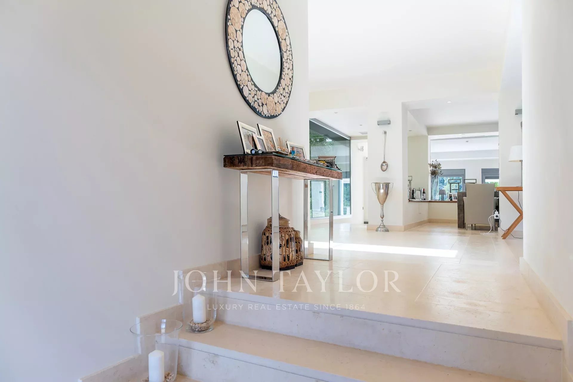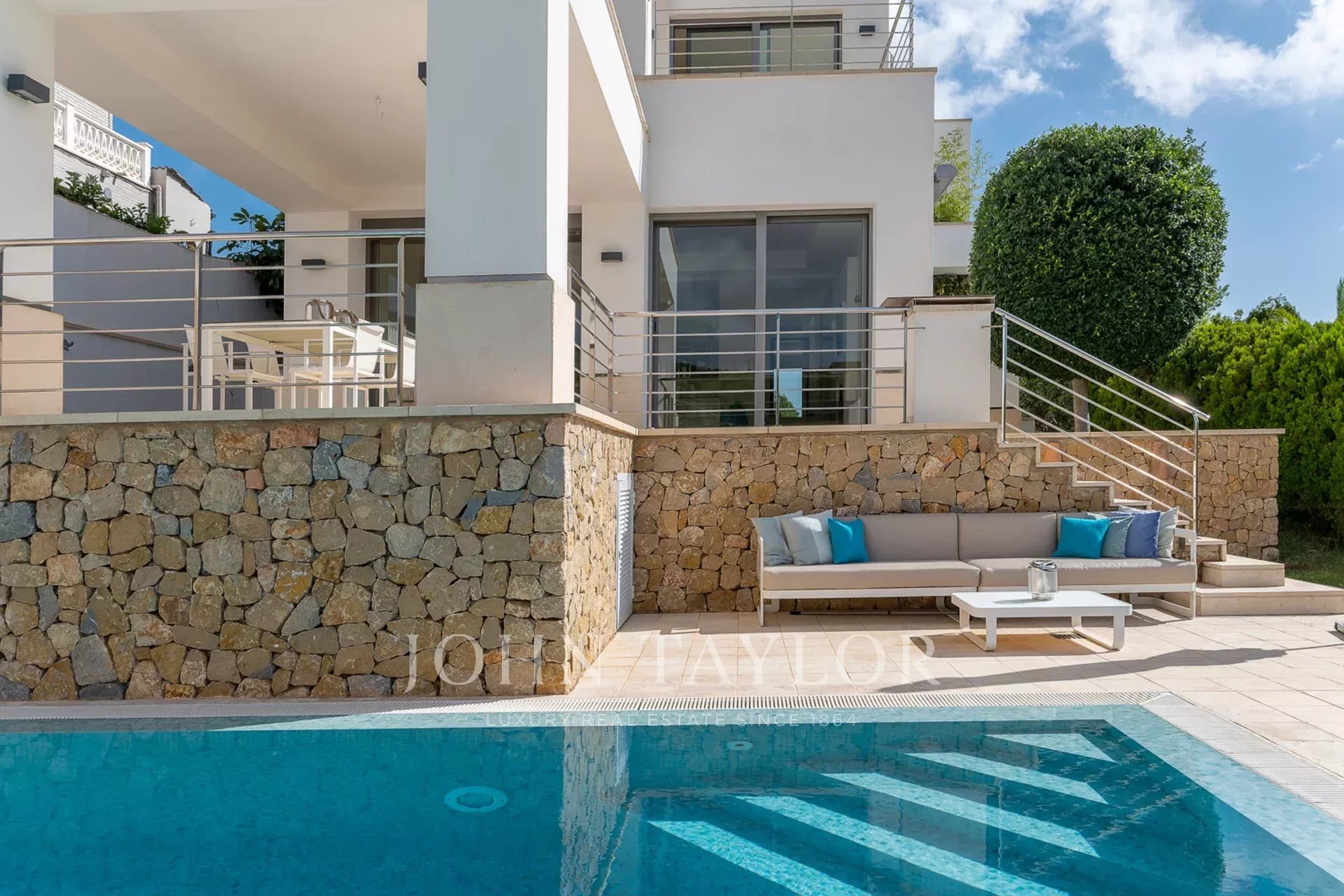 Below the swimming pool, there is an additional room with versatile potential that can be customised to suit your individual needs. With a double garage and a green area in front of the villa that provides privacy, this ideally located residence conveys the feeling of living in harmony with nature. At the same time, it is only a few minutes away from Palma de Mallorca and Puerto Portals.