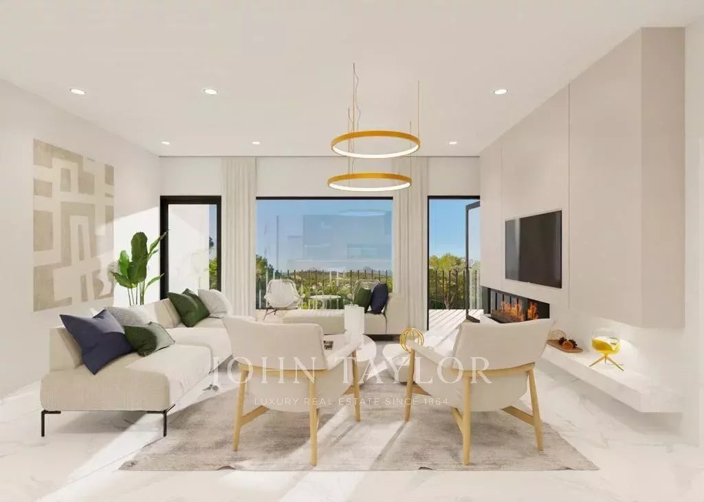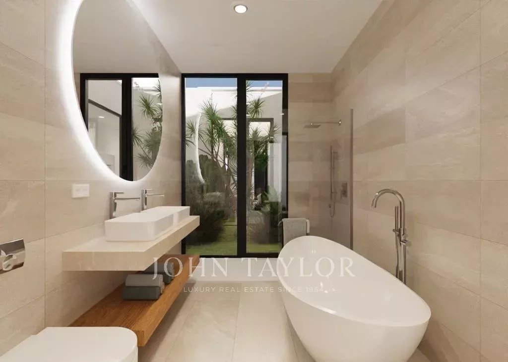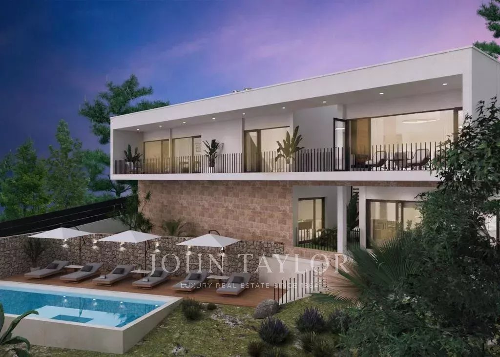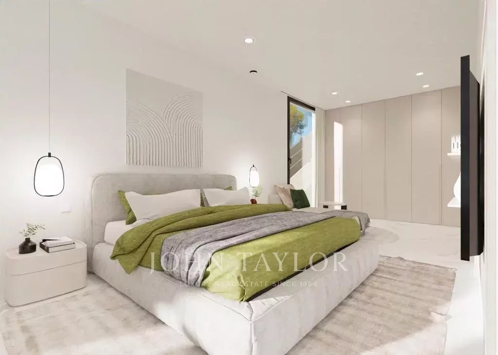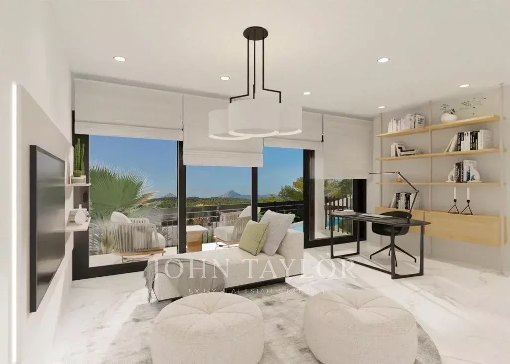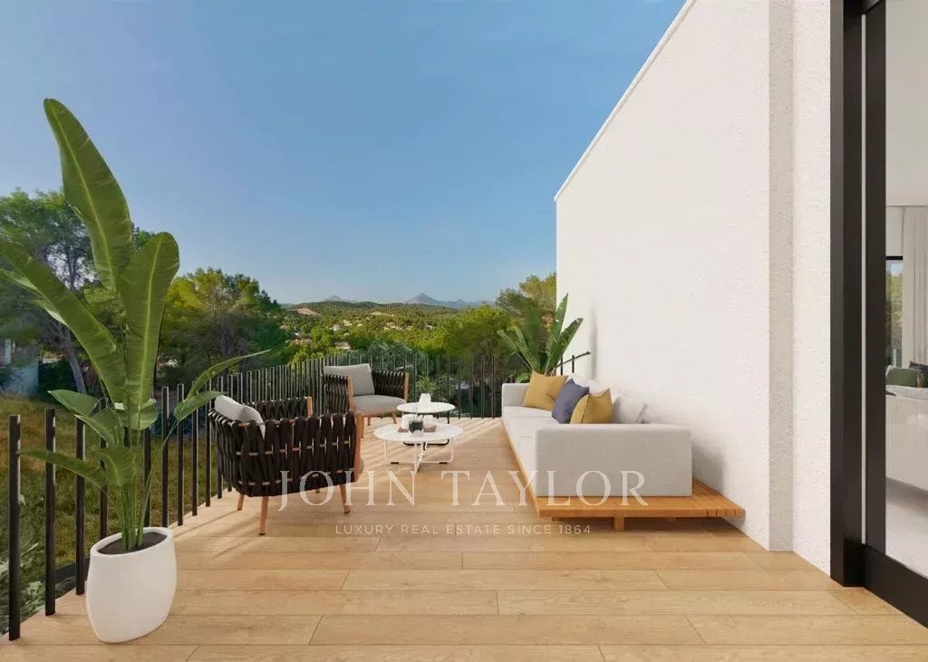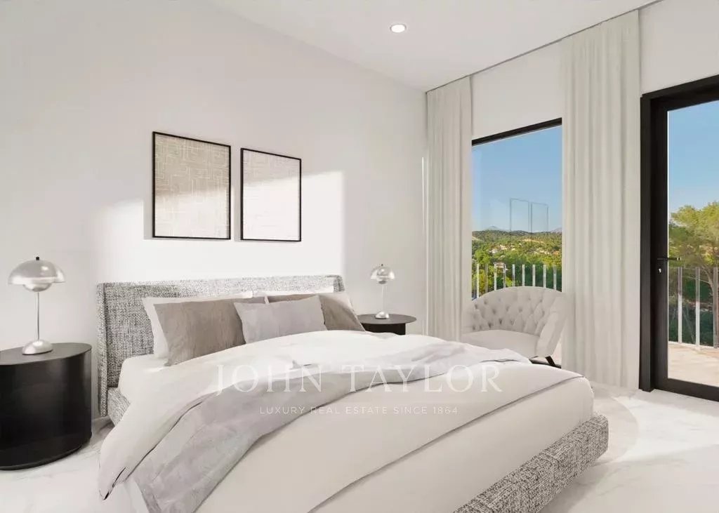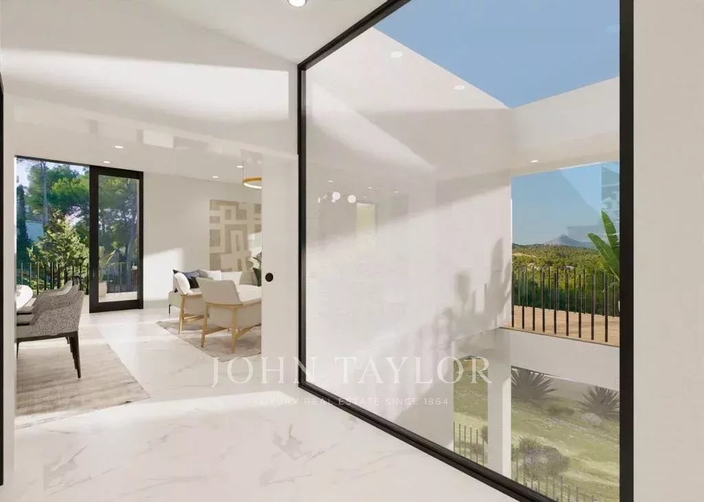 Modern villa under construction in Costa de la Calma. This house can be delivered in 2025. It is being built on a sloping plot bordering a green area. You will enjoy nice views to the pine trees and the mountains. Cars are parked on the same level as the street and then go down to access the house which is located on the natural slope of the land. The house consists in total of a living room, a fully equipped kitchen, a laundry room, an office, 4 bedrooms and 4 bathrooms. There will be several patios which together with the large windows will give a lot of light to the house. On the terraces and the solarium next to the pool you will be able to enjoy outdoor living.