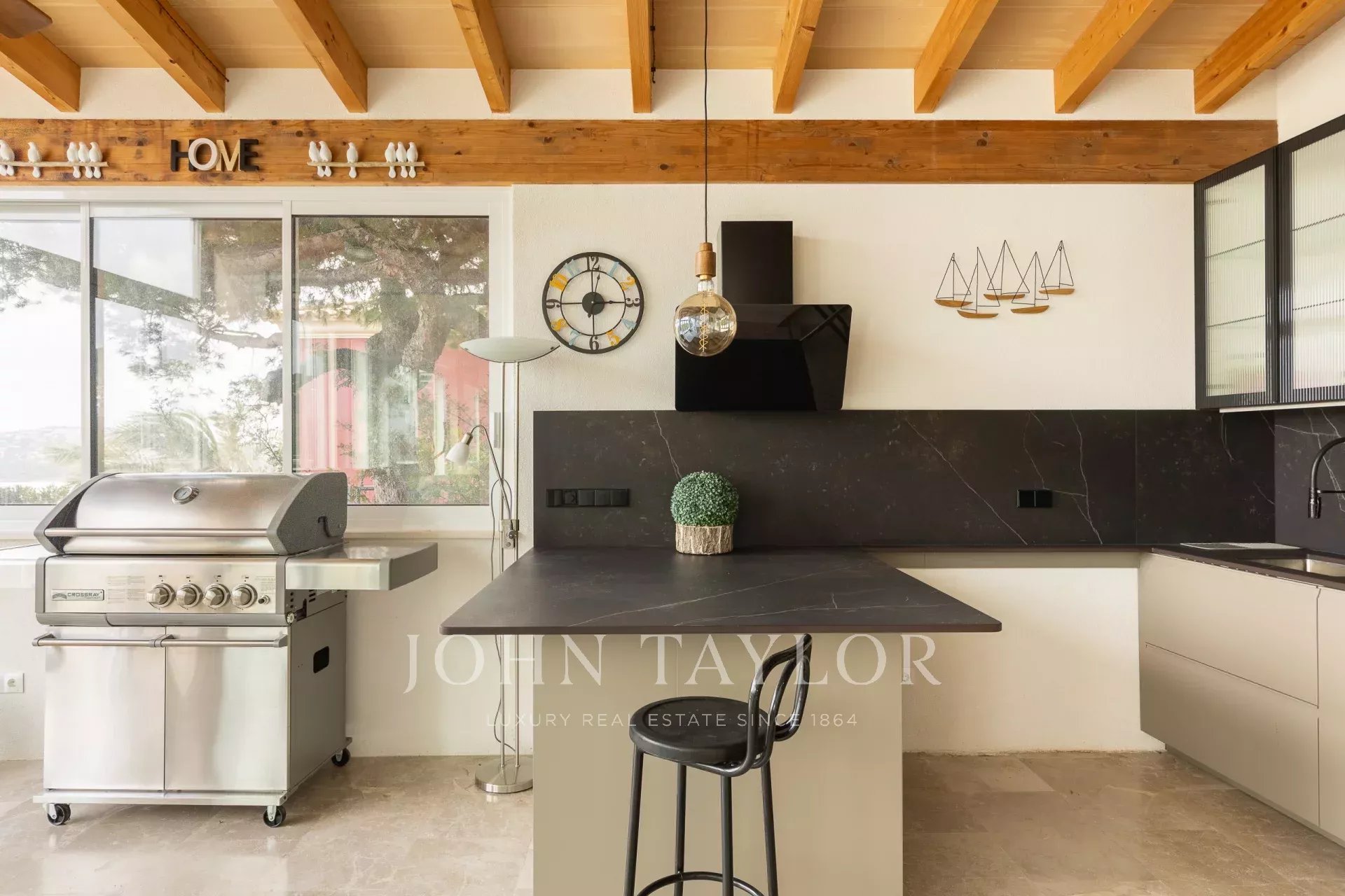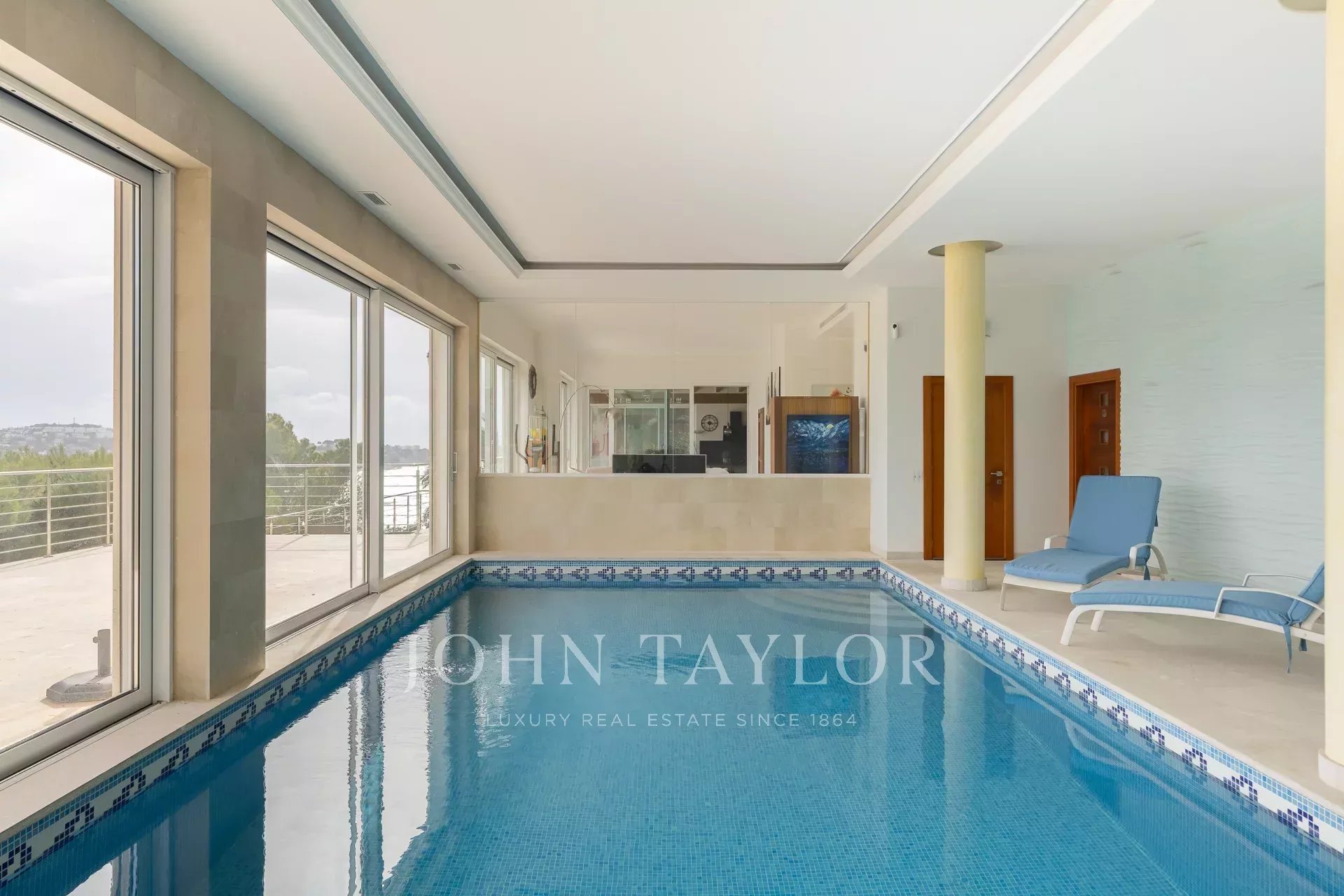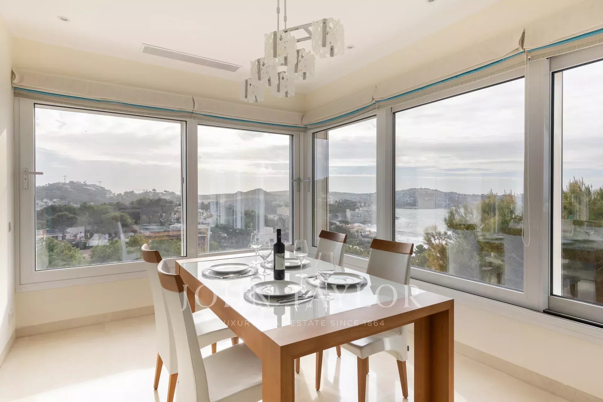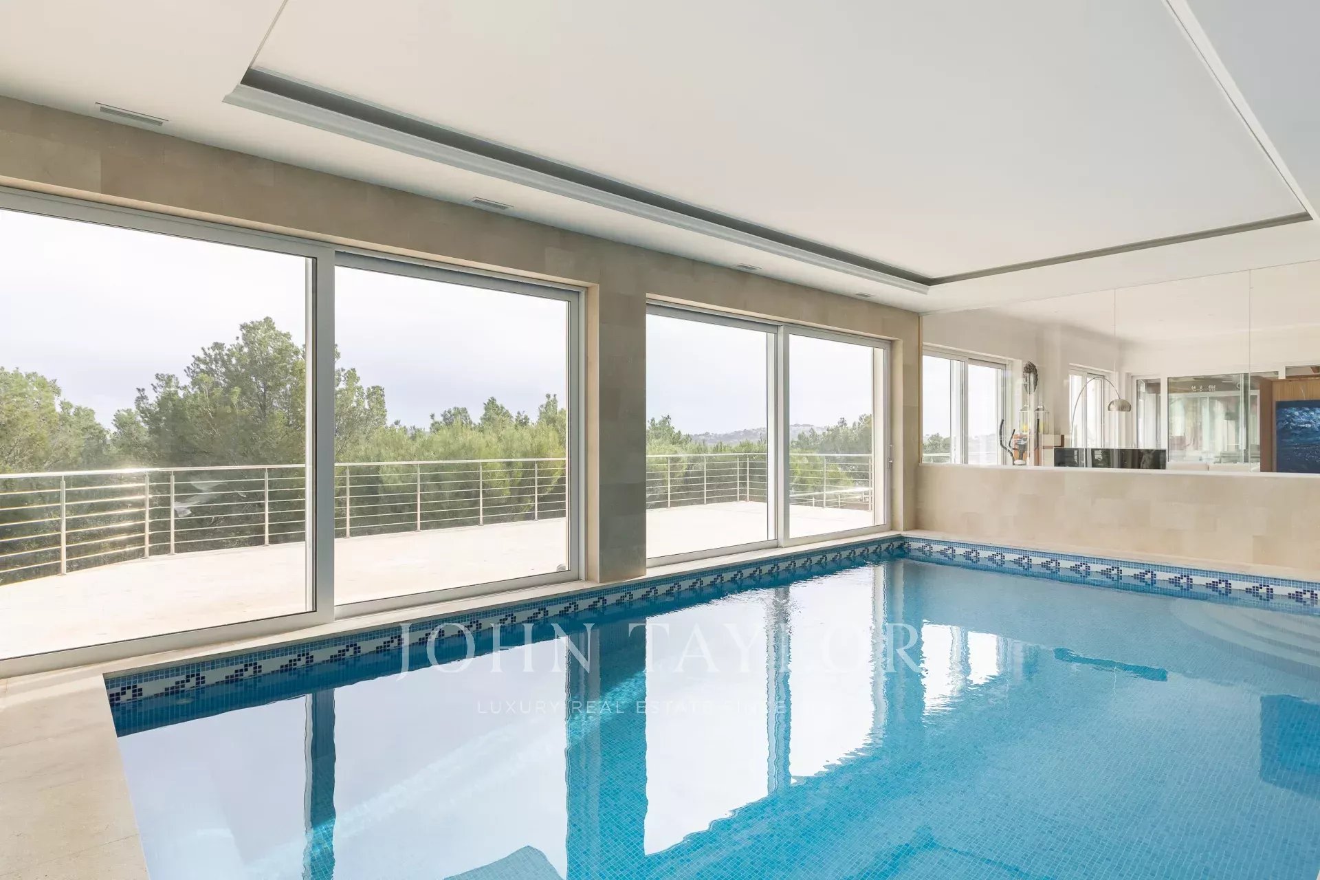 Discover this stunning contemporary design villa, completely refurbished and located in one of the most quiet and sought after areas of the island. With spectacular sea views, this property combines luxury, comfort and privacy, just a few minutes drive from the beaches of Santa Ponsa, Palmanova, Peguera, Camp de Mar and a charming hidden cove. The villa offers three spacious bedrooms with their elegant full bathrooms, plus two guest toilets. The open concept kitchen, fully equipped, merges with a bright living room, creating a sophisticated and cozy atmosphere with lateral and panoramic sea views. One of the biggest attractions of this property is its exclusive spa area, which includes a hammam and a spectacular indoor heated pool of 45 m², perfect for relaxing all year round. Outside, the villa has several spaces to relax and enjoy the Mediterranean climate in a serene environment. The high-end finishes include marble floors with underfloor heating, ducted hot/cold air conditioning and solar panels for greater energy efficiency. In addition, it has a closed garage, outdoor parking for two cars, laundry, storage room, barbecue area and garden area that frames this property. A unique house that combines luxury, exclusivity and proximity to the sea. Contact us for more information or to schedule a visit.