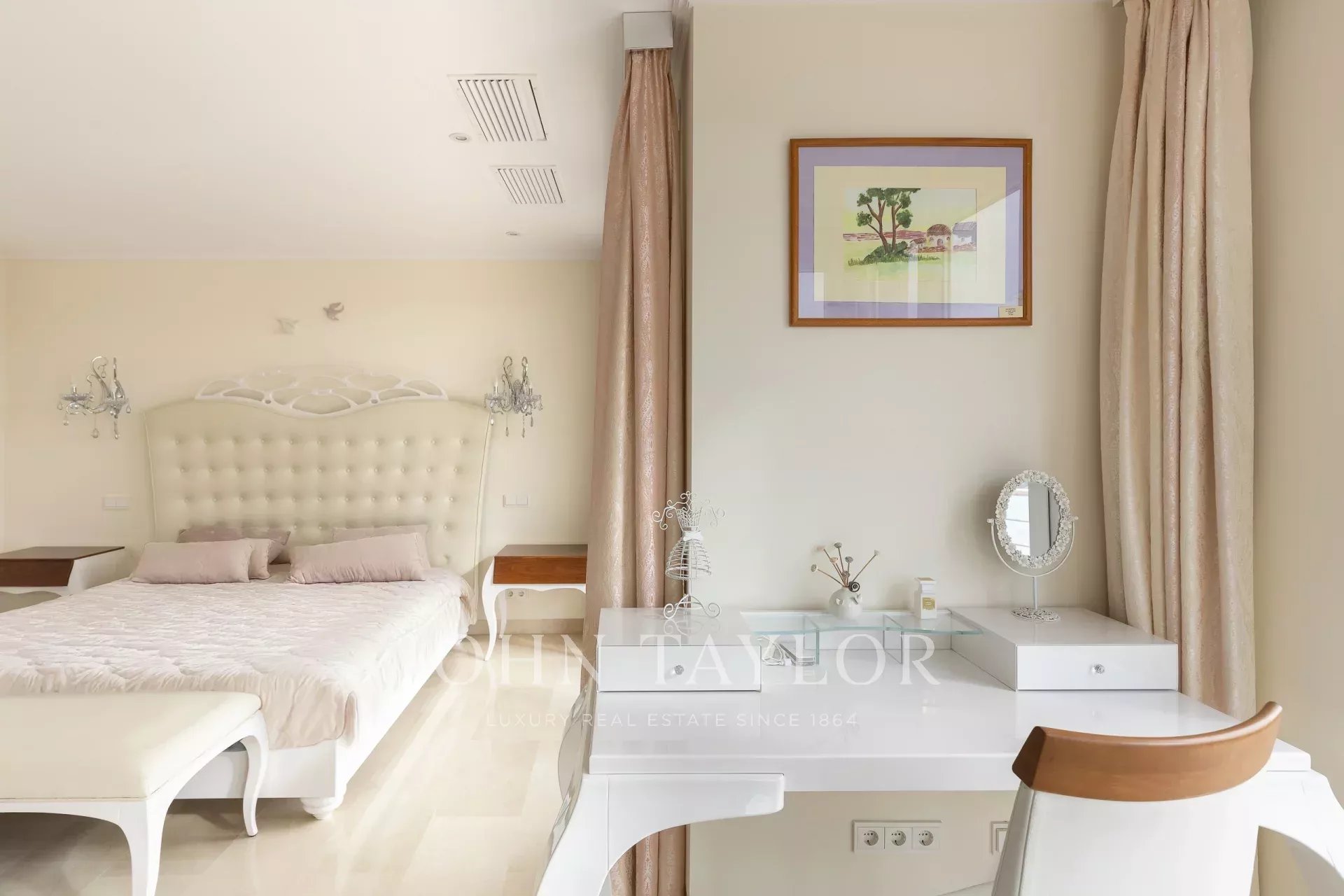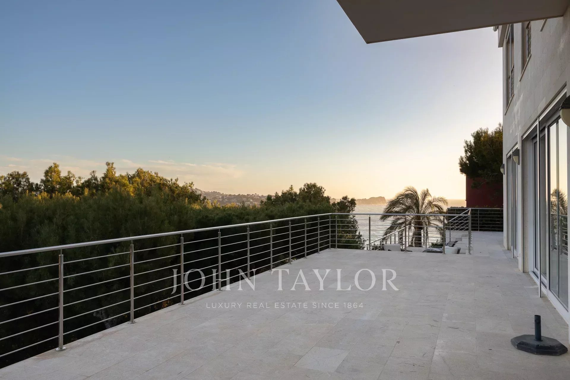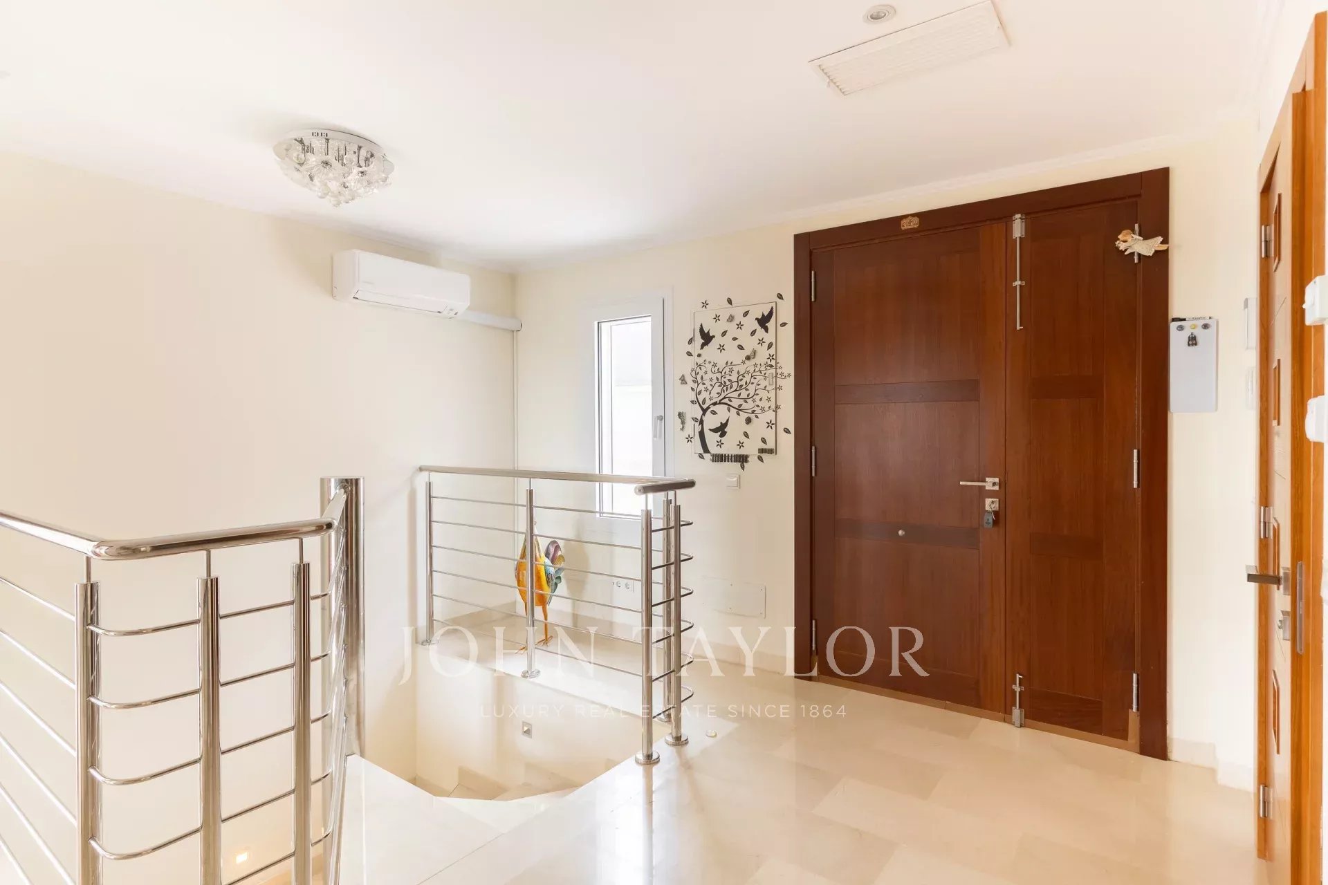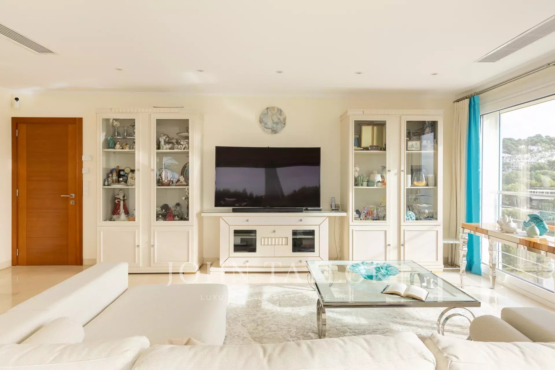 Discover this stunning contemporary design villa, completely refurbished and located in one of the most quiet and sought after areas of the island. With spectacular sea views, this property combines luxury, comfort and privacy, just a few minutes drive from the beaches of Santa Ponsa, Palmanova, Peguera, Camp de Mar and a charming hidden cove. The villa offers three spacious bedrooms with their elegant full bathrooms, plus two guest toilets. The open concept kitchen, fully equipped, merges with a bright living room, creating a sophisticated and cozy atmosphere with lateral and panoramic sea views. One of the biggest attractions of this property is its exclusive spa area, which includes a hammam and a spectacular indoor heated pool of 45 m², perfect for relaxing all year round. Outside, the villa has several spaces to relax and enjoy the Mediterranean climate in a serene environment. The high-end finishes include marble floors with underfloor heating, ducted hot/cold air conditioning and solar panels for greater energy efficiency. In addition, it has a closed garage, outdoor parking for two cars, laundry, storage room, barbecue area and garden area that frames this property. A unique house that combines luxury, exclusivity and proximity to the sea. Contact us for more information or to schedule a visit.