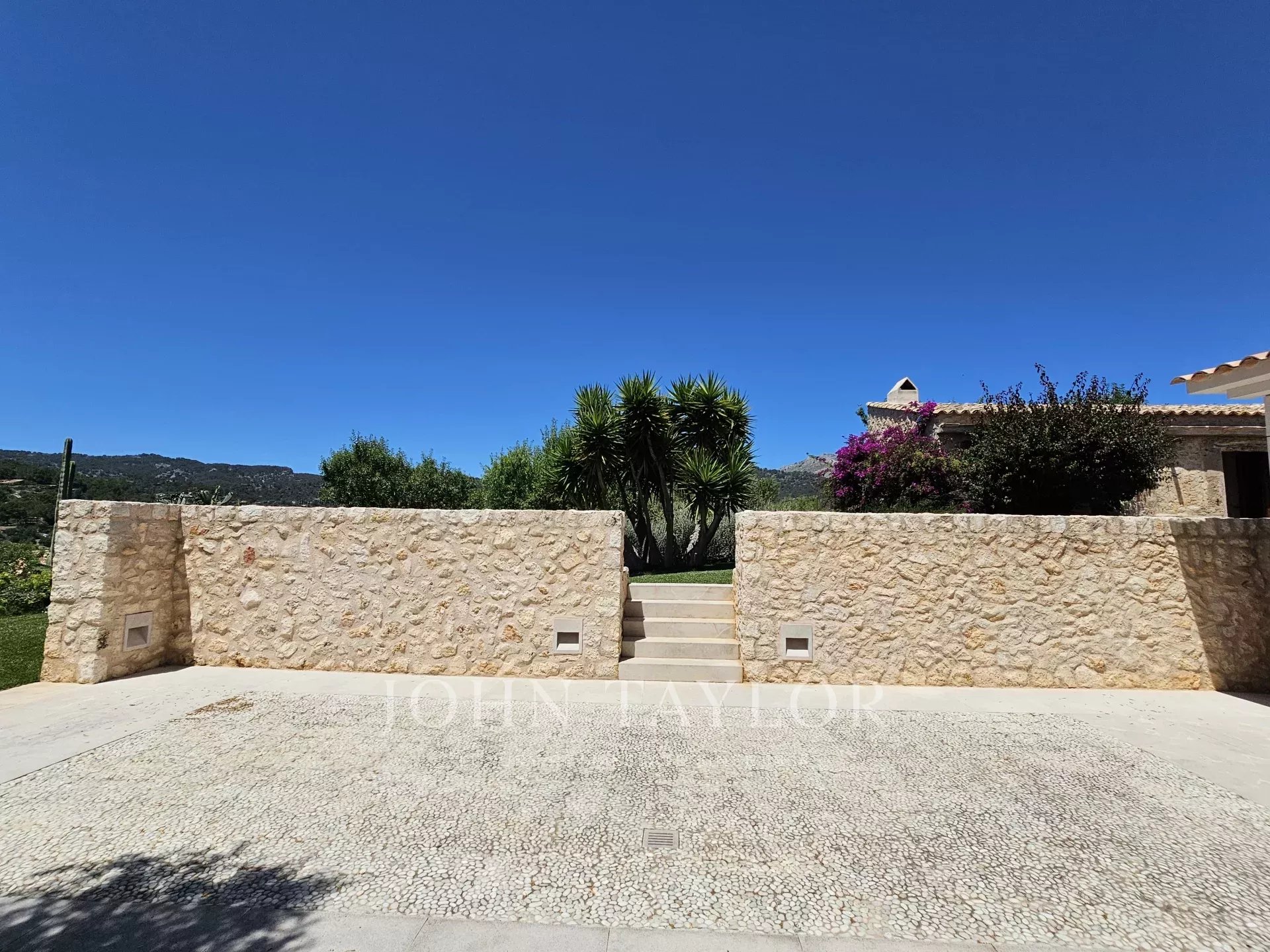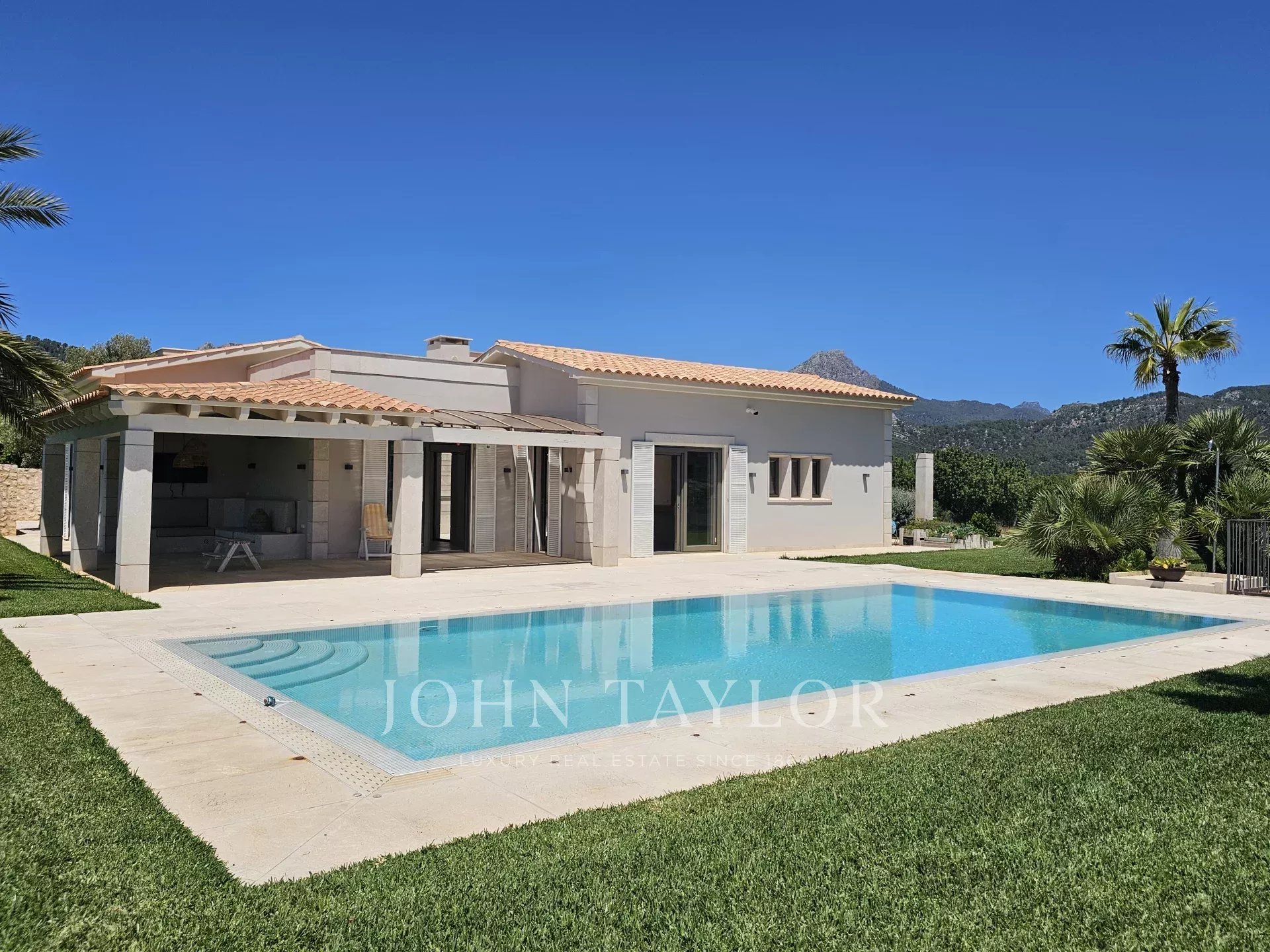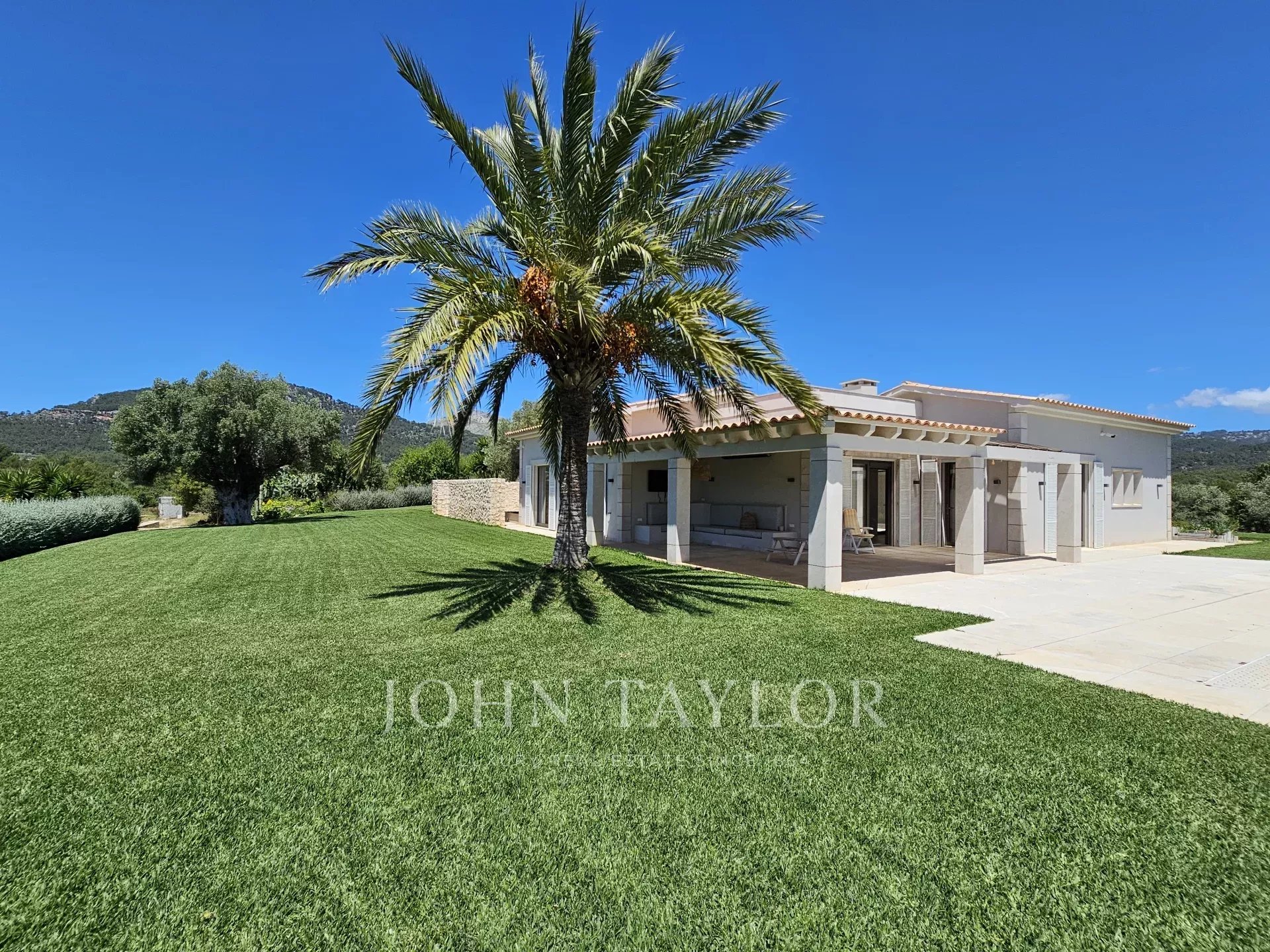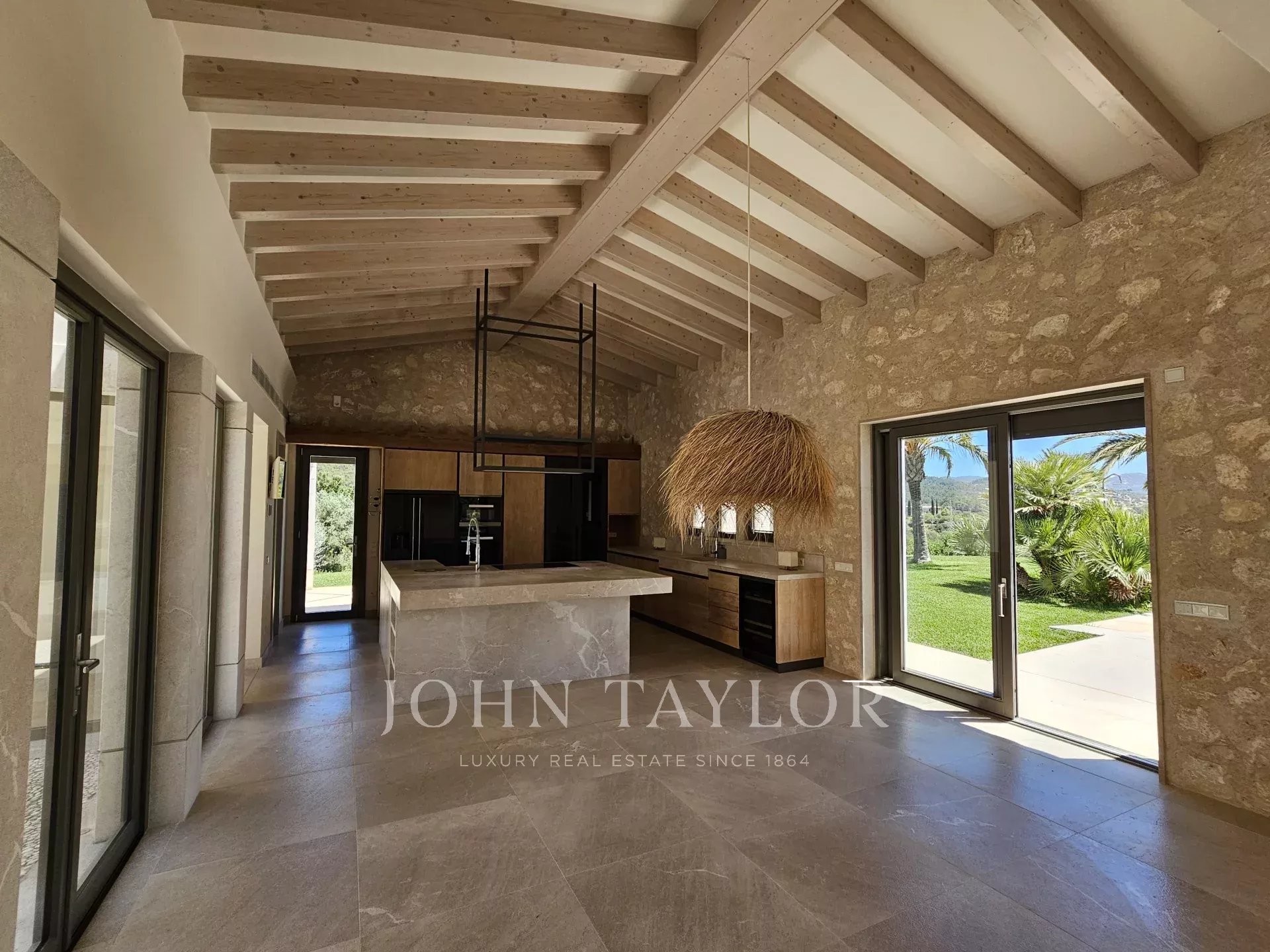 Nestled on a generous elevated plot near the village of Es Capdellà, Calvià, this stunning countryside villa offers tranquility, privacy, and the convenience of village amenities just a short stroll away. Carefully designed with high-quality materials, this single-level property boasts two interior courtyards that flood the space with natural light and a cool breeze. The grand vaulted ceilings with exposed beams enhance the feeling of spaciousness in the living areas, while the breathtaking 360-degree views of the mountains and landscape can be enjoyed from every room. The interior features a sophisticated kitchen with integrated appliances, five spacious bedrooms including a magnificent master suite, and three bathrooms. Additionally, a versatile multifunctional room in the basement can serve as a gym, games room, staff quarters, or home theater. One of the highlights of the property is a beautiful rustic barn transformed into a guest house. Outside, the property is surrounded by gardens and various terraces, including a barbecue area, and boasts fruit trees such as olive, almond, orange, and lemon, as well as a luxurious pool with sunbathing area. Other features include two private wells, reversible air conditioning, underfloor heating (heat pump), and top-quality materials and finishes throughout. Located just 20 minutes from Palma and its airport, Calvià offers beautiful beaches, modern infrastructure, and a charming old-town feel, making it a popular destination for visitors and foreign residents. With a mild and stable climate, averaging 30ºC in summer and 14ºC in winter, and around 300 days of sunshine per year, this property presents an exceptional opportunity to enjoy the best of rural living with easy access to urban conveniences.