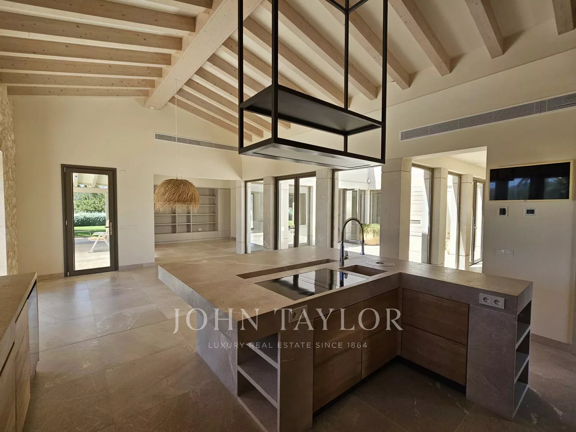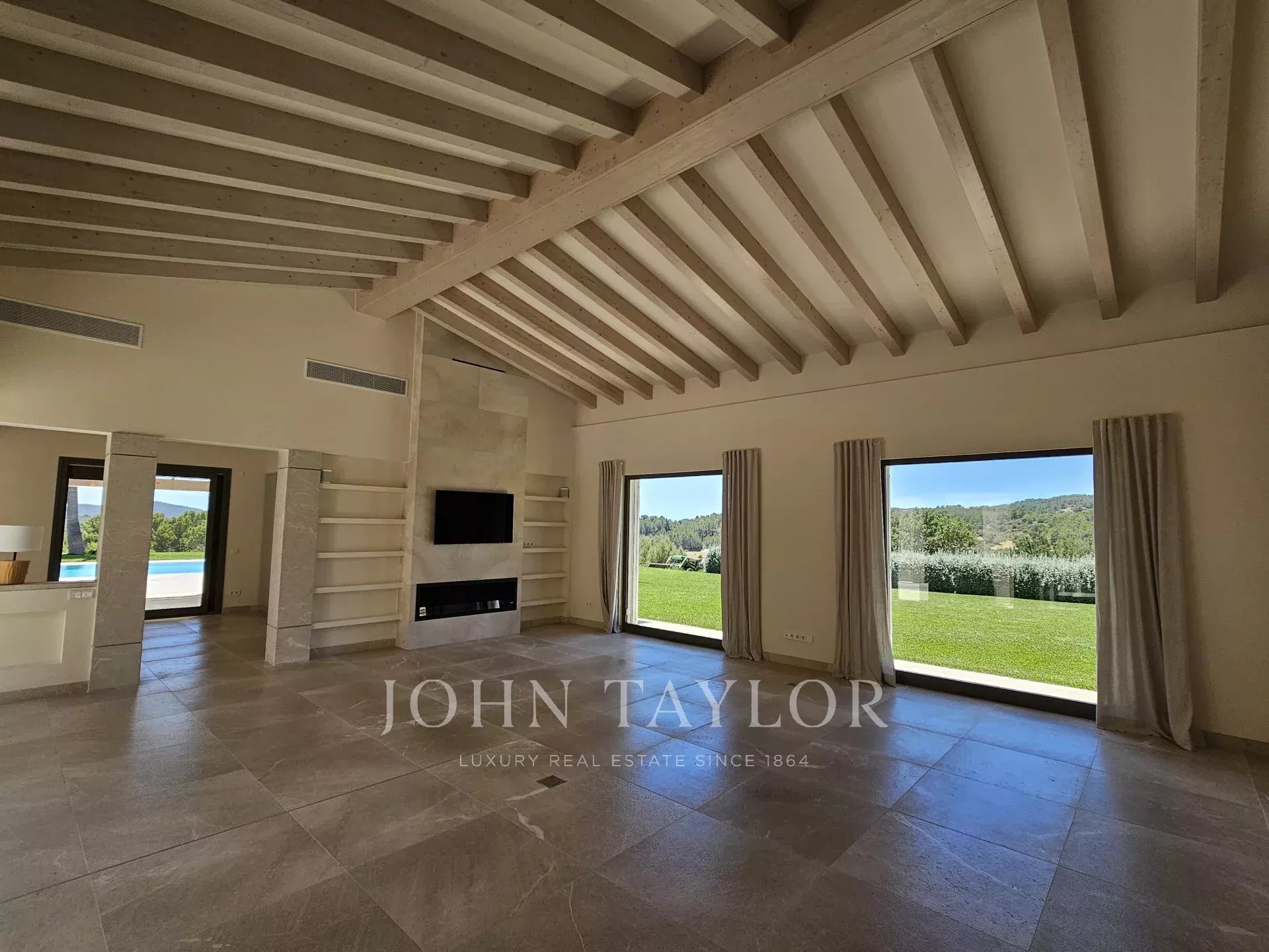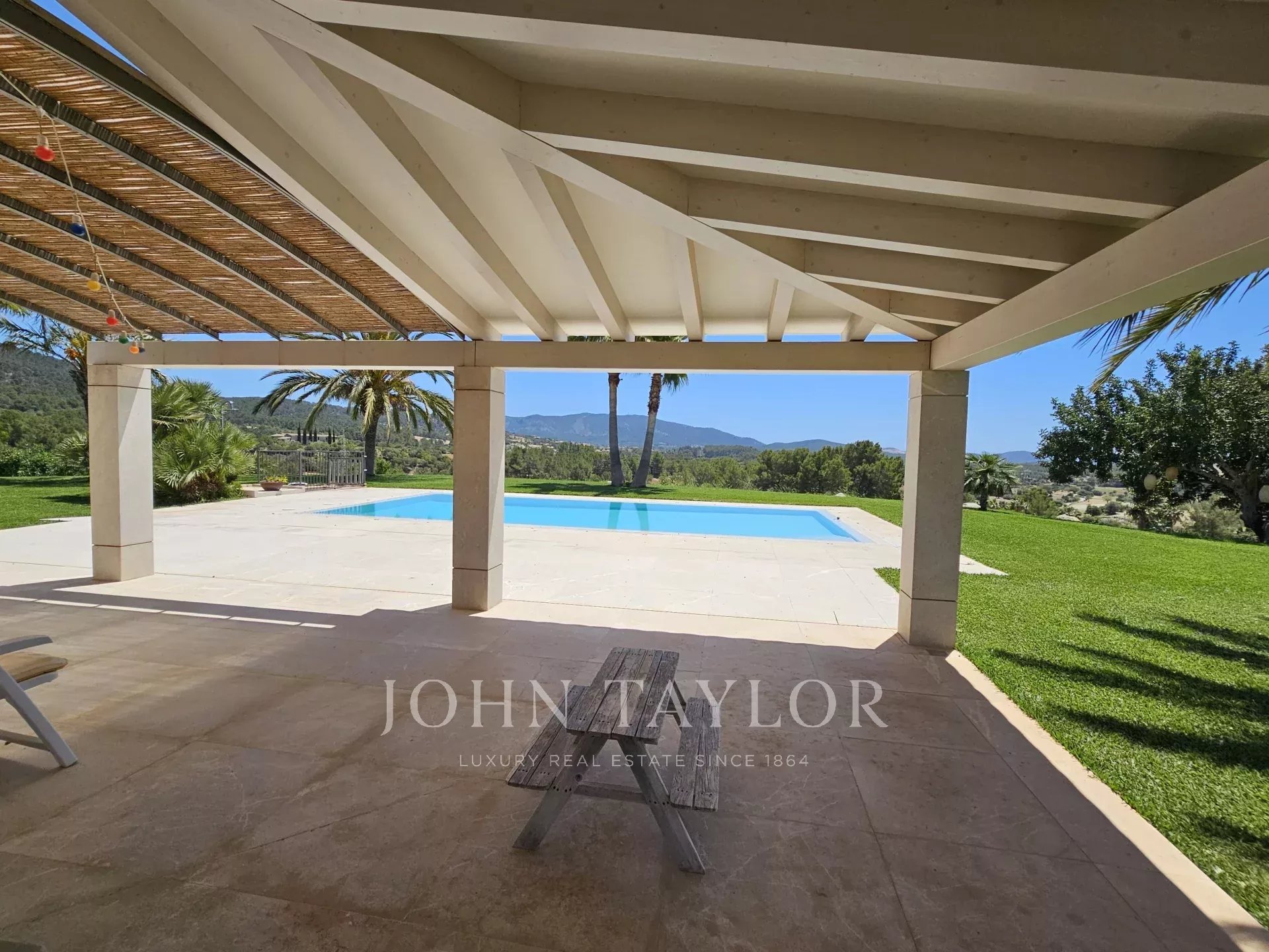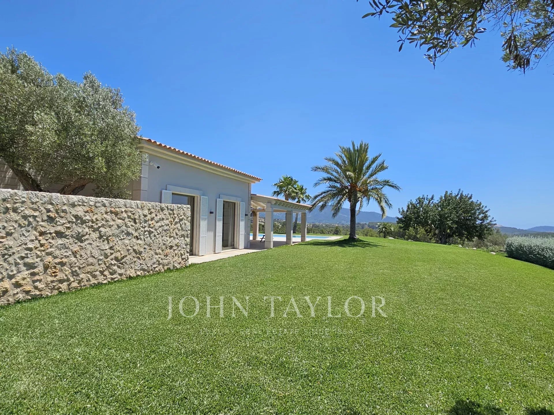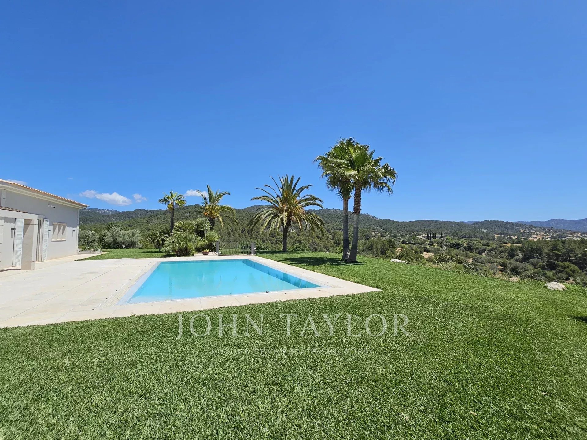 Nestled on a generous elevated plot near the village of Es Capdellà, Calvià, this stunning countryside villa offers tranquility, privacy, and the convenience of village amenities just a short stroll away. Carefully designed with high-quality materials, this single-level property boasts two interior courtyards that flood the space with natural light and a cool breeze. The grand vaulted ceilings with exposed beams enhance the feeling of spaciousness in the living areas, while the breathtaking 360-degree views of the mountains and landscape can be enjoyed from every room. The interior features a sophisticated kitchen with integrated appliances, five spacious bedrooms including a magnificent master suite, and three bathrooms. Additionally, a versatile multifunctional room in the basement can serve as a gym, games room, staff quarters, or home theater. One of the highlights of the property is a beautiful rustic barn transformed into a guest house. Outside, the property is surrounded by gardens and various terraces, including a barbecue area, and boasts fruit trees such as olive, almond, orange, and lemon, as well as a luxurious pool with sunbathing area. Other features include two private wells, reversible air conditioning, underfloor heating (heat pump), and top-quality materials and finishes throughout. Located just 20 minutes from Palma and its airport, Calvià offers beautiful beaches, modern infrastructure, and a charming old-town feel, making it a popular destination for visitors and foreign residents. With a mild and stable climate, averaging 30ºC in summer and 14ºC in winter, and around 300 days of sunshine per year, this property presents an exceptional opportunity to enjoy the best of rural living with easy access to urban conveniences.