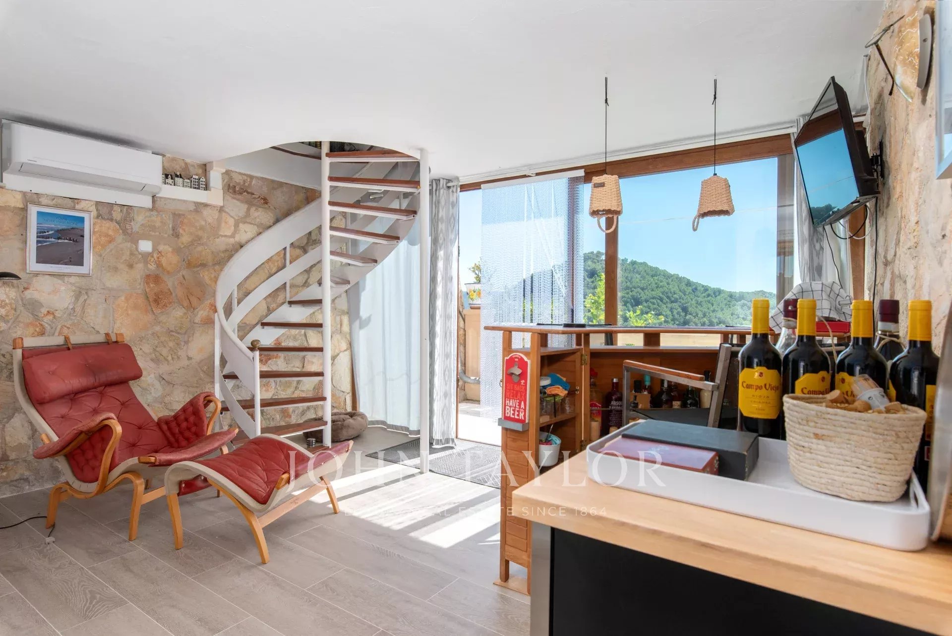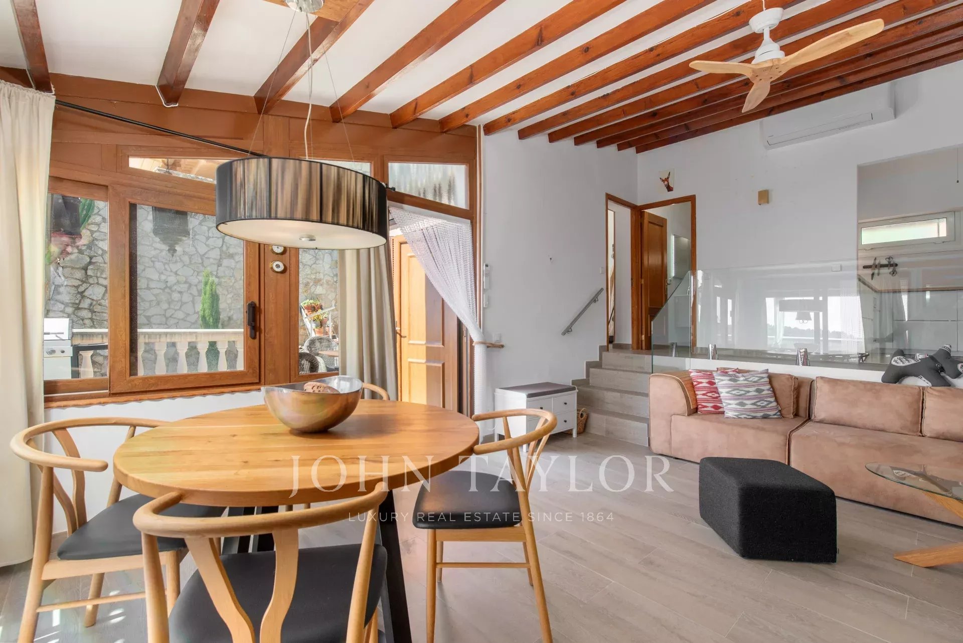 This cozy property combines the charm of traditional style with a modern interior and renovated in 2019. Located in a quiet cul-de-sac on the outskirts of the picturesque village of Es Capdellà, it offers a serene atmosphere and spectacular views of both the mountains and the sea. The house is distributed over two floors, each with south-facing terraces that invite you to enjoy the sun and the breathtaking panoramic views. Behind the house is the communal pool, ideal for cooling off on warmer days. From the private parking space is accessed by stone stairs to the upper floor, where a bright living-dining room with access to a large partly covered terrace with barbecue area, a fully equipped semi-open kitchen, a double bedroom with fitted closets and a bathroom with shower are located. A spiral staircase connects to the lower floor, which houses a spacious double bedroom, a bathroom with shower and an additional room that functions as a third bedroom, also with access to a private terrace with dream views. If you are looking for a vacation home with character, surrounded by tranquility and nature, but at the same time just a few minutes from the village, this property is a unique opportunity that you should not miss.