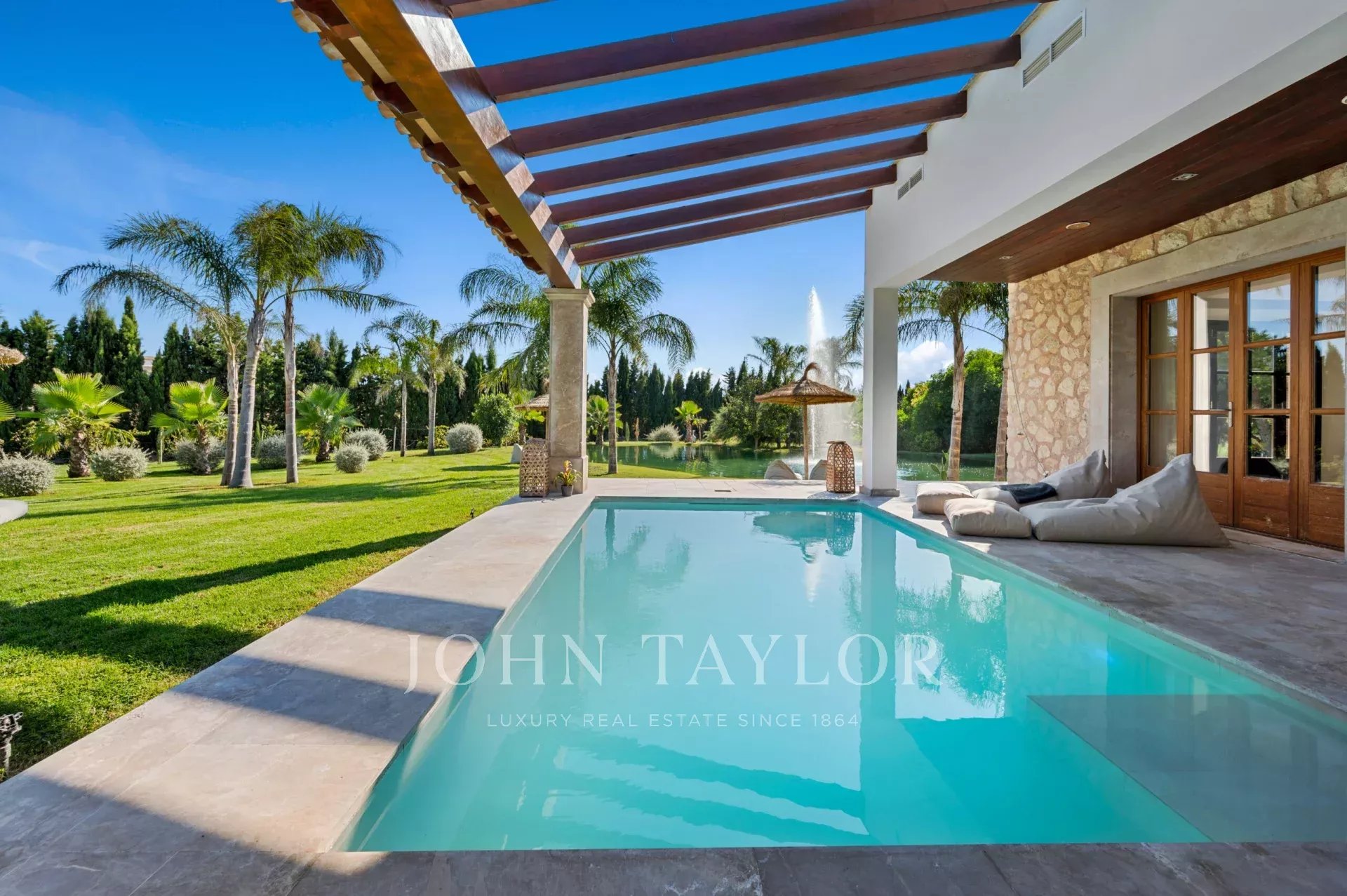 This spectacular property is located in the heart of the beautiful island of Mallorca, in Montuïri. It offers a unique opportunity both for those looking for a luxurious family home and for those interested in making a wise investment in the luxury real estate sector. The Finca, built in 2008 and refurbished in 2023, has had a holiday license in place since November 2018, making it a perfect option for both living and generating income through holiday rentals. The constructed area is 1,166 m², on a plot of 20,899 m², with the main house occupying 537 m² distributed over two floors and a large basement. The house has six spacious bedrooms, all equipped with high-speed WLAN and intelligent sound system, as well as six luxurious bathrooms. The house also has an elegant office and a wine cellar on the mezzanine floor. In addition to the main house, the estate has a separate guest apartment with its own living room, kitchen and bathroom, ideal for entertaining friends and family in complete privacy. All the materials used in the construction of the house are top of the range, including Binissalem stone floors, and it is equipped with ducted air conditioning, underfloor heating, and a heat pump, guaranteeing optimum comfort all year round. To improve energy efficiency, the property has 21 solar panels, which contributes to low energy consumption. It also has a private water well that guarantees an independent water supply. Outside, the property stands out for its spectacular landscaped garden surrounded by spacious terraces, a luxurious swimming pool, and an artificial lake that adds a unique and relaxing touch to the surroundings. Undoubtedly, a true jewel in Mallorca, combining modernity with tradition and offering an exclusive and private environment.