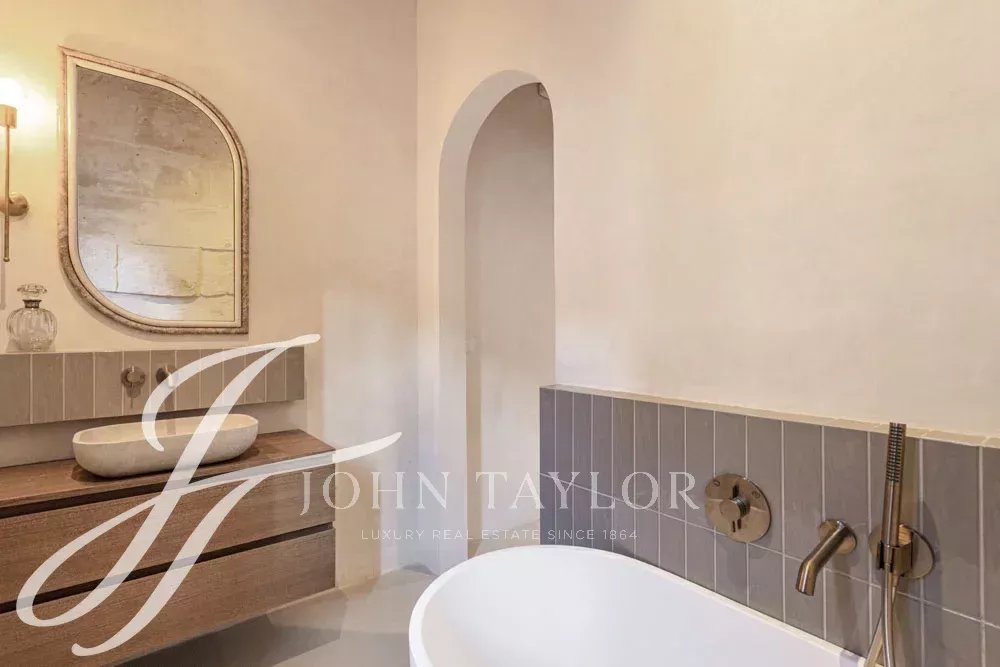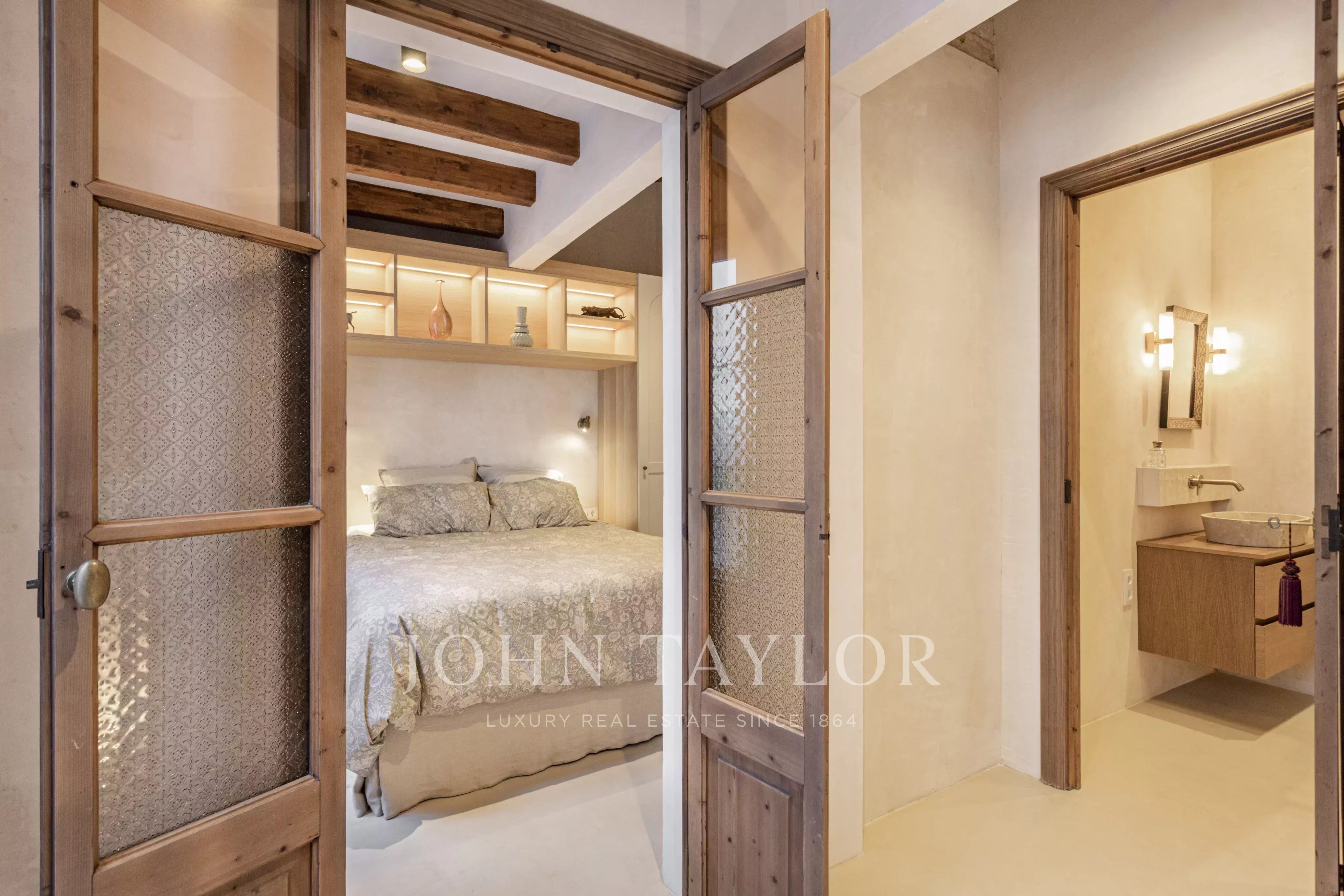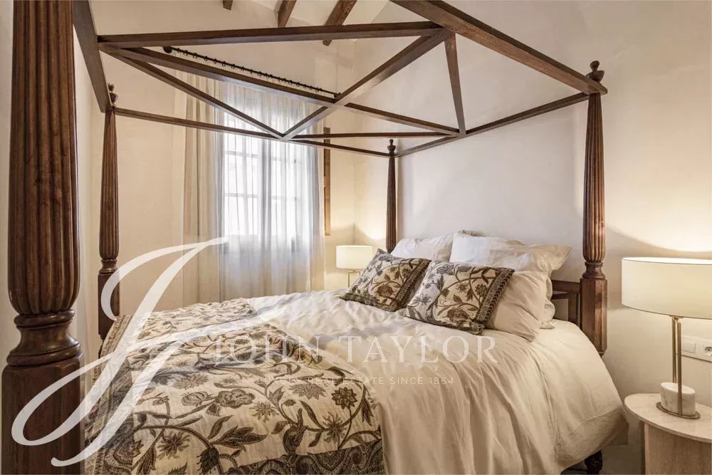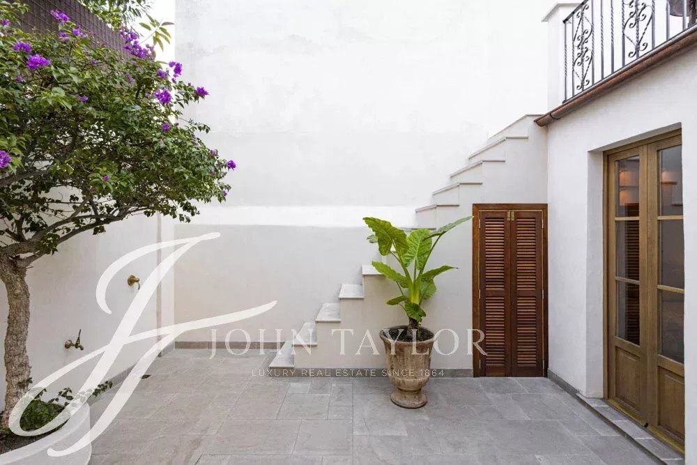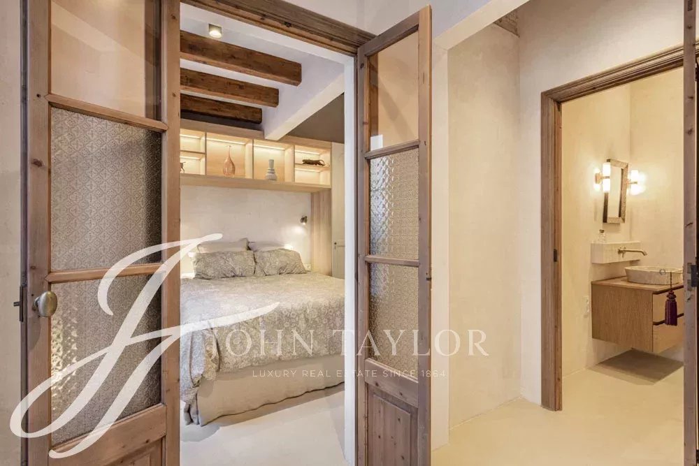 High-quality materials and finishes have been carefully selected throughout, including microcement floors, underfloor heating, and air conditioning. The renovation has been carried out with great respect for the original elements, preserving the authentic doors and original glass panes, which create a unique play of light and reinforce the home’s timeless character.