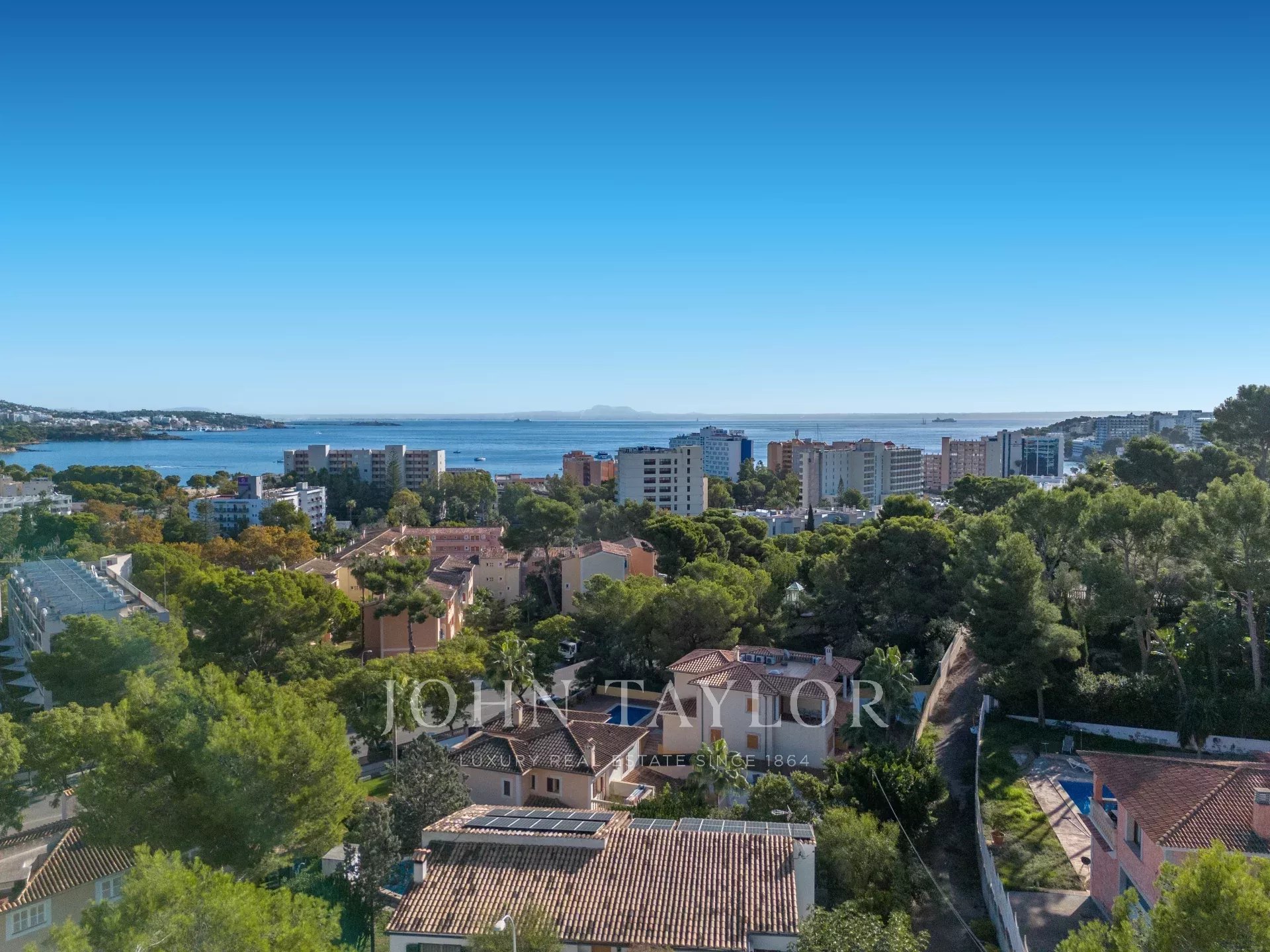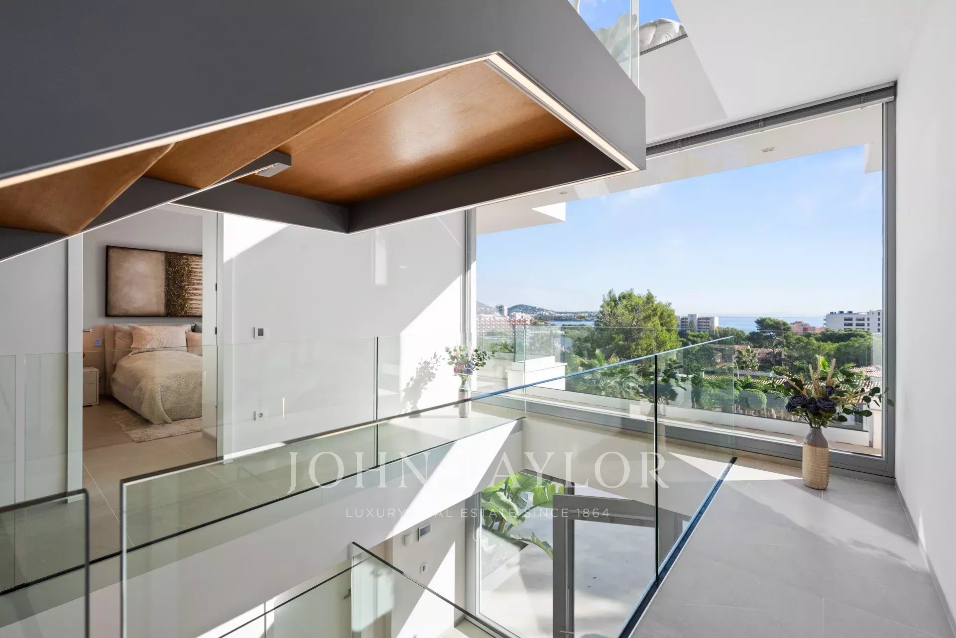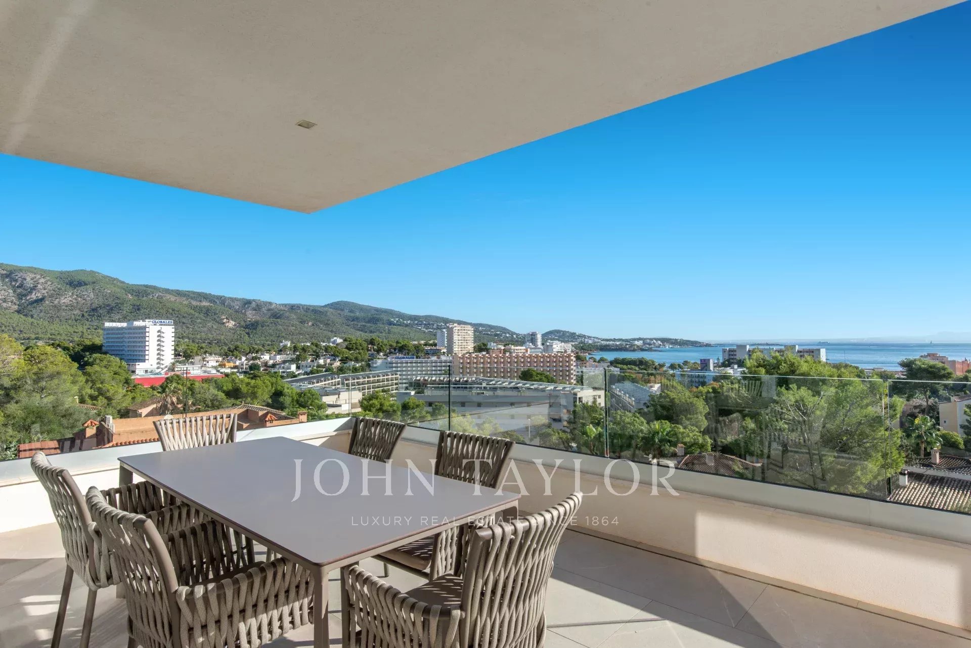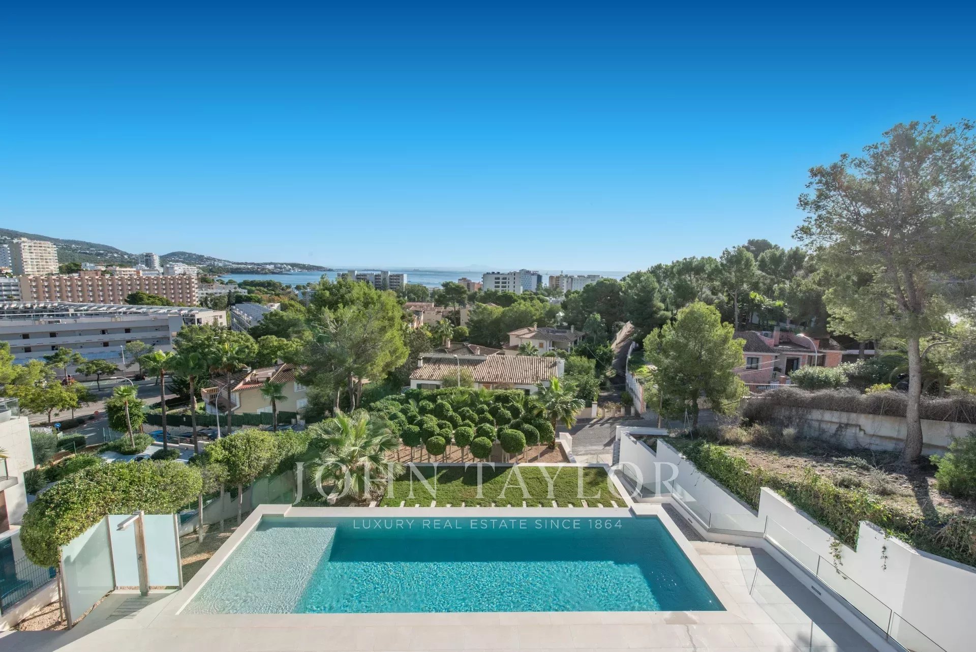 In an elevated position and surrounded by tranquility, this minimalist style luxury villa stands as a haven of design and comfort in an exclusive cul-de-sac next to a green area. Its southeast orientation allows you to enjoy sunlight throughout the day and partial sea views that provide an unparalleled Mediterranean atmosphere. Situated on a generous plot of approximately 1,220 m², it is located just a few minutes walk from the vibrant center of Palmanova and its three fine sandy beaches. Built in 2020, the property combines contemporary elegance with top quality materials and advanced technology. The upper floor invites you to enjoy an open and bright space, where living room, dining room and custom-made designer kitchen are integrated to perfection. From the large covered terrace you access the roof terrace, prepared with pre-installation for an outdoor kitchen, ideal for unforgettable evenings outdoors. The main floor houses four bedrooms, all with en suite bathrooms and access to a covered terrace that surrounds the house. On the pool level, a fifth bedroom - currently a gymnasium - complements the comfort of the villa, along with a double garage, laundry room, technical room and an additional bathroom. A panoramic elevator elegantly connects all levels of the house. The villa offers the highest level of comfort with salt water swimming pool, underfloor heating, air conditioning hot/cold, heat pump, domotic system, alarm and elevator with access to all floors. A modern residence, in a serene yet perfectly communicated environment - just minutes away from stores, restaurants and the sea - that perfectly embodies the most sophisticated Mediterranean lifestyle.