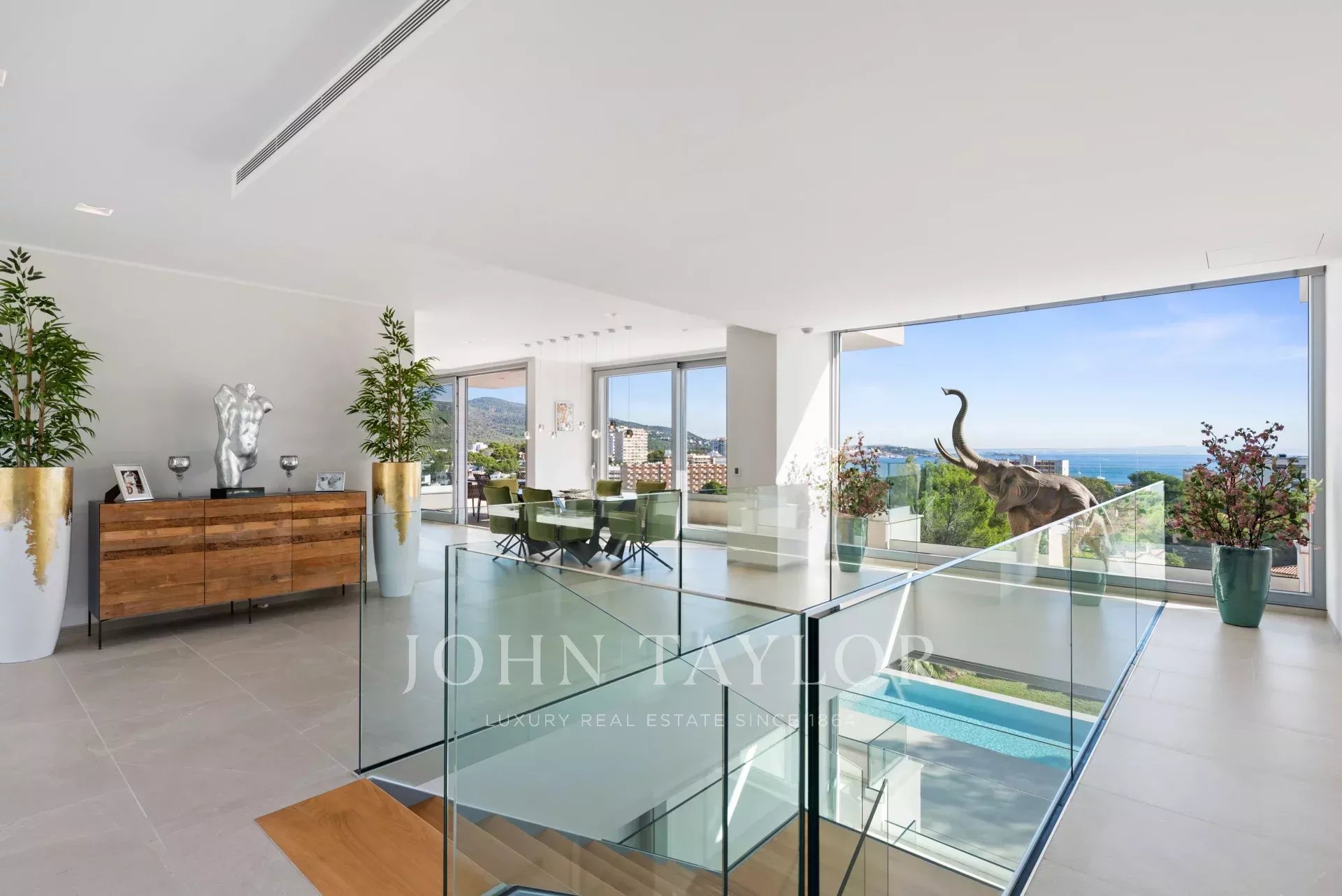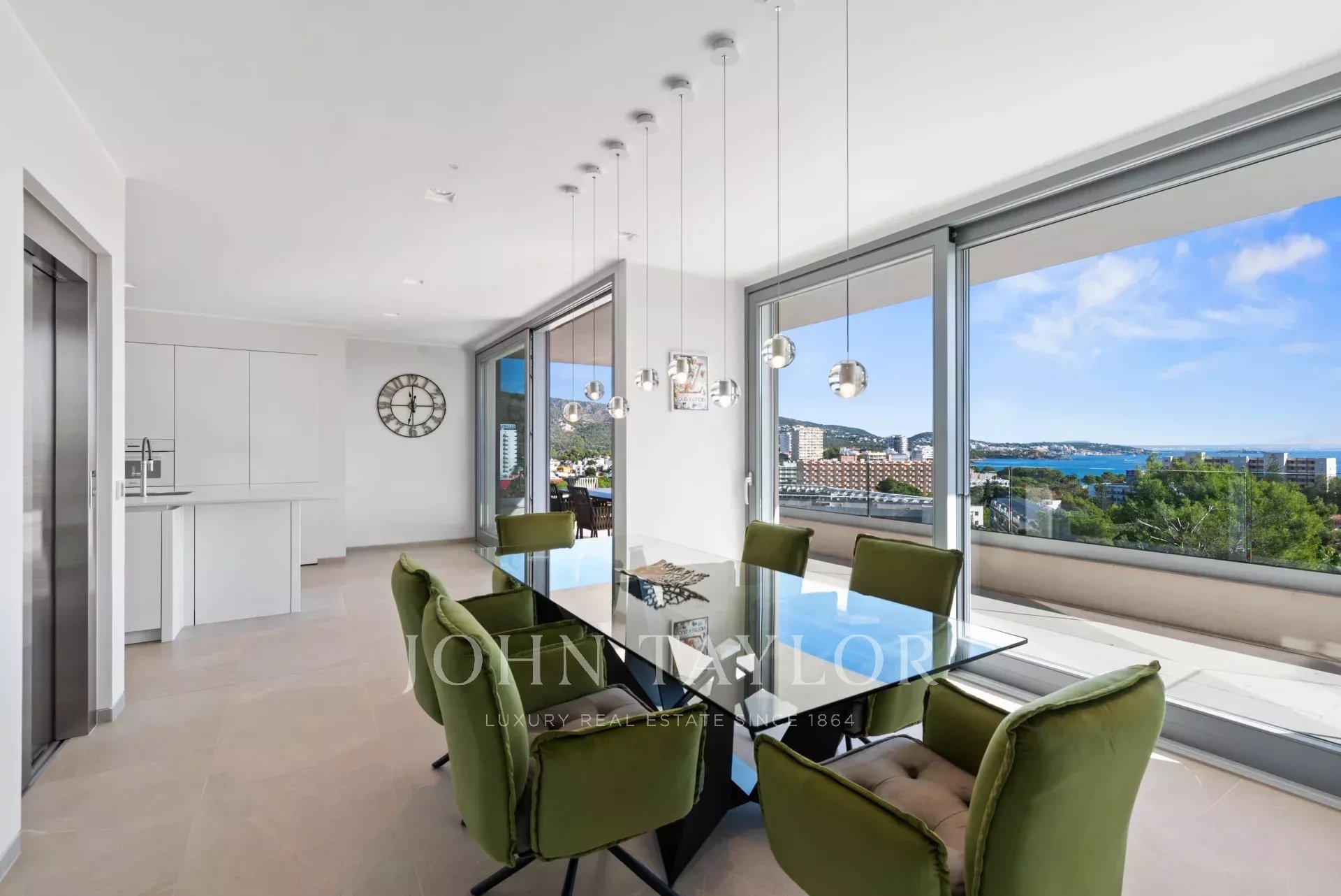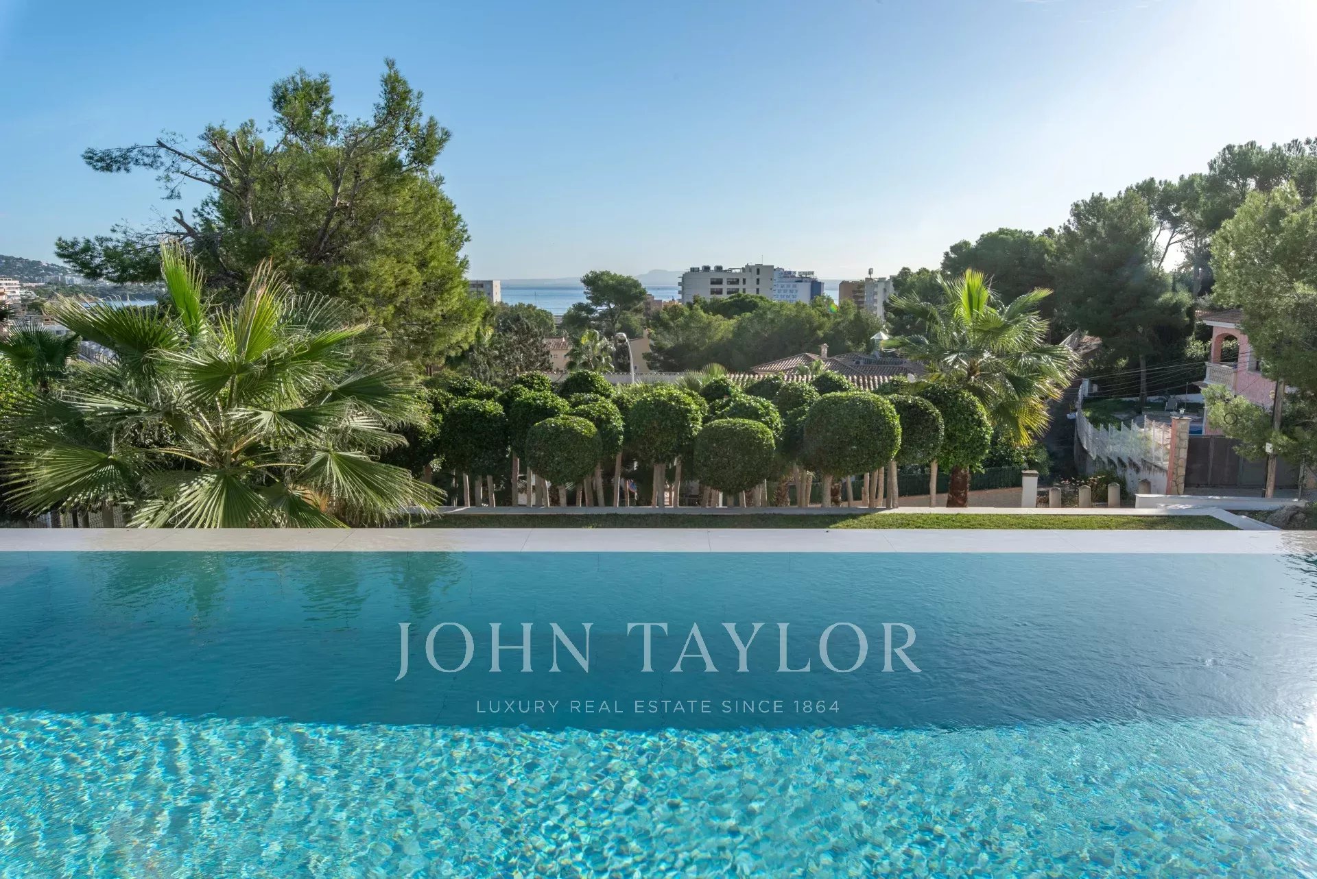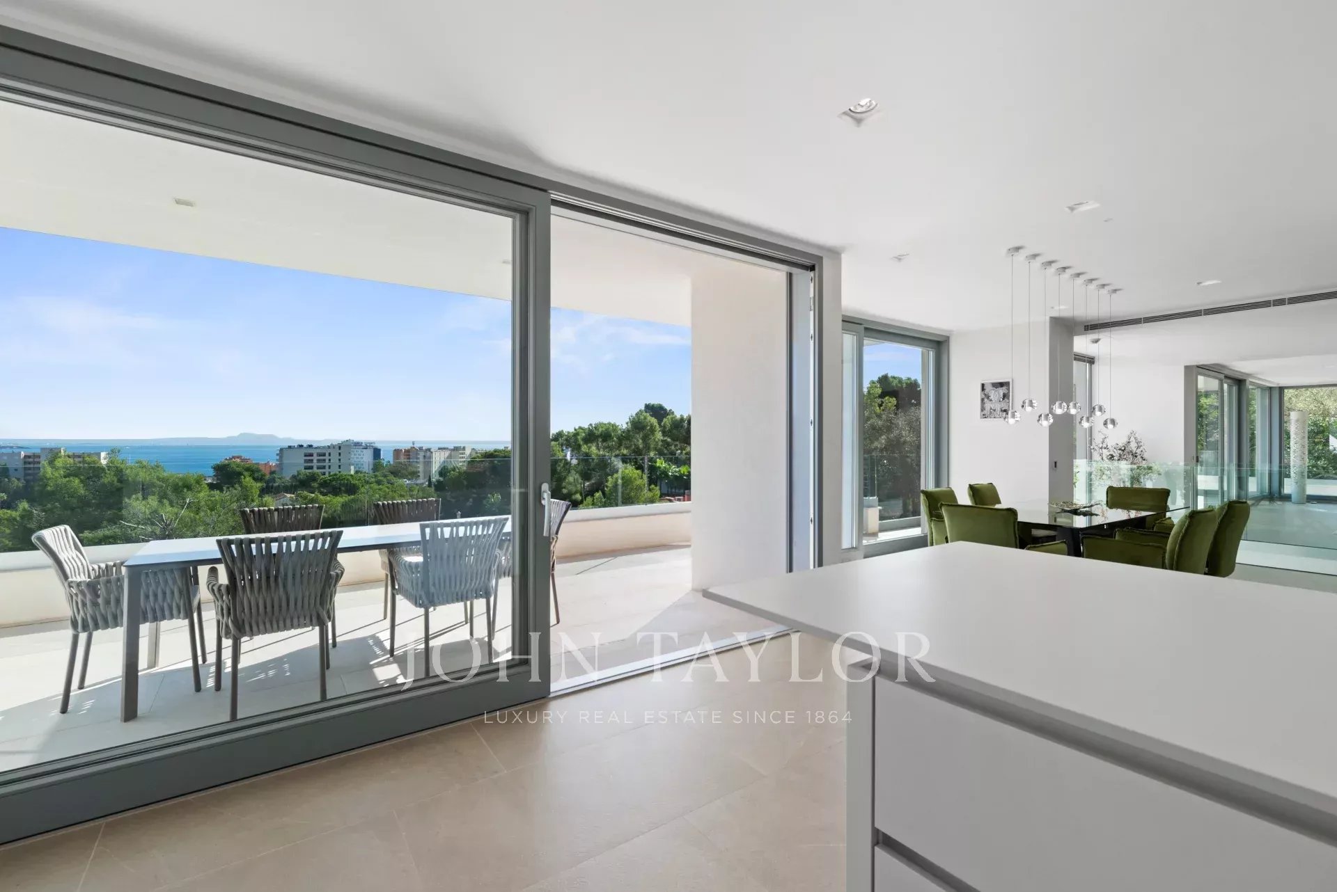 In an elevated position and surrounded by tranquility, this minimalist style luxury villa stands as a haven of design and comfort in an exclusive cul-de-sac next to a green area. Its southeast orientation allows you to enjoy sunlight throughout the day and partial sea views that provide an unparalleled Mediterranean atmosphere. Situated on a generous plot of approximately 1,220 m², it is located just a few minutes walk from the vibrant center of Palmanova and its three fine sandy beaches. Built in 2020, the property combines contemporary elegance with top quality materials and advanced technology. The upper floor invites you to enjoy an open and bright space, where living room, dining room and custom-made designer kitchen are integrated to perfection. From the large covered terrace you access the roof terrace, prepared with pre-installation for an outdoor kitchen, ideal for unforgettable evenings outdoors. The main floor houses four bedrooms, all with en suite bathrooms and access to a covered terrace that surrounds the house. On the pool level, a fifth bedroom - currently a gymnasium - complements the comfort of the villa, along with a double garage, laundry room, technical room and an additional bathroom. A panoramic elevator elegantly connects all levels of the house. The villa offers the highest level of comfort with salt water swimming pool, underfloor heating, air conditioning hot/cold, heat pump, domotic system, alarm and elevator with access to all floors. A modern residence, in a serene yet perfectly communicated environment - just minutes away from stores, restaurants and the sea - that perfectly embodies the most sophisticated Mediterranean lifestyle.
