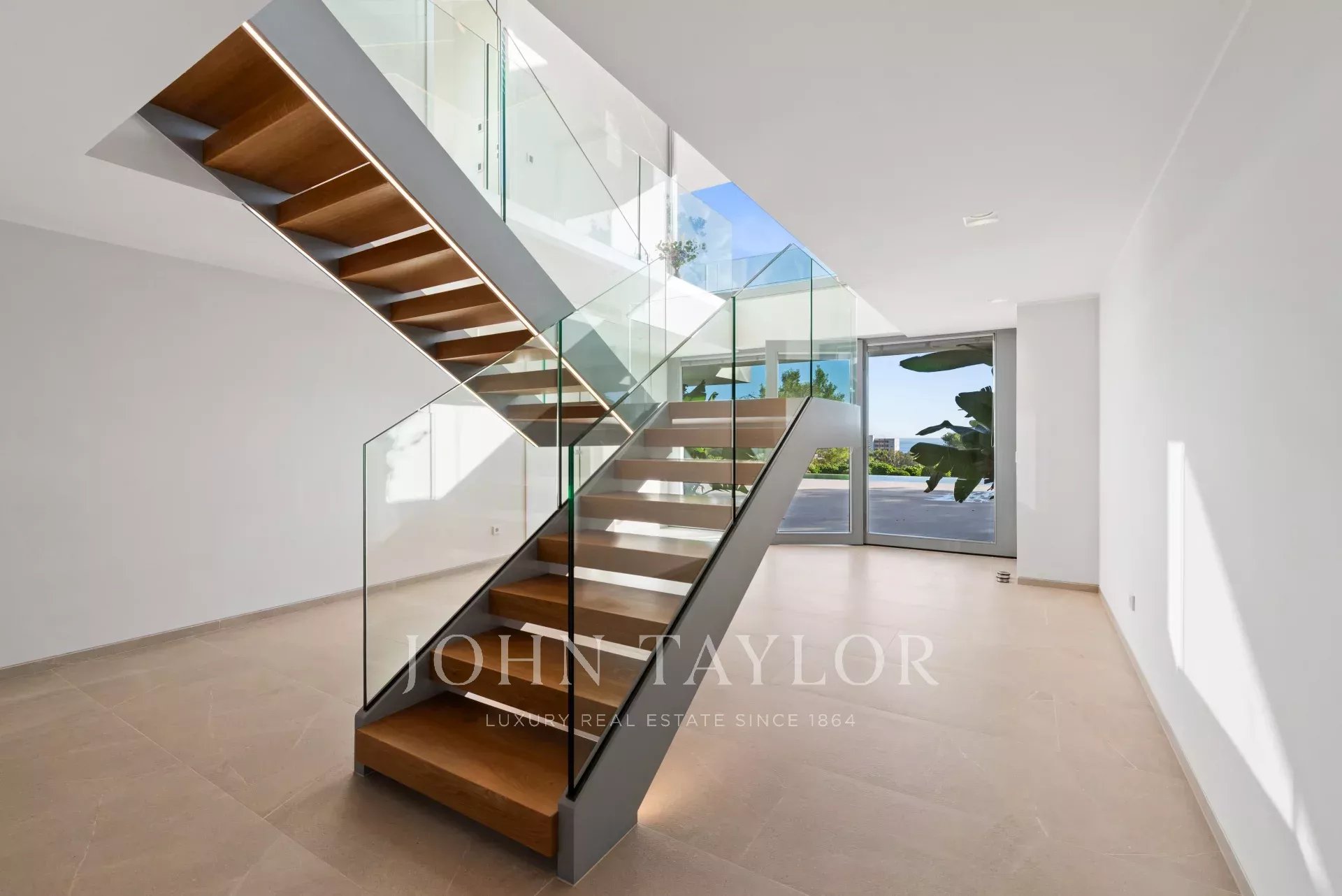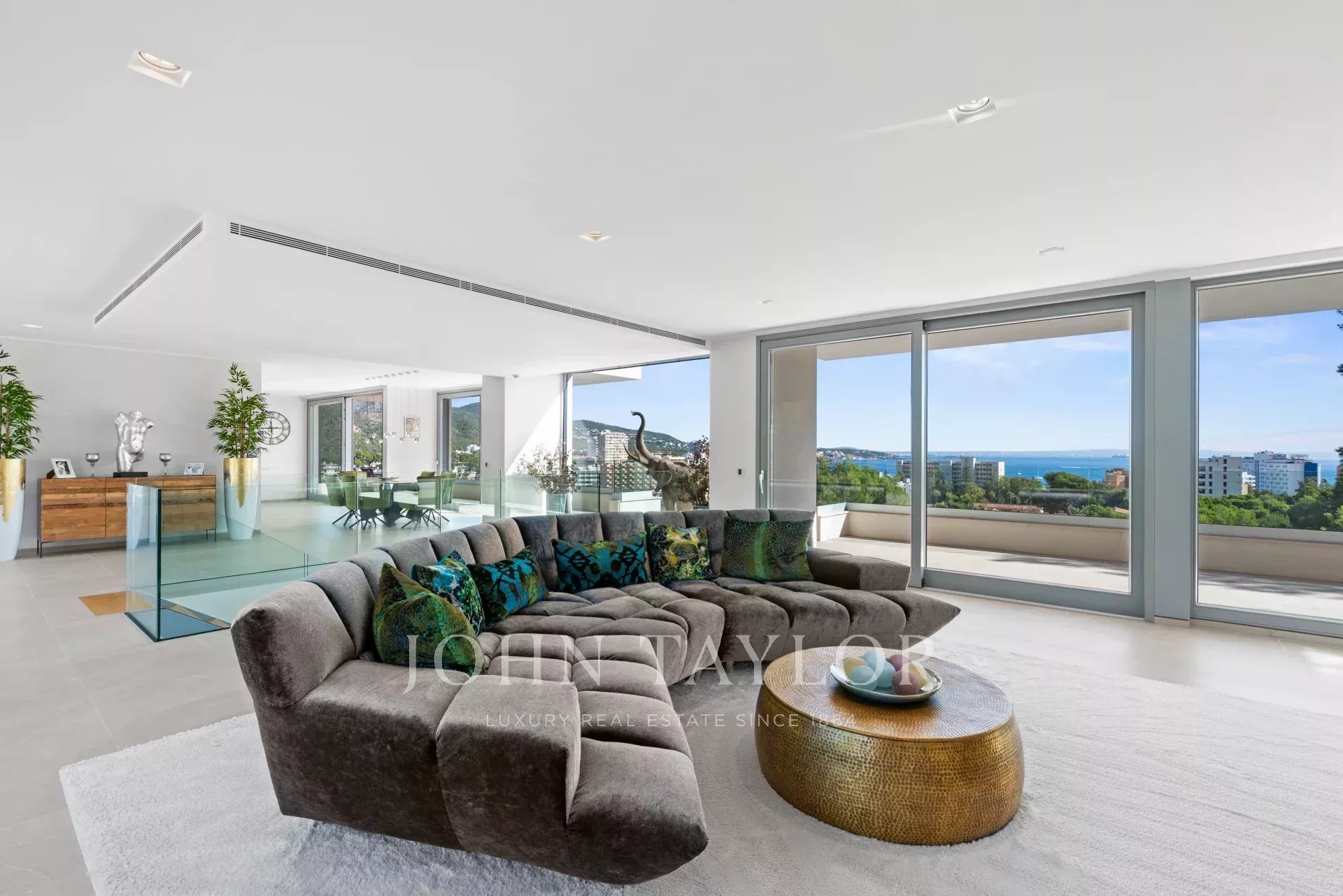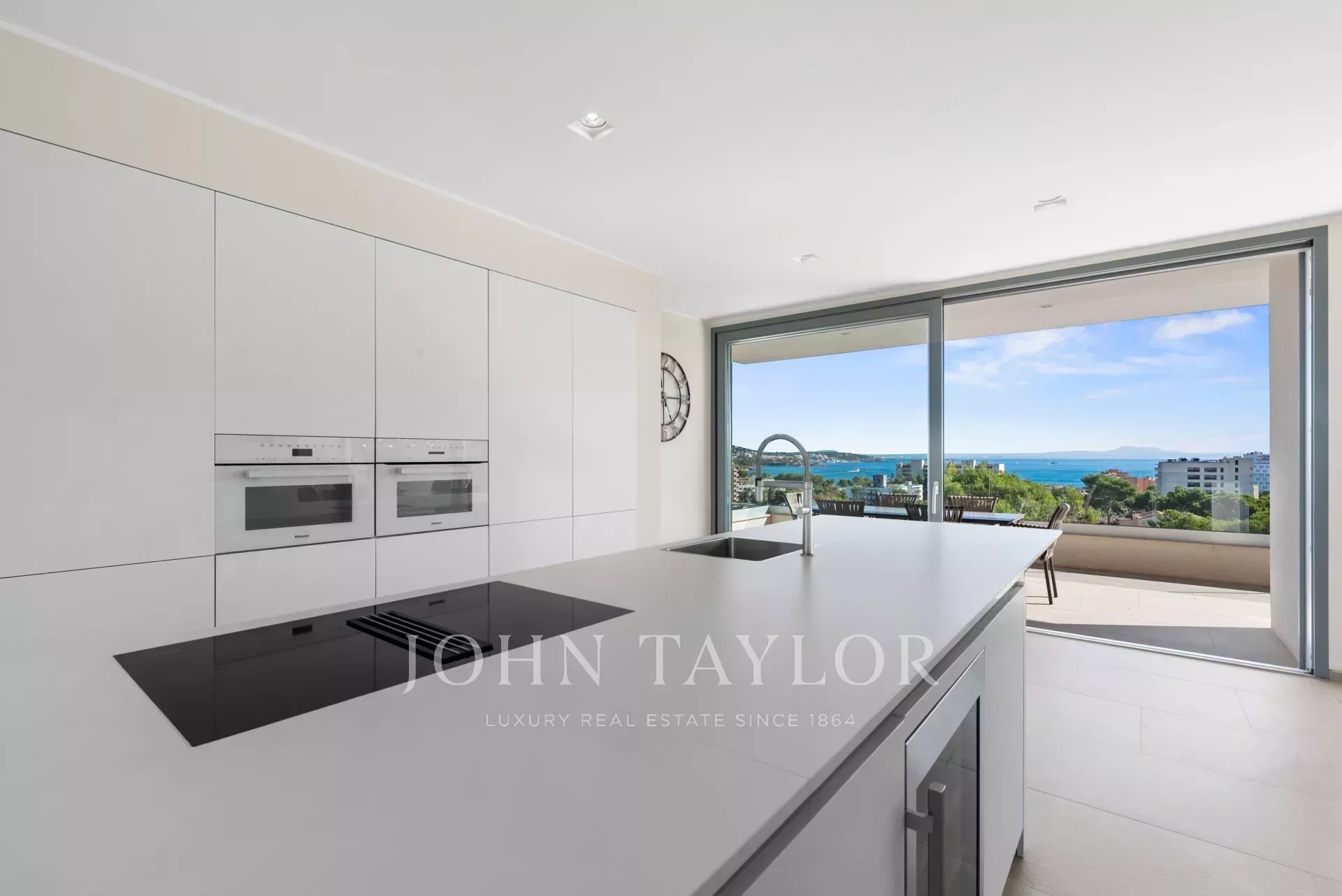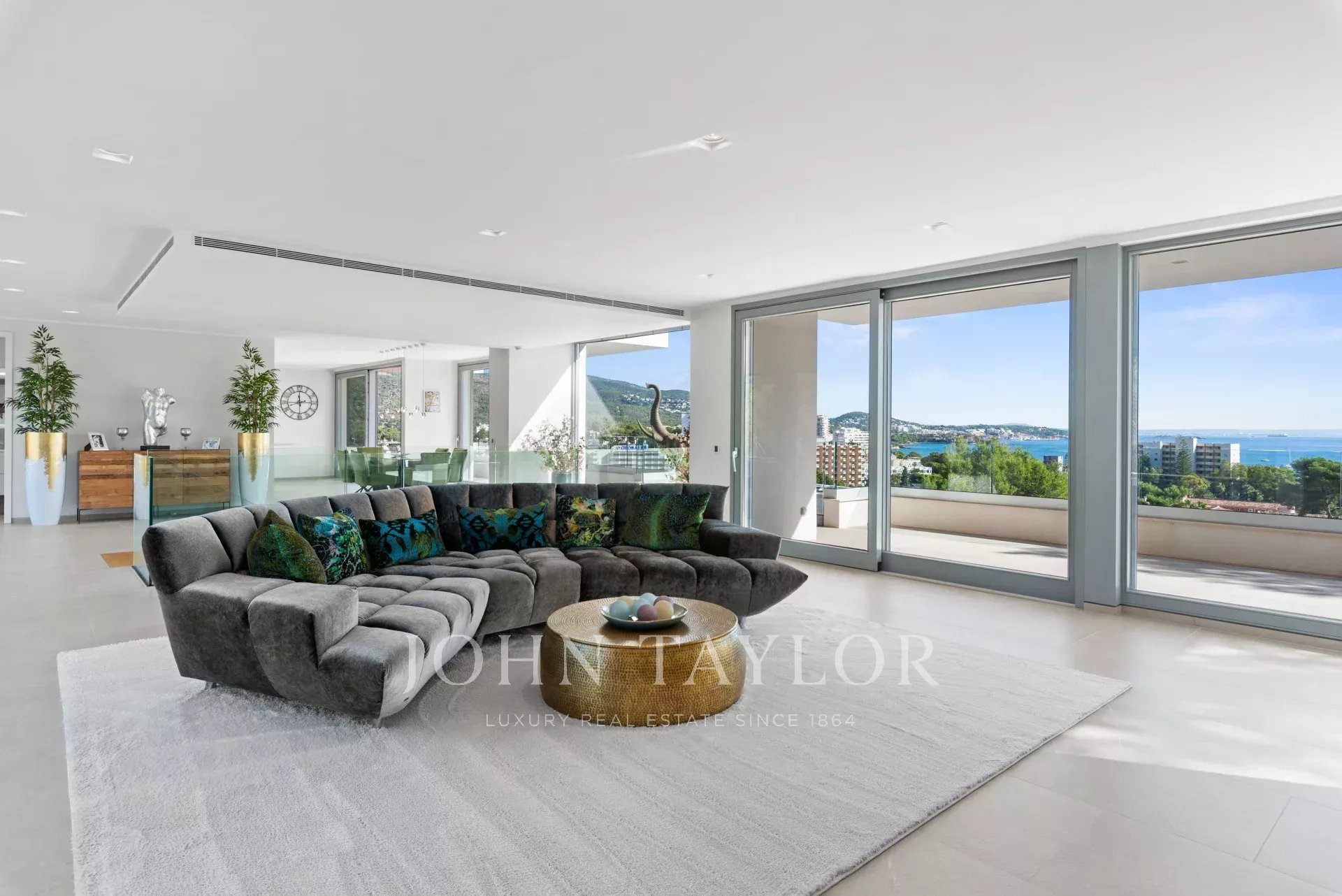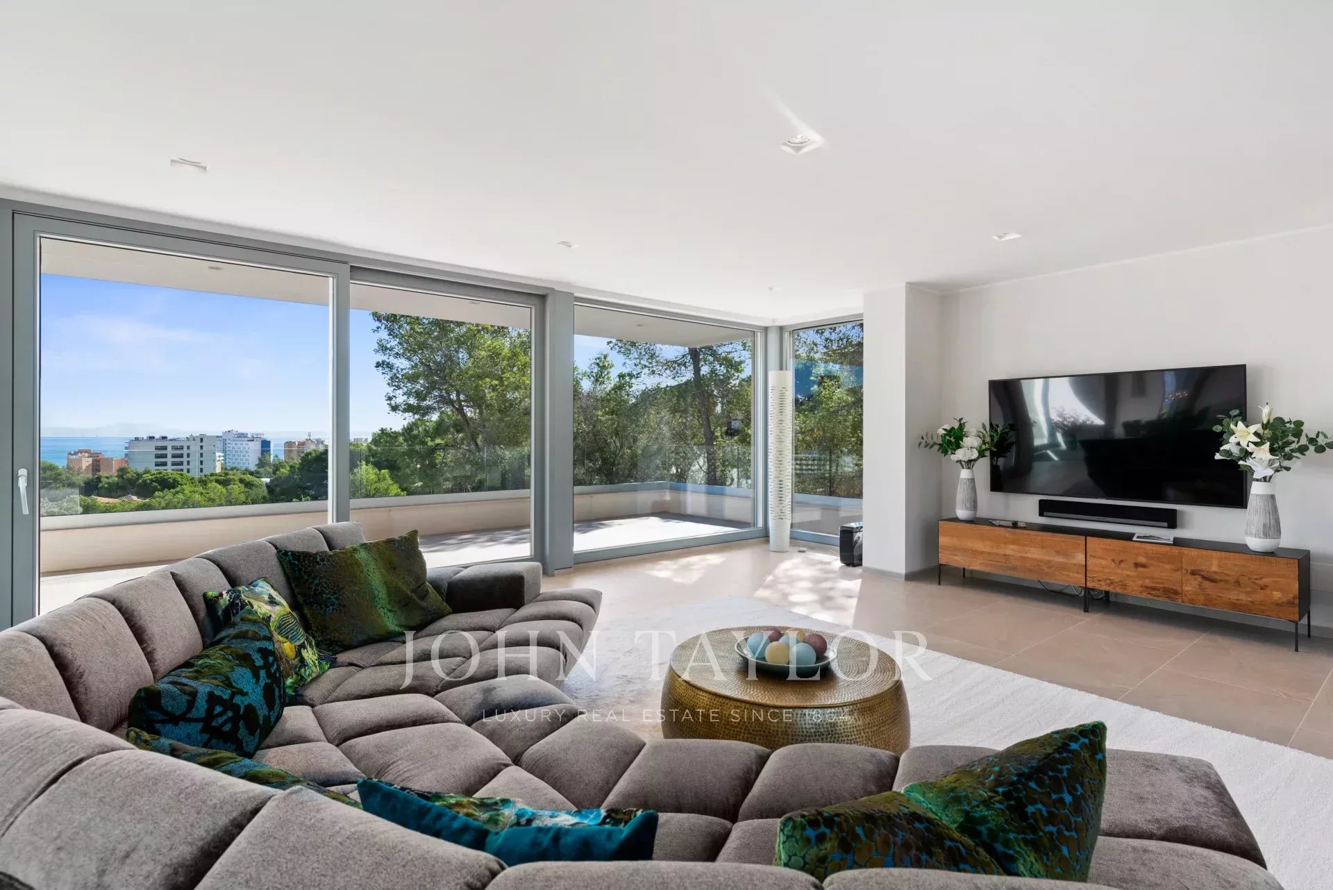 In an elevated position and surrounded by tranquility, this minimalist style luxury villa stands as a haven of design and comfort in an exclusive cul-de-sac next to a green area. Its southeast orientation allows you to enjoy sunlight throughout the day and partial sea views that provide an unparalleled Mediterranean atmosphere. Situated on a generous plot of approximately 1,220 m², it is located just a few minutes walk from the vibrant center of Palmanova and its three fine sandy beaches. Built in 2020, the property combines contemporary elegance with top quality materials and advanced technology. The upper floor invites you to enjoy an open and bright space, where living room, dining room and custom-made designer kitchen are integrated to perfection. From the large covered terrace you access the roof terrace, prepared with pre-installation for an outdoor kitchen, ideal for unforgettable evenings outdoors. The main floor houses four bedrooms, all with en suite bathrooms and access to a covered terrace that surrounds the house. On the pool level, a fifth bedroom - currently a gymnasium - complements the comfort of the villa, along with a double garage, laundry room, technical room and an additional bathroom. A panoramic elevator elegantly connects all levels of the house. The villa offers the highest level of comfort with salt water swimming pool, underfloor heating, air conditioning hot/cold, heat pump, domotic system, alarm and elevator with access to all floors. A modern residence, in a serene yet perfectly communicated environment - just minutes away from stores, restaurants and the sea - that perfectly embodies the most sophisticated Mediterranean lifestyle.