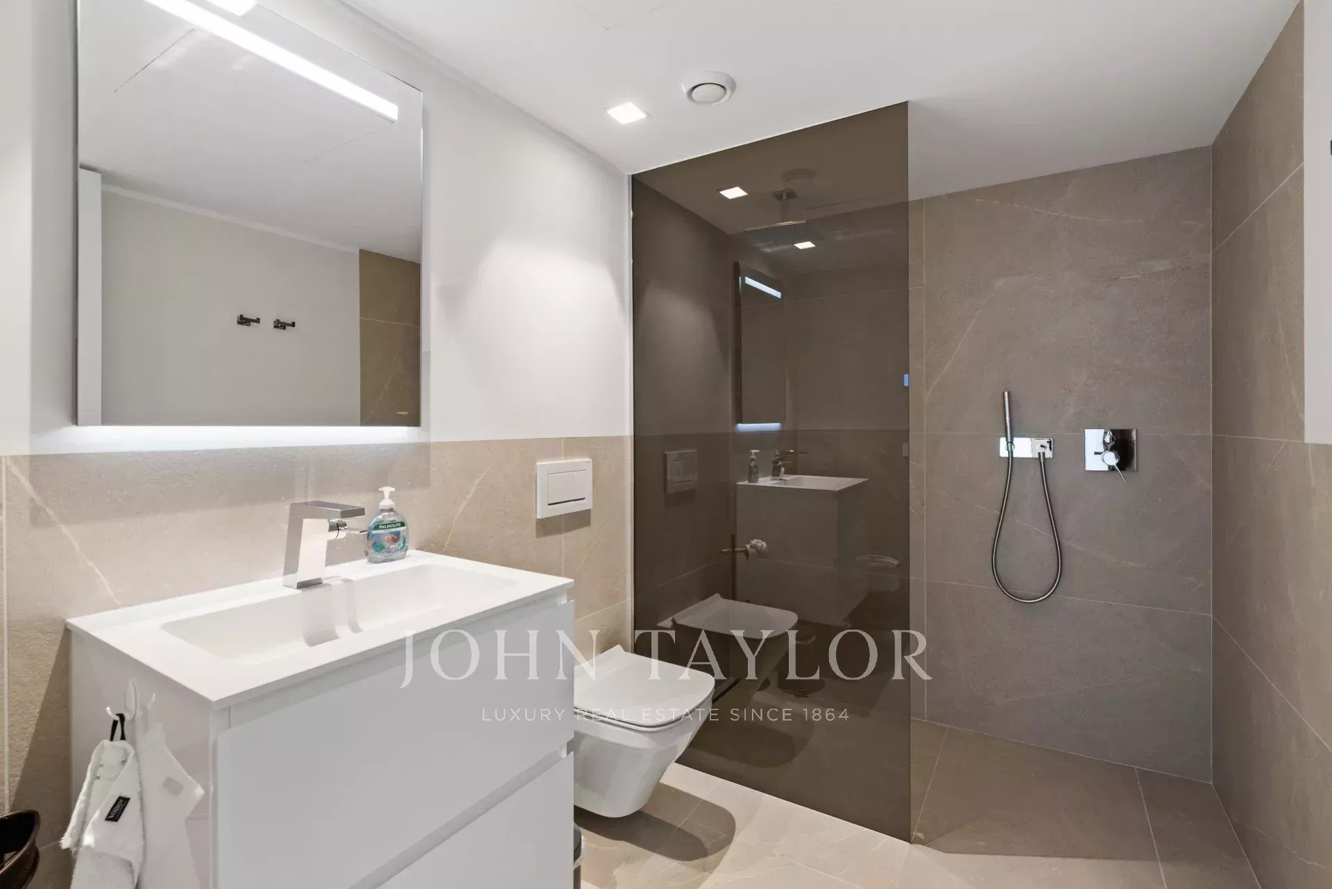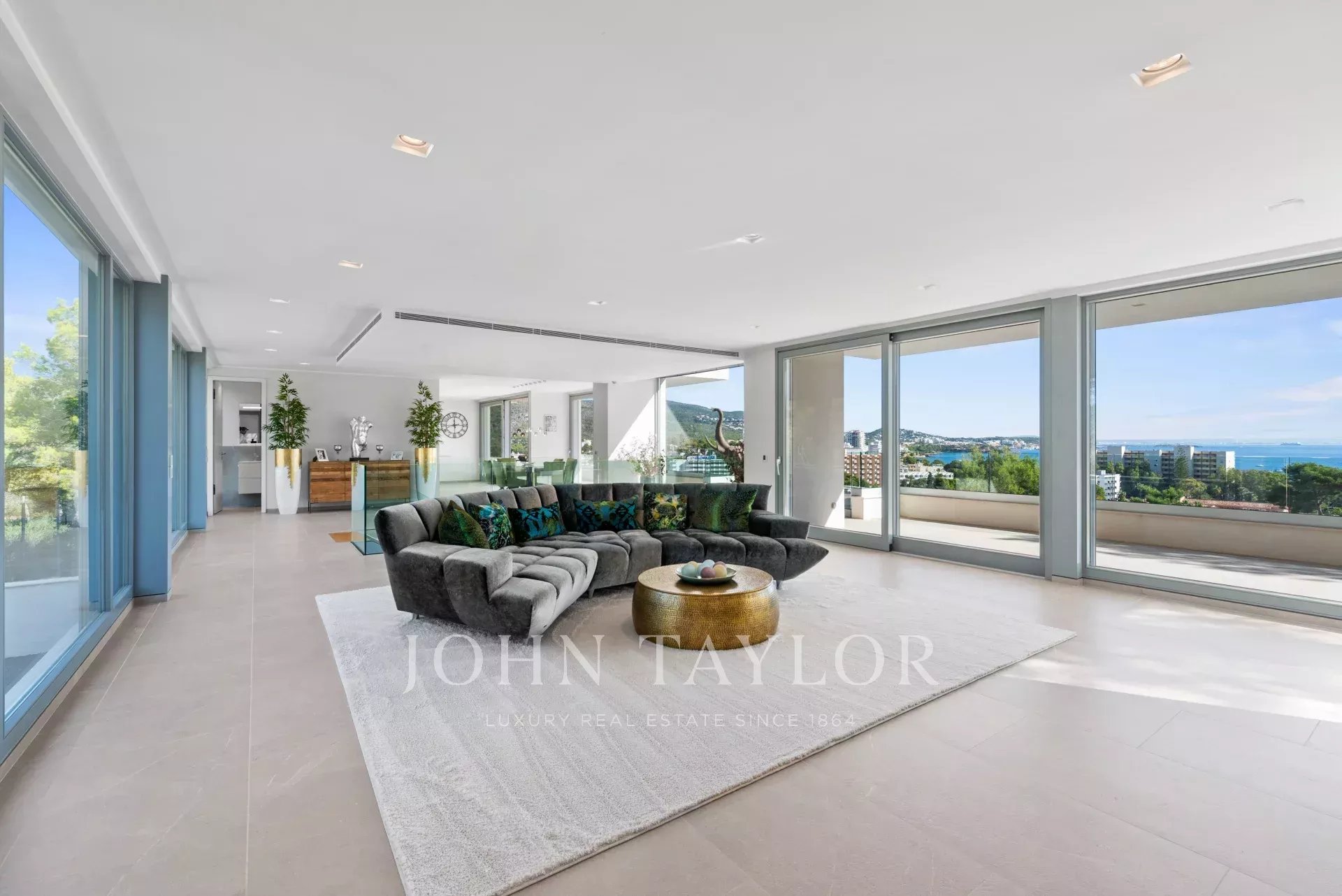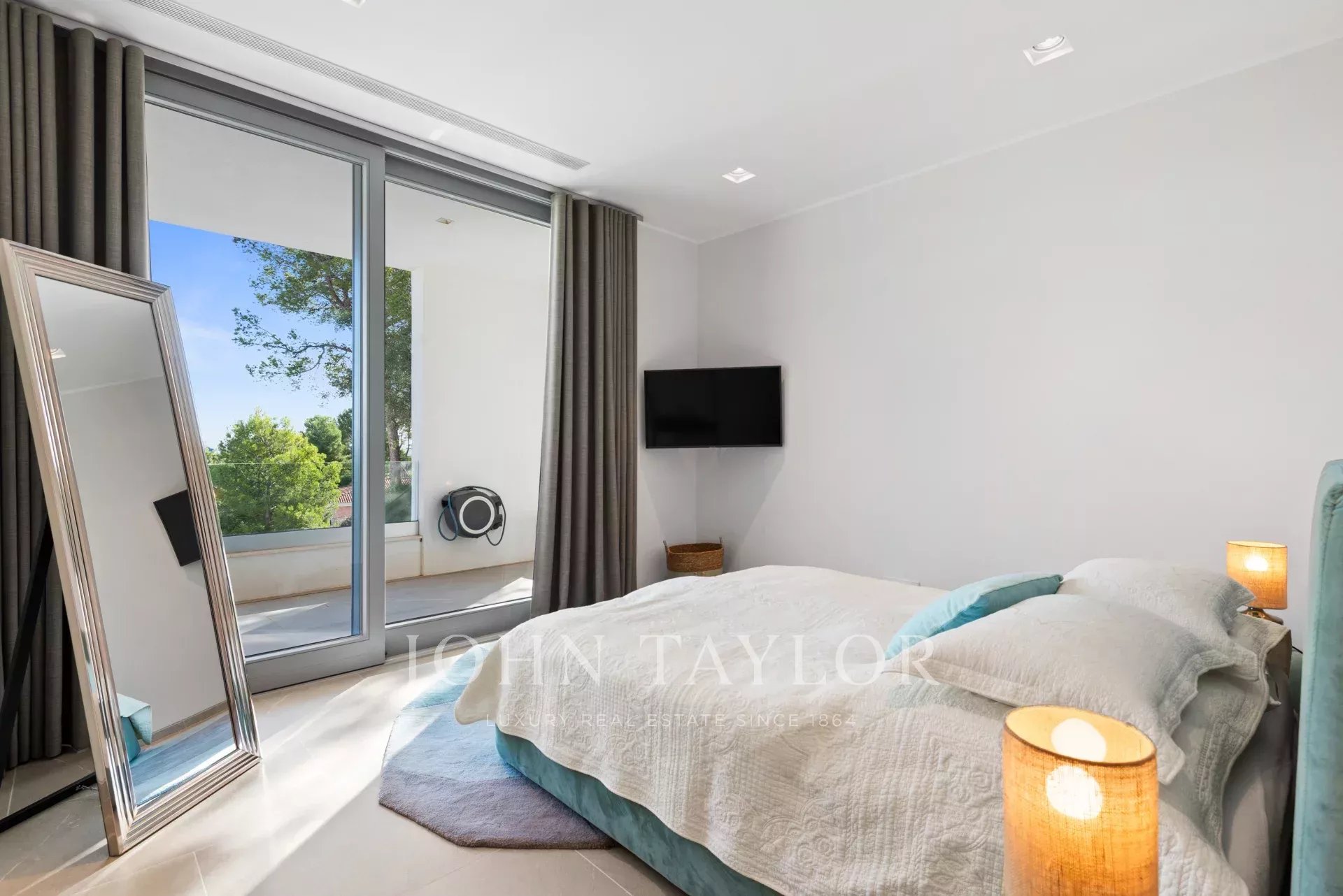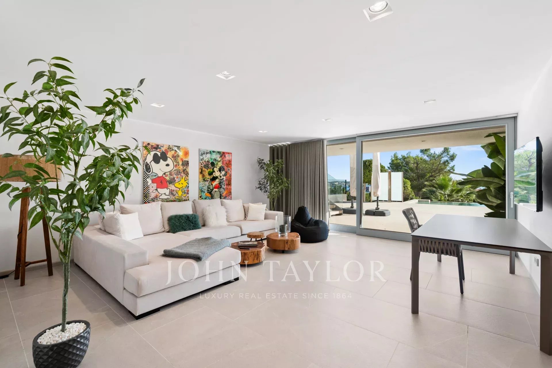 In an elevated position and surrounded by tranquility, this minimalist style luxury villa stands as a haven of design and comfort in an exclusive cul-de-sac next to a green area. Its southeast orientation allows you to enjoy sunlight throughout the day and partial sea views that provide an unparalleled Mediterranean atmosphere. Situated on a generous plot of approximately 1,220 m², it is located just a few minutes walk from the vibrant center of Palmanova and its three fine sandy beaches. Built in 2020, the property combines contemporary elegance with top quality materials and advanced technology. The upper floor invites you to enjoy an open and bright space, where living room, dining room and custom-made designer kitchen are integrated to perfection. From the large covered terrace you access the roof terrace, prepared with pre-installation for an outdoor kitchen, ideal for unforgettable evenings outdoors. The main floor houses four bedrooms, all with en suite bathrooms and access to a covered terrace that surrounds the house. On the pool level, a fifth bedroom - currently a gymnasium - complements the comfort of the villa, along with a double garage, laundry room, technical room and an additional bathroom. A panoramic elevator elegantly connects all levels of the house. The villa offers the highest level of comfort with salt water swimming pool, underfloor heating, air conditioning hot/cold, heat pump, domotic system, alarm and elevator with access to all floors. A modern residence, in a serene yet perfectly communicated environment - just minutes away from stores, restaurants and the sea - that perfectly embodies the most sophisticated Mediterranean lifestyle.