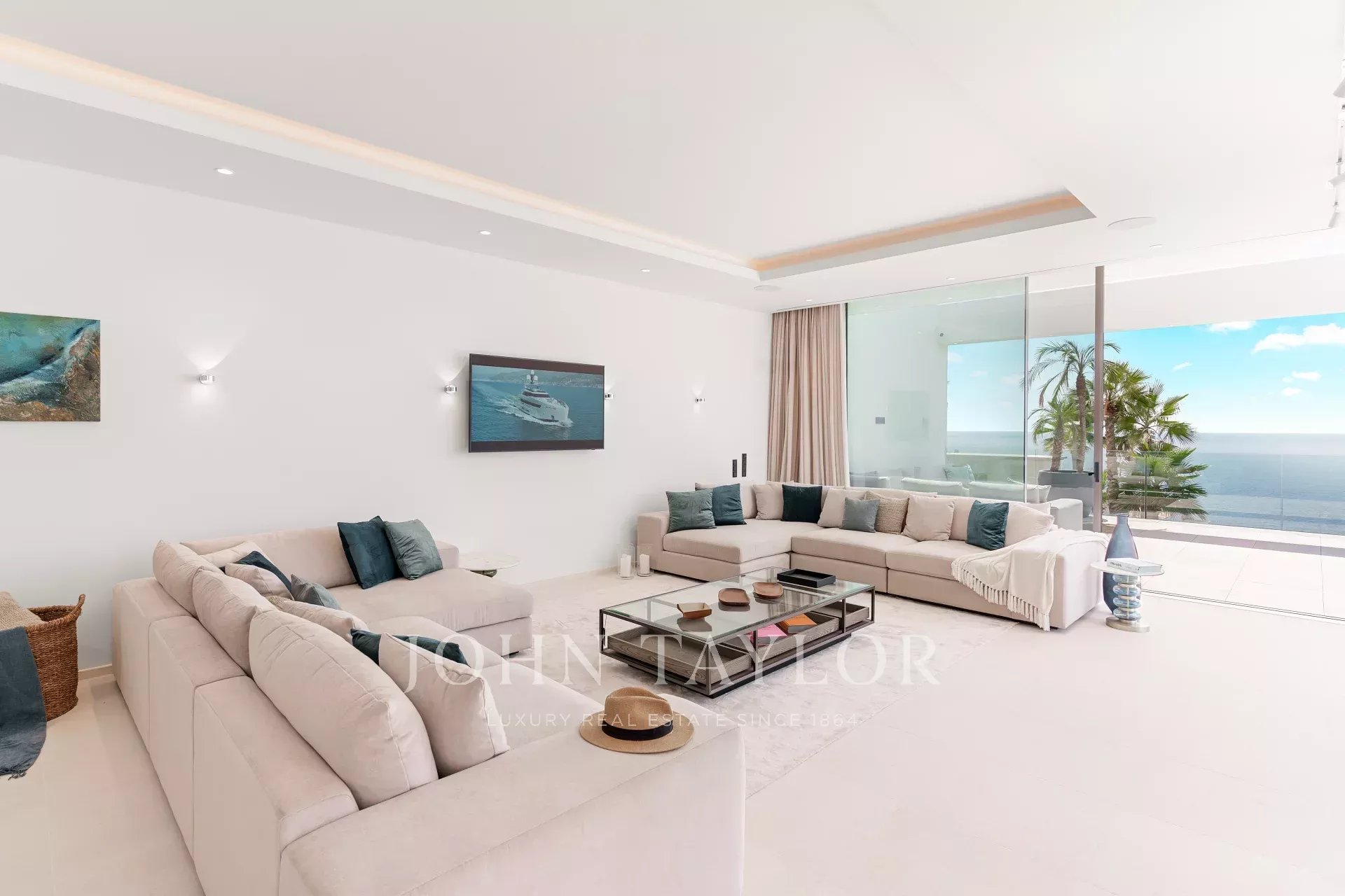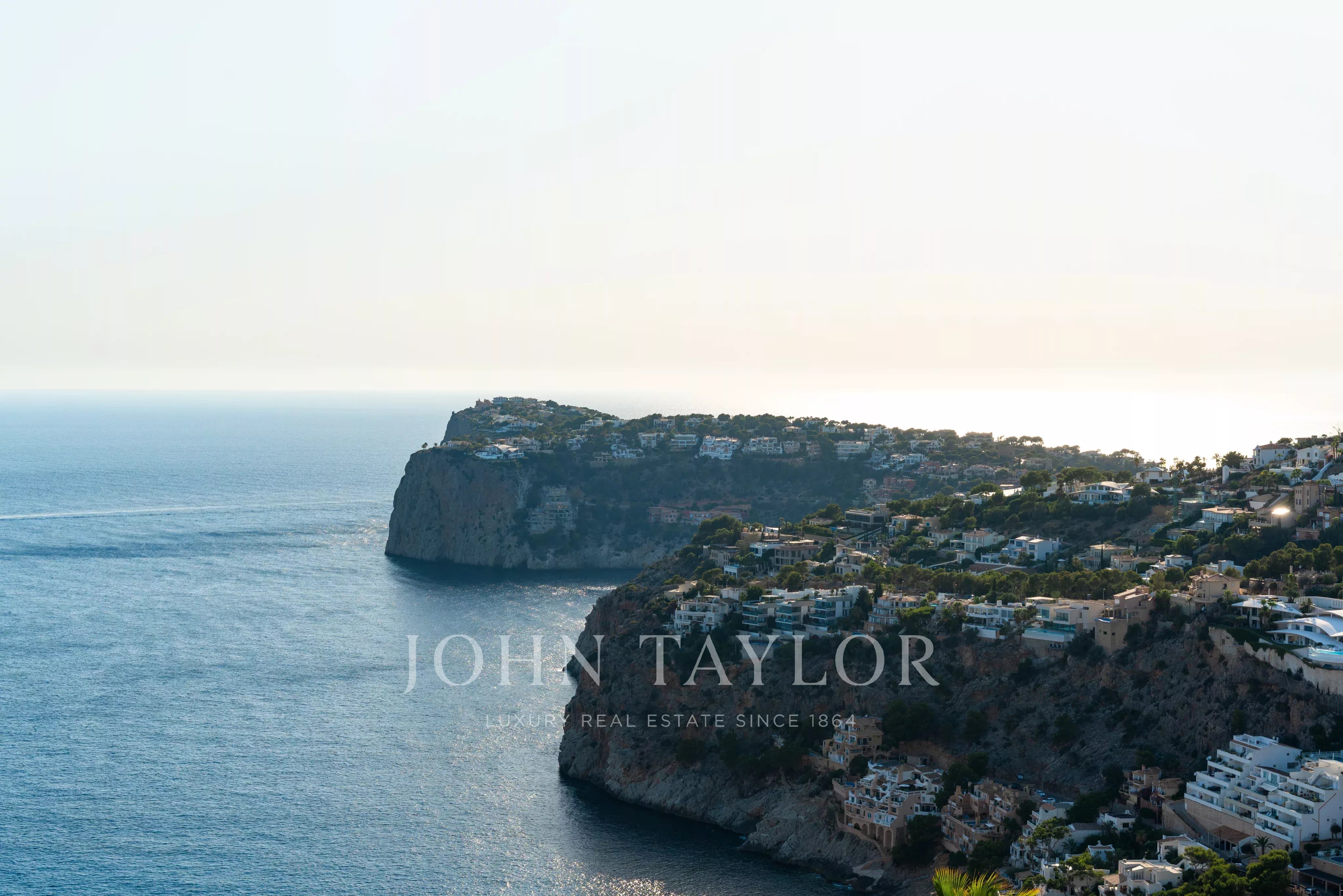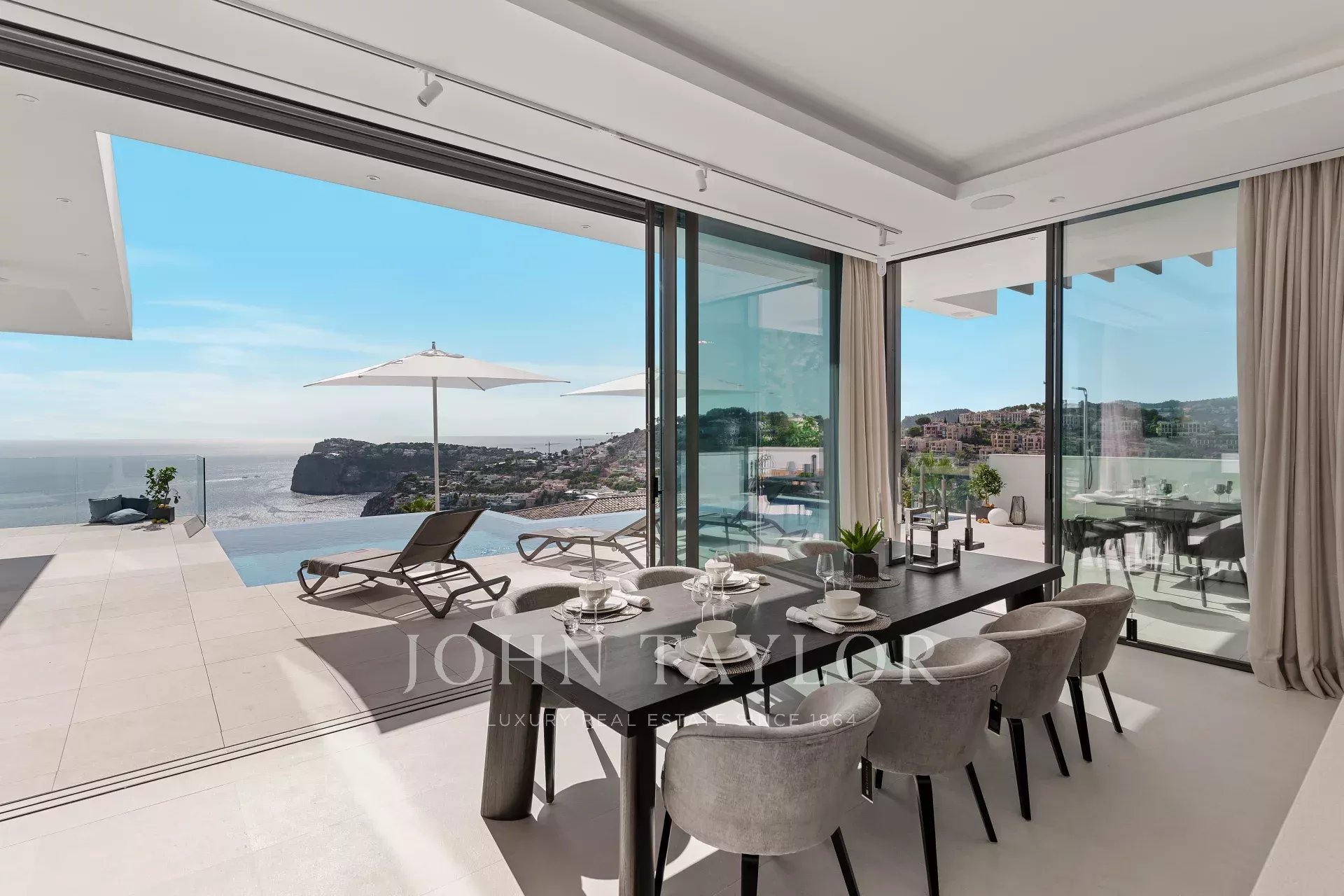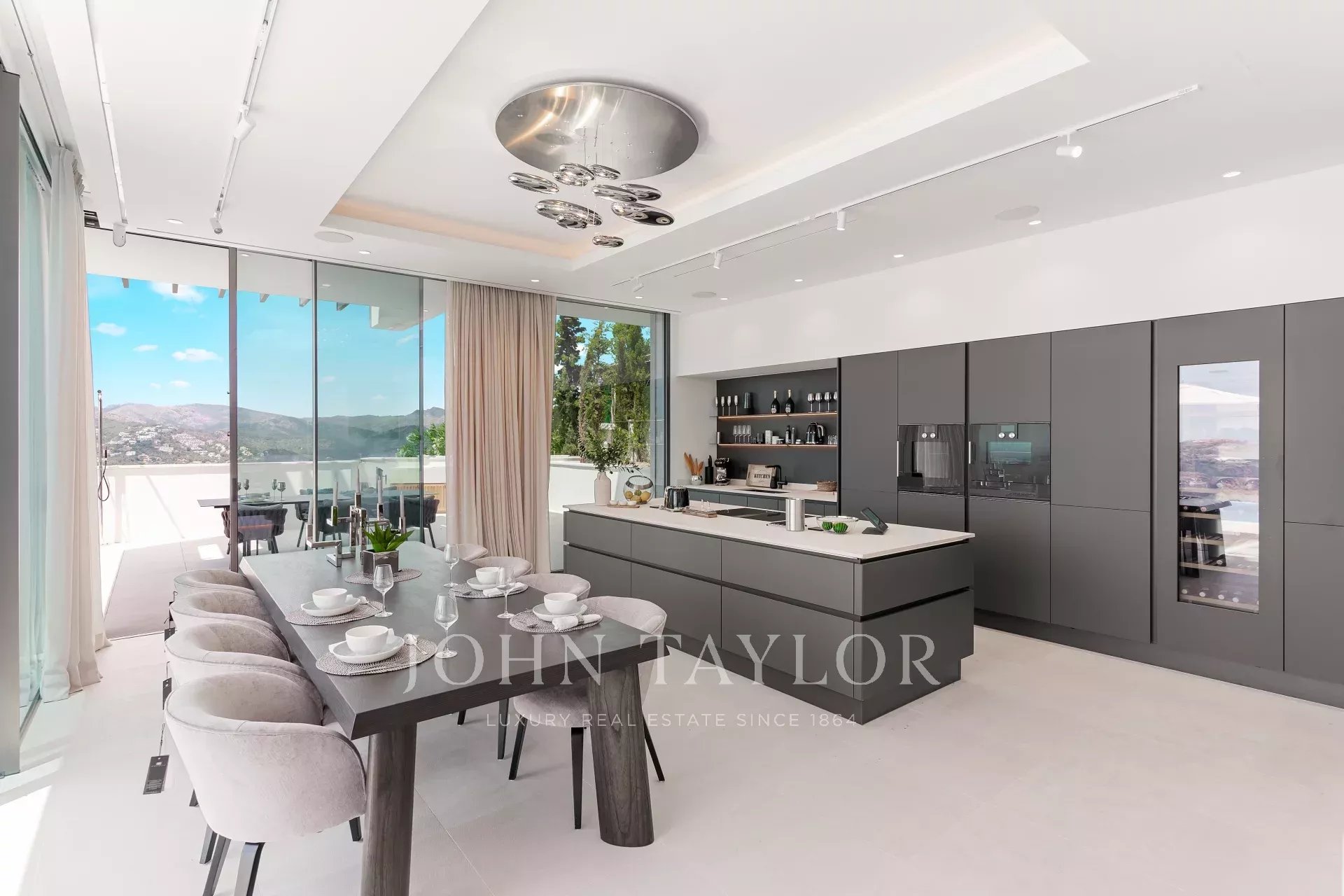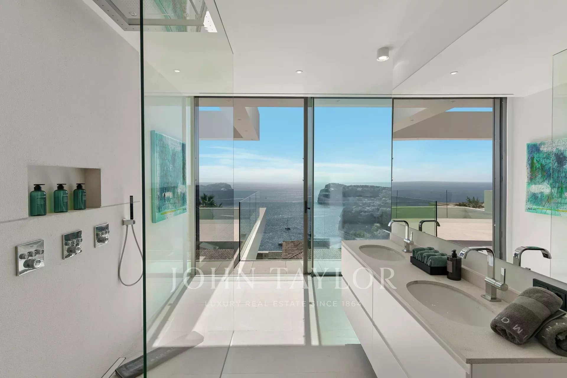 In an exceptional location at the top of Cala Llamp, this impressive modern villa blends harmoniously into the mountainside and offers unique and breathtaking sea views. The view stretches from the spectacular bay with its wonderful blue waters to the peninsula of La Mola and the open sea in the background. The villa offers generous luxury, with 6 underground parking spaces and 6 bedrooms on a living area of 691 square metres, set on a plot of 1,038 square metres. The impressive architecture combines cantilevered structures with white plastered frescoes and a perfectly crafted minimalist glass façade. The building blends perfectly into the natural surroundings thanks to the classic combination of limestone and beautifully crafted Mallorcan natural stone walls. In the fascinating interior design the best natural materials have been used to create a perfect balance between light and shade, ensuring a comfortable and pleasant atmosphere. The villa has been designed with great attention to detail to maximise the breathtaking panoramic views from the main rooms and terraces. Due to its south-west orientation, the villa enjoys sun all day long and offers the most incredible sunsets, where the silhouette of the neighbouring island of Ibiza can be seen. The careful orientation of the building, the elevation, the studied distribution and the integration into the landscape create a perfect environment to enjoy the Mediterranean and absolute privacy at the same time. The property is in an excellent location overlooking the bay of Cala Llamp, offering peace, tranquillity, security and privacy in this exclusive setting. The popular Gran Folies Beach Club is just a few minutes' walk away, and in the immediate vicinity there are numerous interesting and high quality cafés and restaurants in the harbour and marina. Discover the extraordinary lifestyle of this exquisite villa. Please contact us for more information and to arrange a viewing.