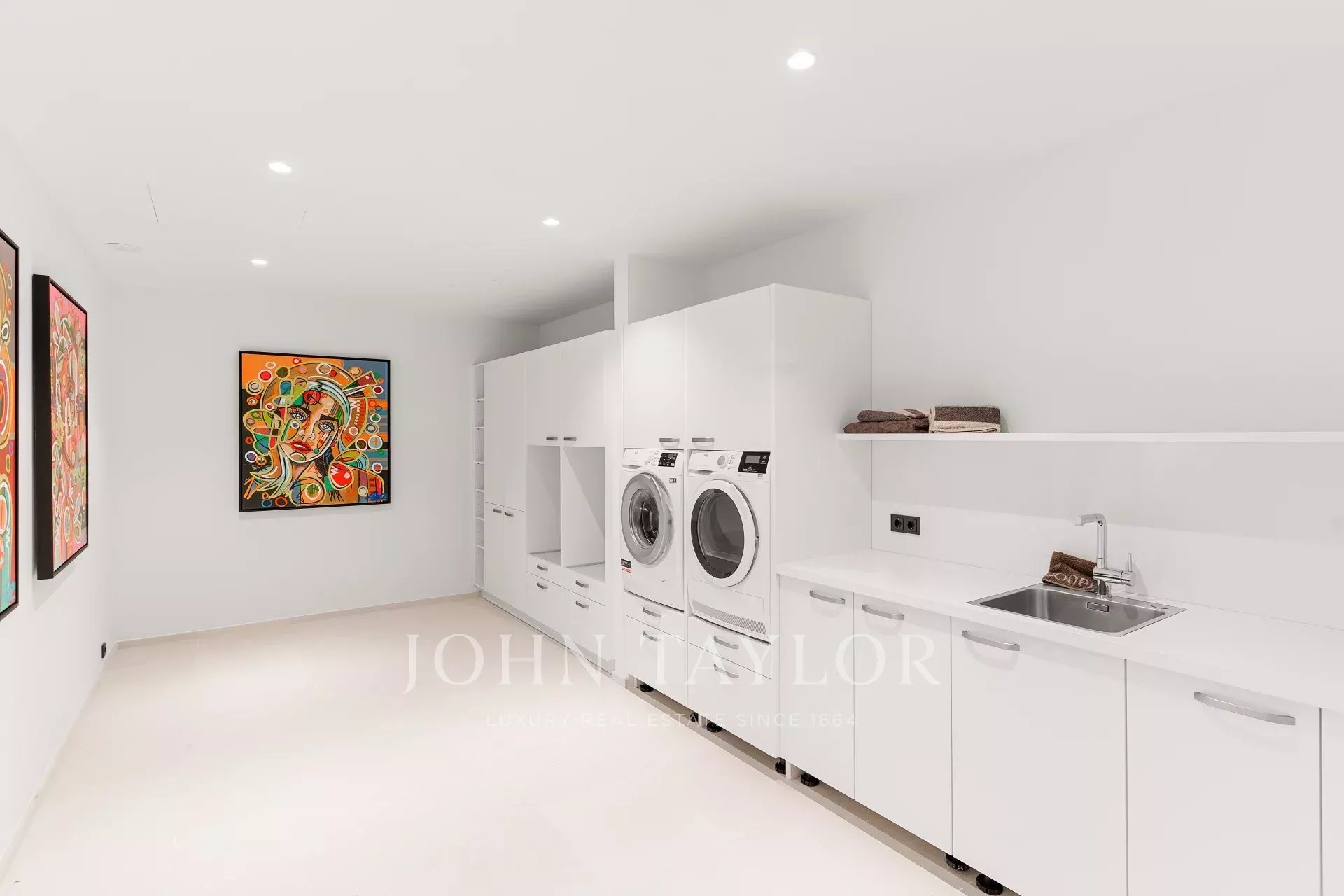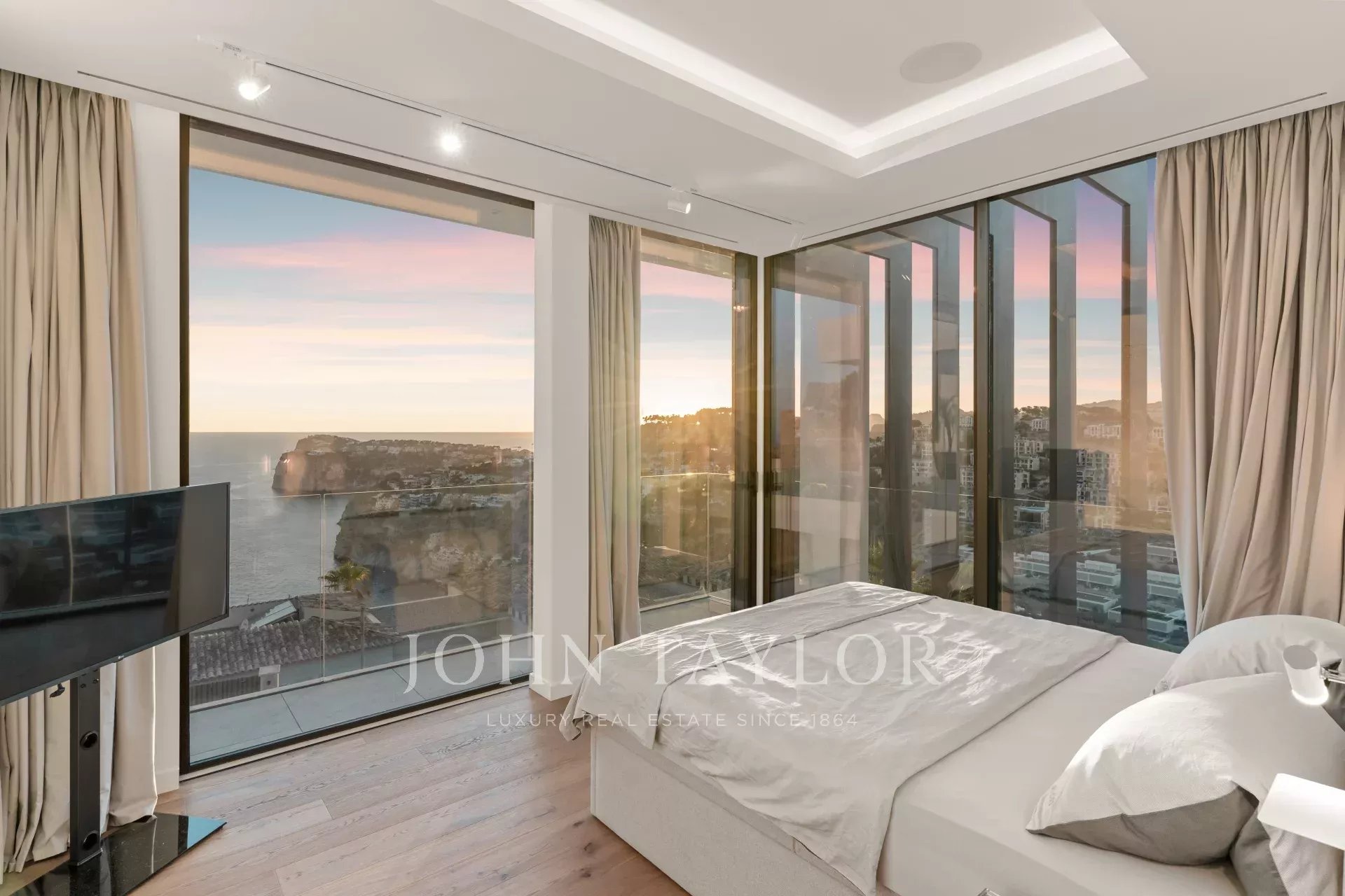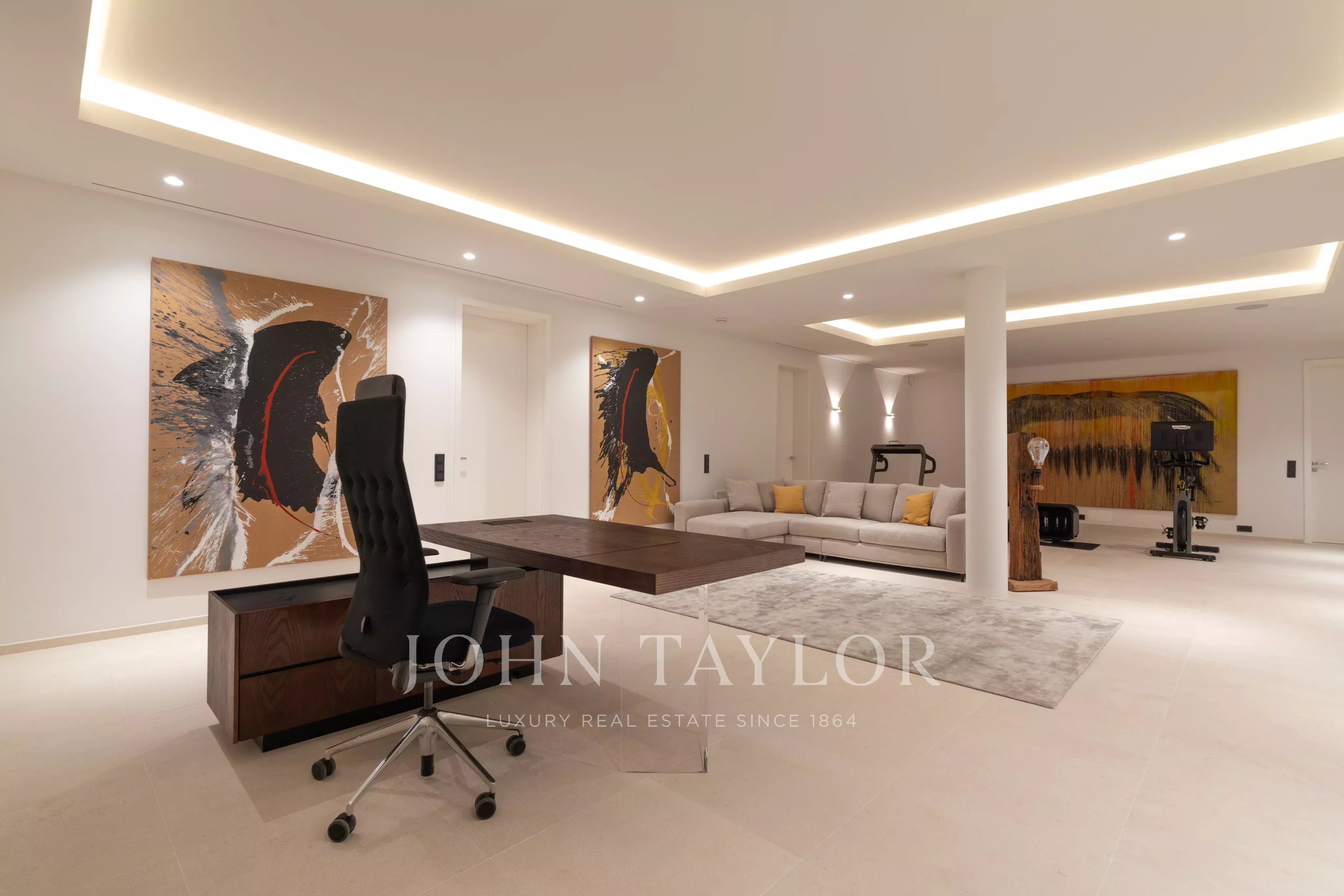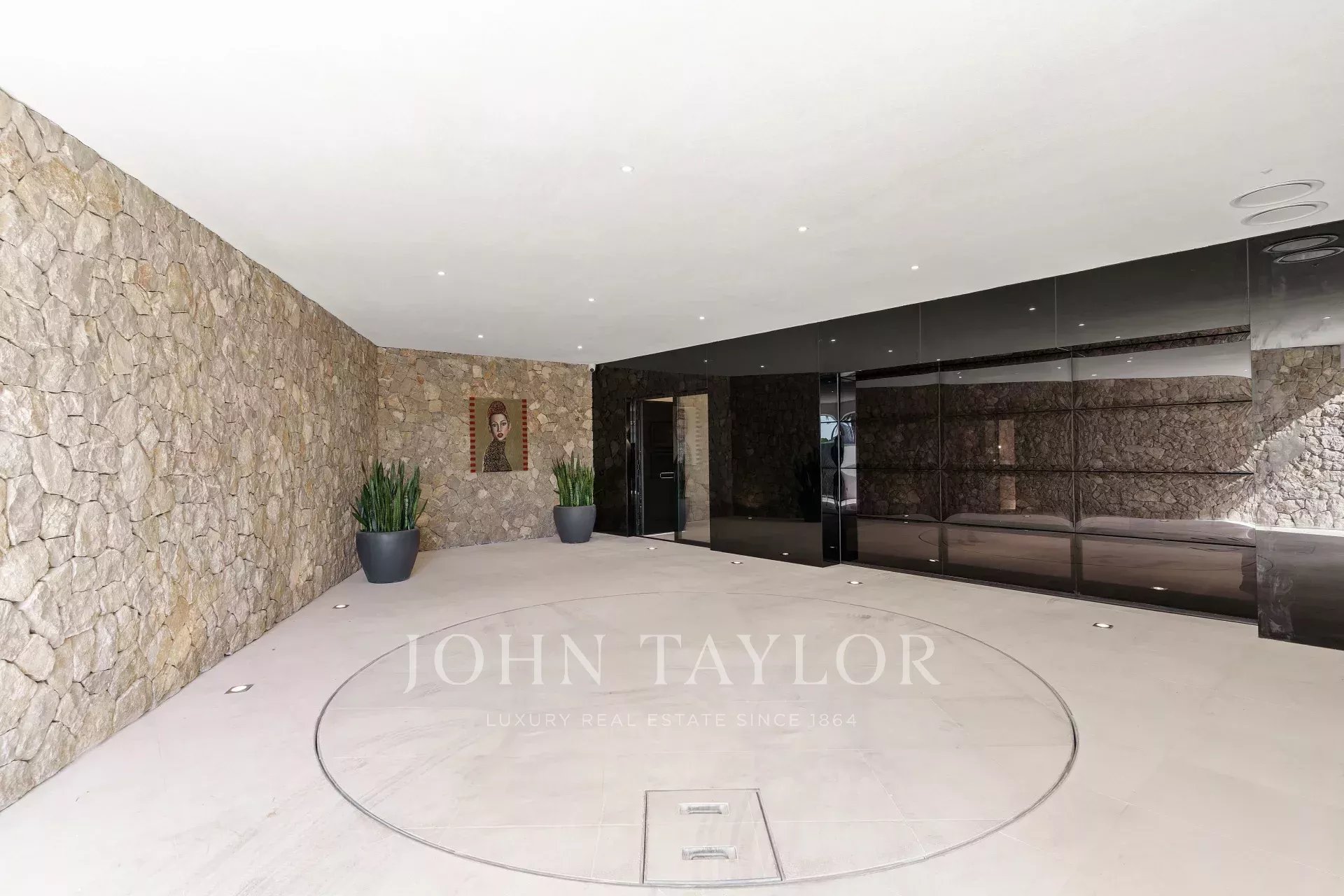 In an exceptional location at the top of Cala Llamp, this impressive modern villa blends harmoniously into the mountainside and offers unique and breathtaking sea views. The view stretches from the spectacular bay with its wonderful blue waters to the peninsula of La Mola and the open sea in the background. The villa offers generous luxury, with 6 underground parking spaces and 6 bedrooms on a living area of 691 square metres, set on a plot of 1,038 square metres. The impressive architecture combines cantilevered structures with white plastered frescoes and a perfectly crafted minimalist glass façade. The building blends perfectly into the natural surroundings thanks to the classic combination of limestone and beautifully crafted Mallorcan natural stone walls. In the fascinating interior design the best natural materials have been used to create a perfect balance between light and shade, ensuring a comfortable and pleasant atmosphere. The villa has been designed with great attention to detail to maximise the breathtaking panoramic views from the main rooms and terraces. Due to its south-west orientation, the villa enjoys sun all day long and offers the most incredible sunsets, where the silhouette of the neighbouring island of Ibiza can be seen. The careful orientation of the building, the elevation, the studied distribution and the integration into the landscape create a perfect environment to enjoy the Mediterranean and absolute privacy at the same time. The property is in an excellent location overlooking the bay of Cala Llamp, offering peace, tranquillity, security and privacy in this exclusive setting. The popular Gran Folies Beach Club is just a few minutes' walk away, and in the immediate vicinity there are numerous interesting and high quality cafés and restaurants in the harbour and marina. Discover the extraordinary lifestyle of this exquisite villa. Please contact us for more information and to arrange a viewing.