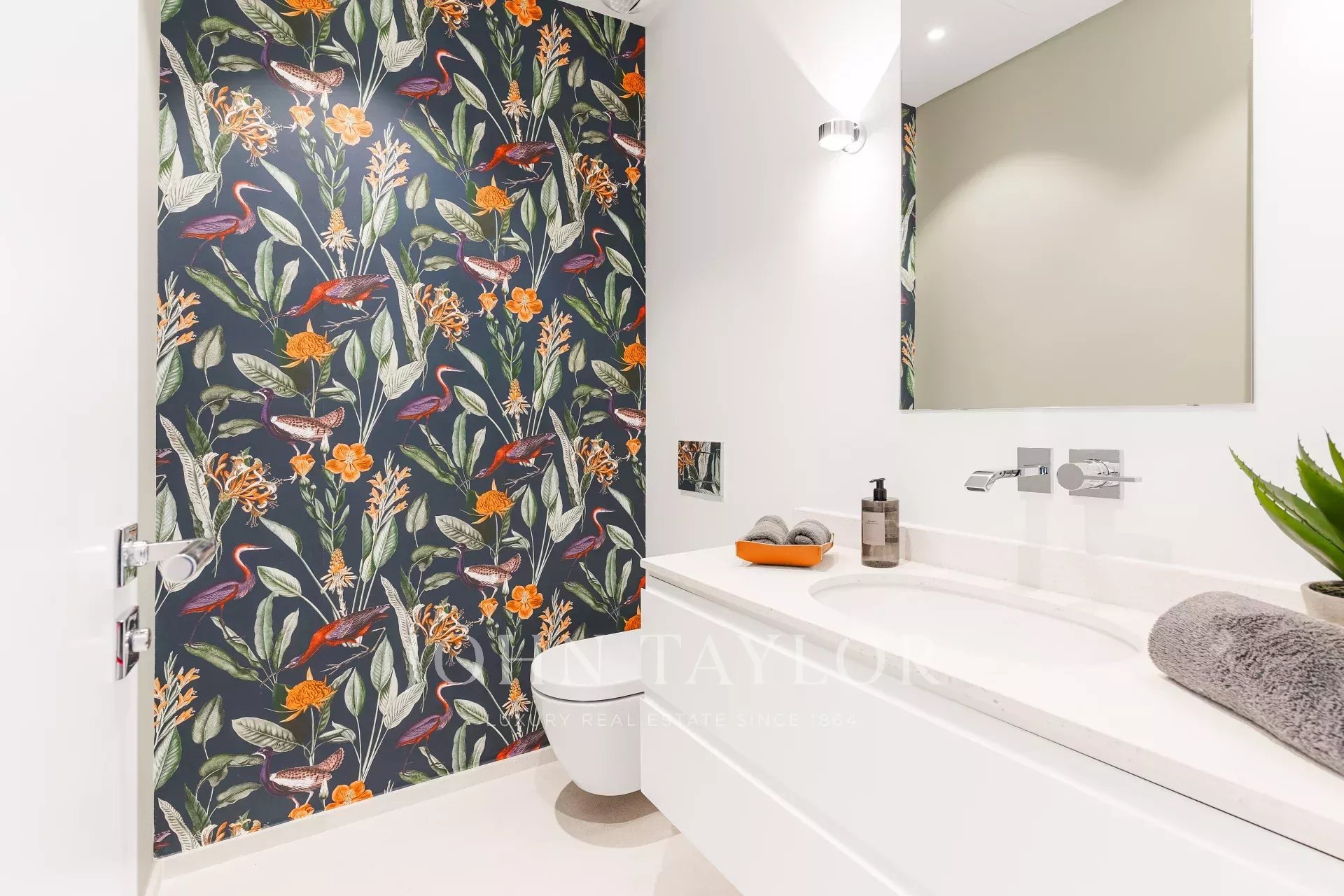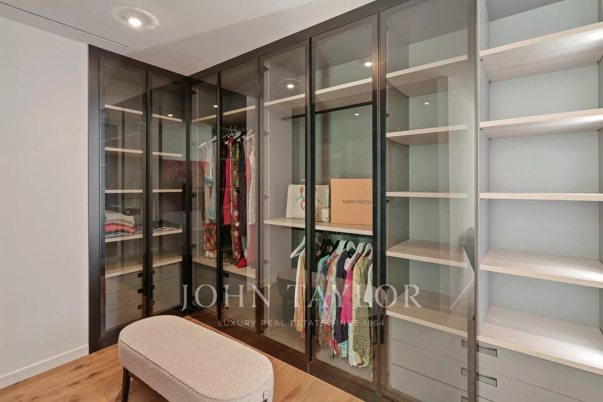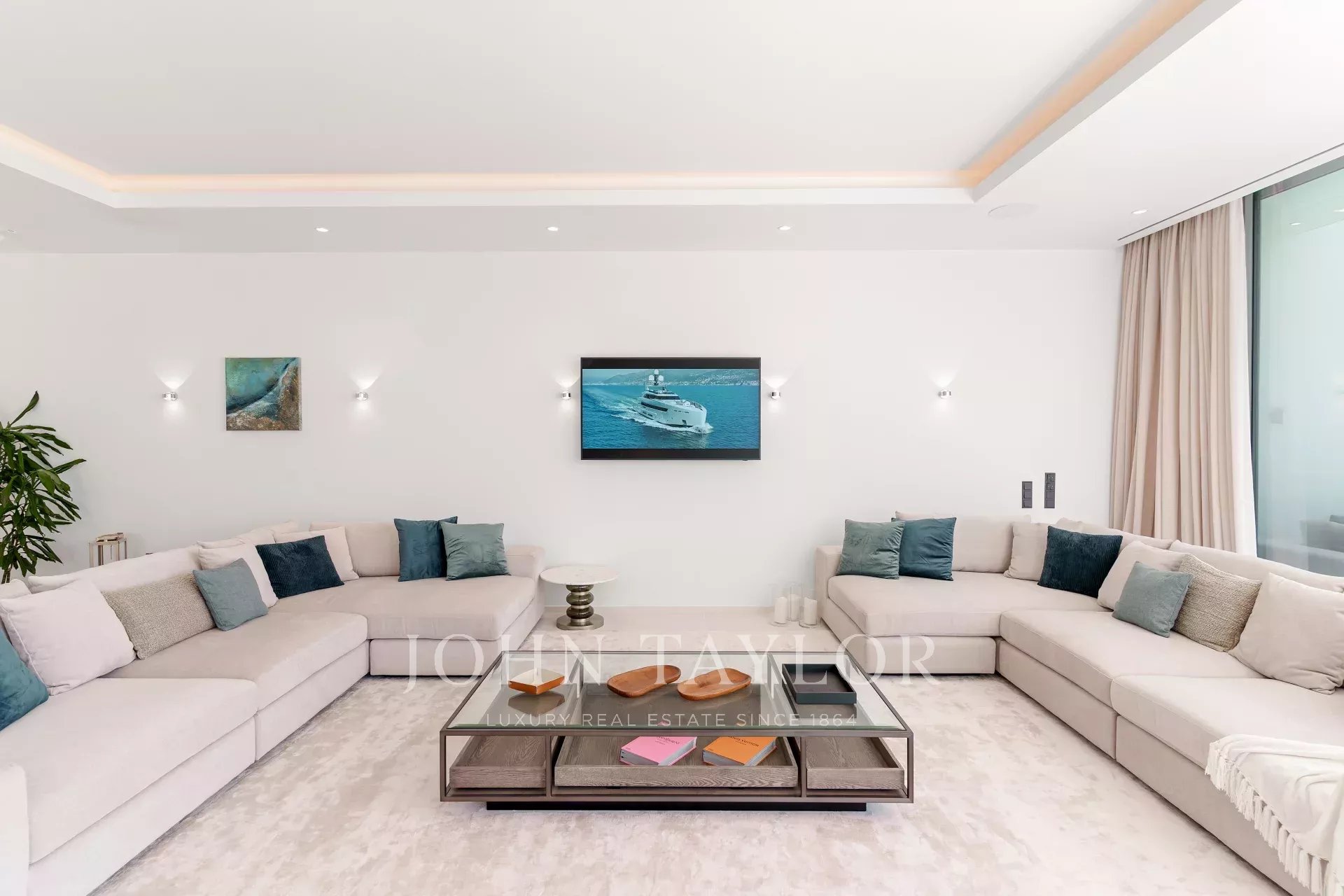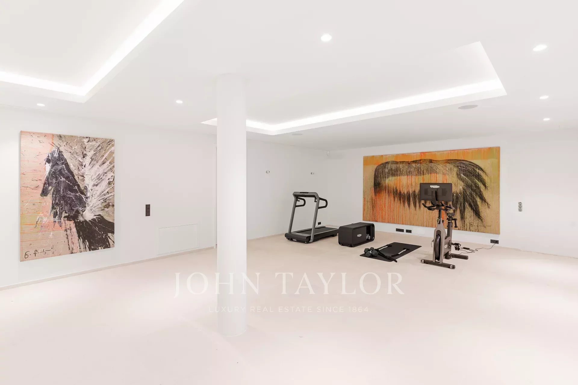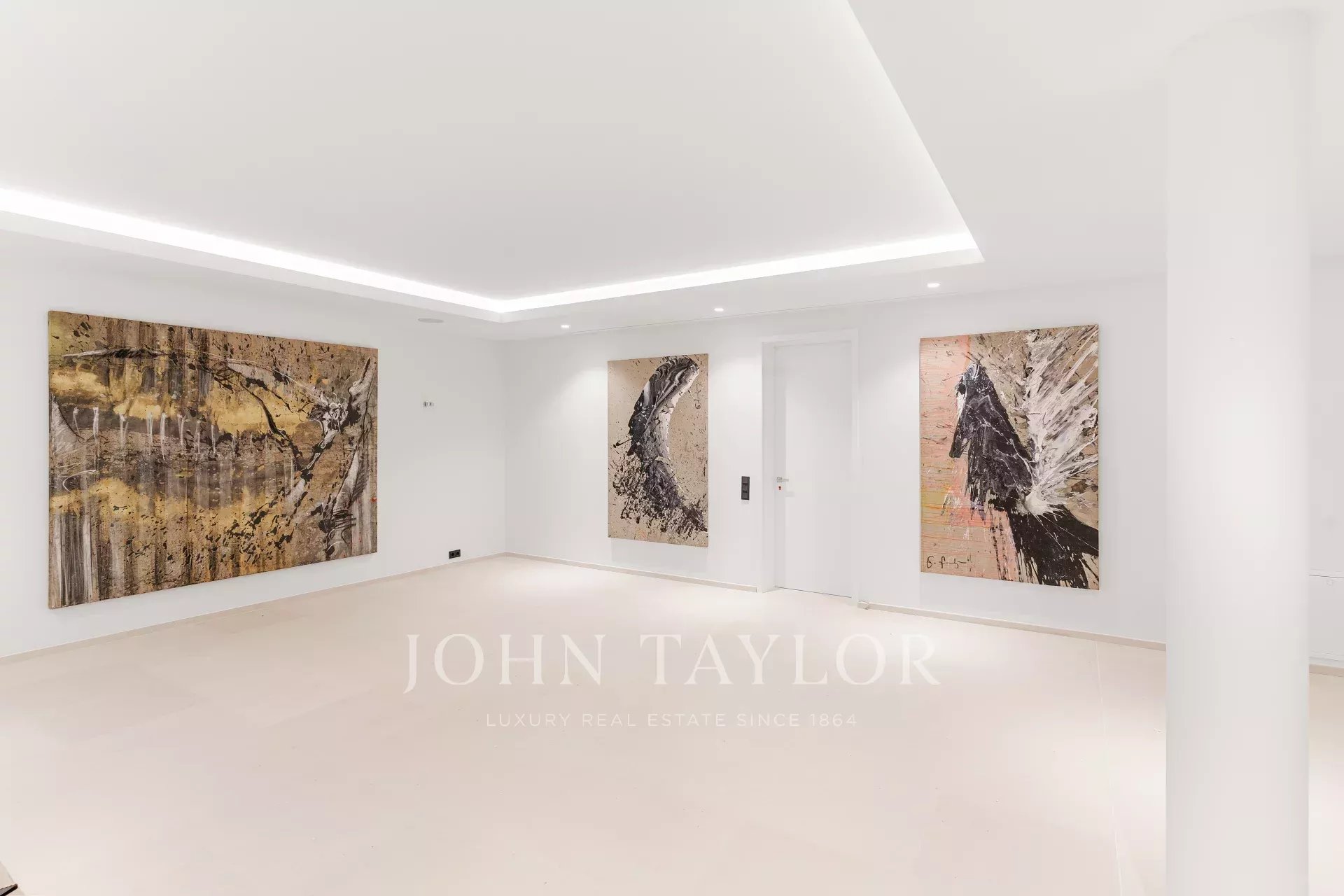 In an exceptional location at the top of Cala Llamp, this impressive modern villa blends harmoniously into the mountainside and offers unique and breathtaking sea views. The view stretches from the spectacular bay with its wonderful blue waters to the peninsula of La Mola and the open sea in the background. The villa offers generous luxury, with 6 underground parking spaces and 6 bedrooms on a living area of 691 square metres, set on a plot of 1,038 square metres. The impressive architecture combines cantilevered structures with white plastered frescoes and a perfectly crafted minimalist glass façade. The building blends perfectly into the natural surroundings thanks to the classic combination of limestone and beautifully crafted Mallorcan natural stone walls. In the fascinating interior design the best natural materials have been used to create a perfect balance between light and shade, ensuring a comfortable and pleasant atmosphere. The villa has been designed with great attention to detail to maximise the breathtaking panoramic views from the main rooms and terraces. Due to its south-west orientation, the villa enjoys sun all day long and offers the most incredible sunsets, where the silhouette of the neighbouring island of Ibiza can be seen. The careful orientation of the building, the elevation, the studied distribution and the integration into the landscape create a perfect environment to enjoy the Mediterranean and absolute privacy at the same time. The property is in an excellent location overlooking the bay of Cala Llamp, offering peace, tranquillity, security and privacy in this exclusive setting. The popular Gran Folies Beach Club is just a few minutes' walk away, and in the immediate vicinity there are numerous interesting and high quality cafés and restaurants in the harbour and marina. Discover the extraordinary lifestyle of this exquisite villa. Please contact us for more information and to arrange a viewing.