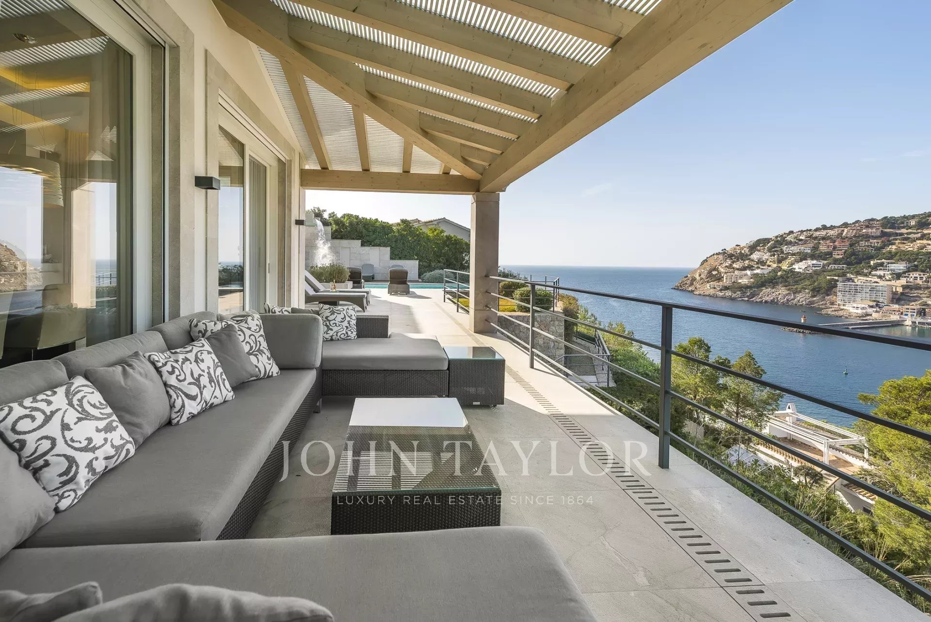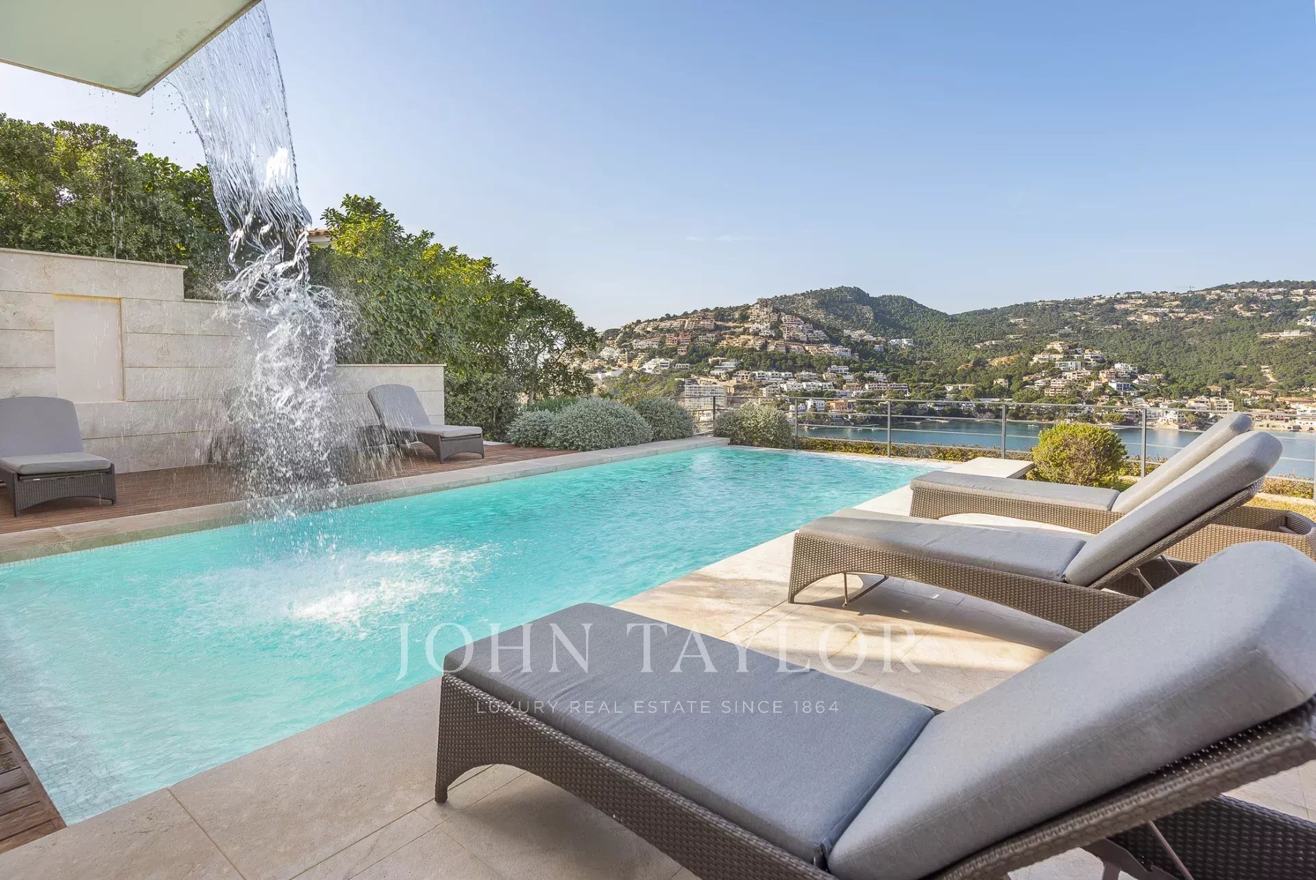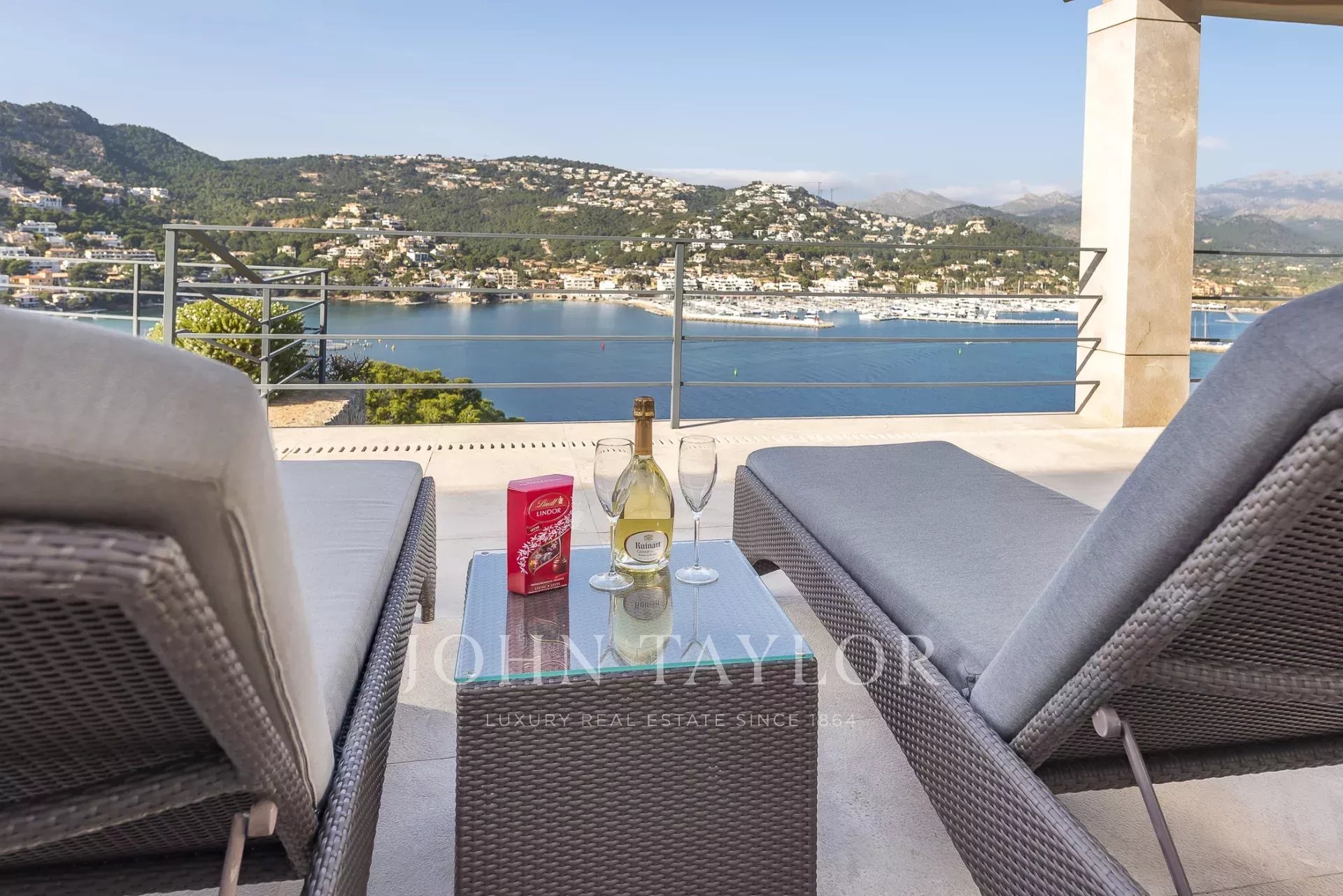 Luxury villa in top location. In this newly built villa, 5 bedrooms with en-suite bathrooms are distributed over 600 m2 of living space. Modern construction and design run through the entire house. The fully equipped open-plan kitchen leaves nothing to be desired. Whether from the bedroom, the cosy living area with fireplace, or the kitchen, every room has a breathtaking view over the bay of Puerto de Andratx and the harbour. Outside, you will find the heated infinity pool with a chill-out area and a large dining table with a BBQ. A special highlight is the in-house sauna, from which you can enjoy a magnificent view over the sea thanks to the large glass front. Breathtaking sunsets are guaranteed here.