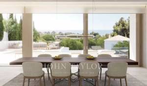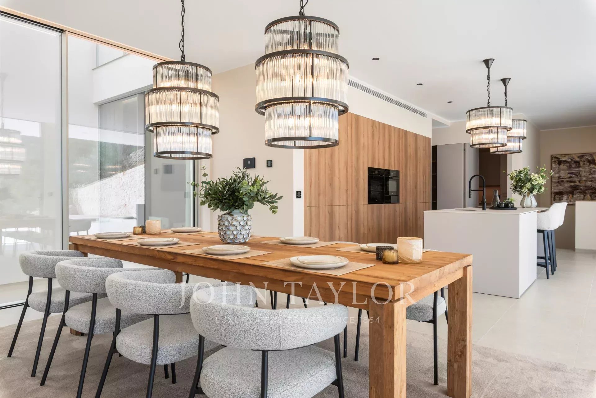 We present this exclusive villa of contemporary design, located in the most coveted area of Puerto Portals and ready to move in. An exceptional residence that combines modern architecture, Mediterranean elegance and panoramic sea views, offering maximum comfort in a privileged environment. On a plot of approximately 1,328 m², this villa stands with a living area of about 680 m², distributed with style and brightness. On the main floor is the entrance area and five spacious bedrooms en suite, all with stunning sea views and direct access to private terraces. Upstairs 5 bedrooms en suite. The first floor offers an elegant open concept living space, a fully equipped designer kitchen with top quality materials and dining area, a second auxiliary kitchen, a guest toilet and a bedroom with en suite bathroom. The spacious terraces and infinity pool create the perfect setting to enjoy the Mallorcan outdoor lifestyle all year round. On the lower level, the villa has a private cinema room, a gym, a laundry room and a technical room, as well as a garage for several vehicles. Among its many features are underfloor heating, air conditioning, a water treatment system, elevator, advanced home automation, a carefully designed LED lighting, automatic irrigation system, high quality insulating glazing, plus a spectacular pool and private gym. A villa where luxury, privacy and design merge to offer a unique residential experience in one of the most exclusive locations in Mallorca.