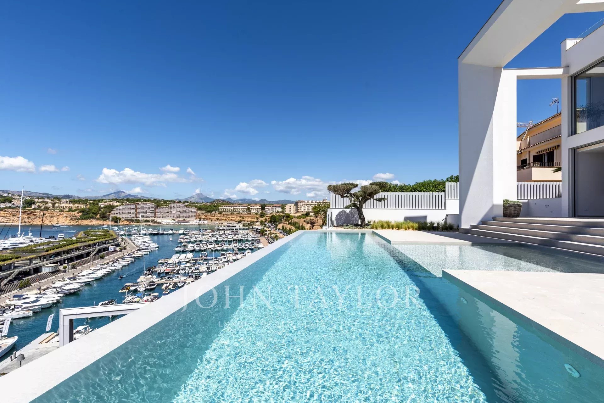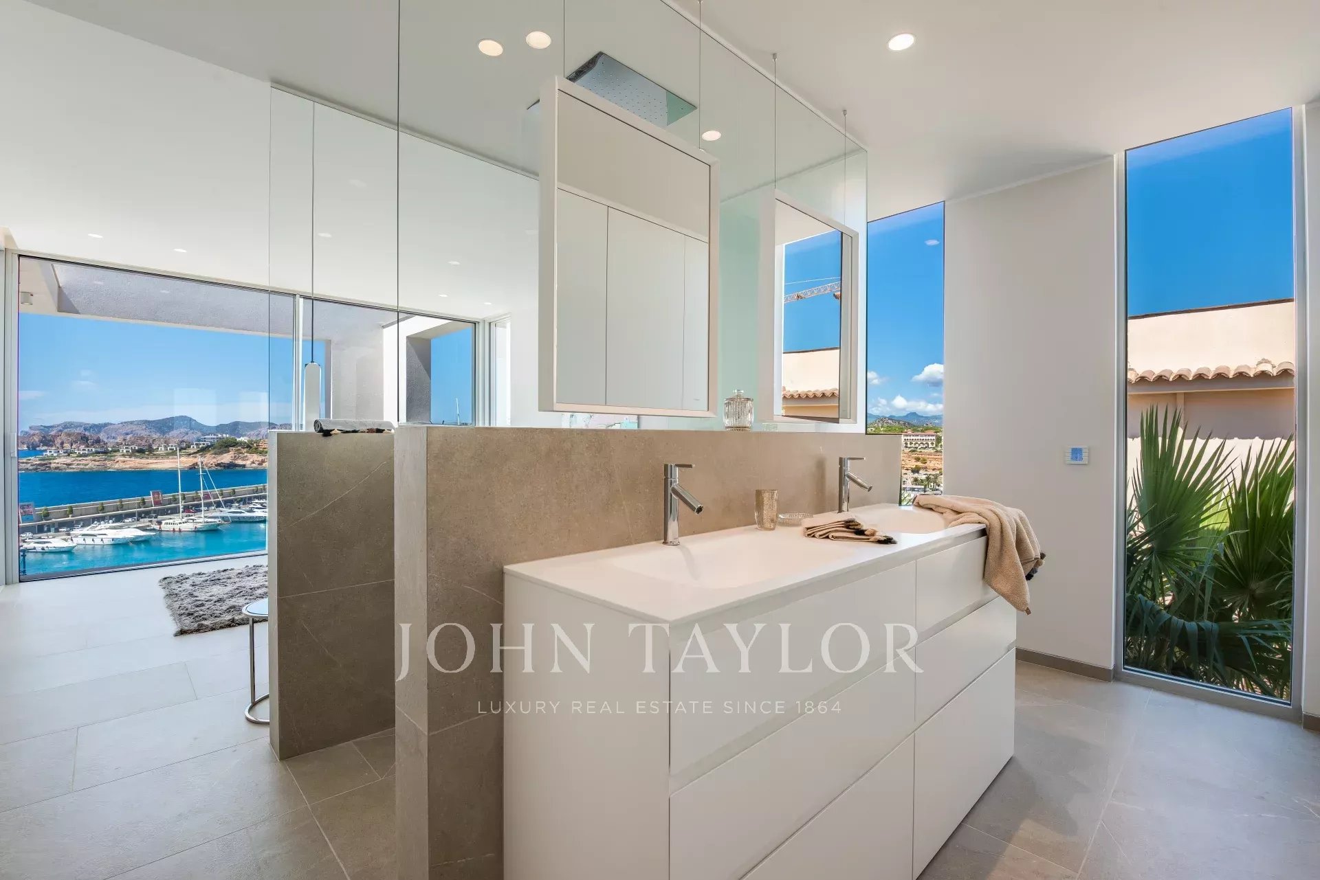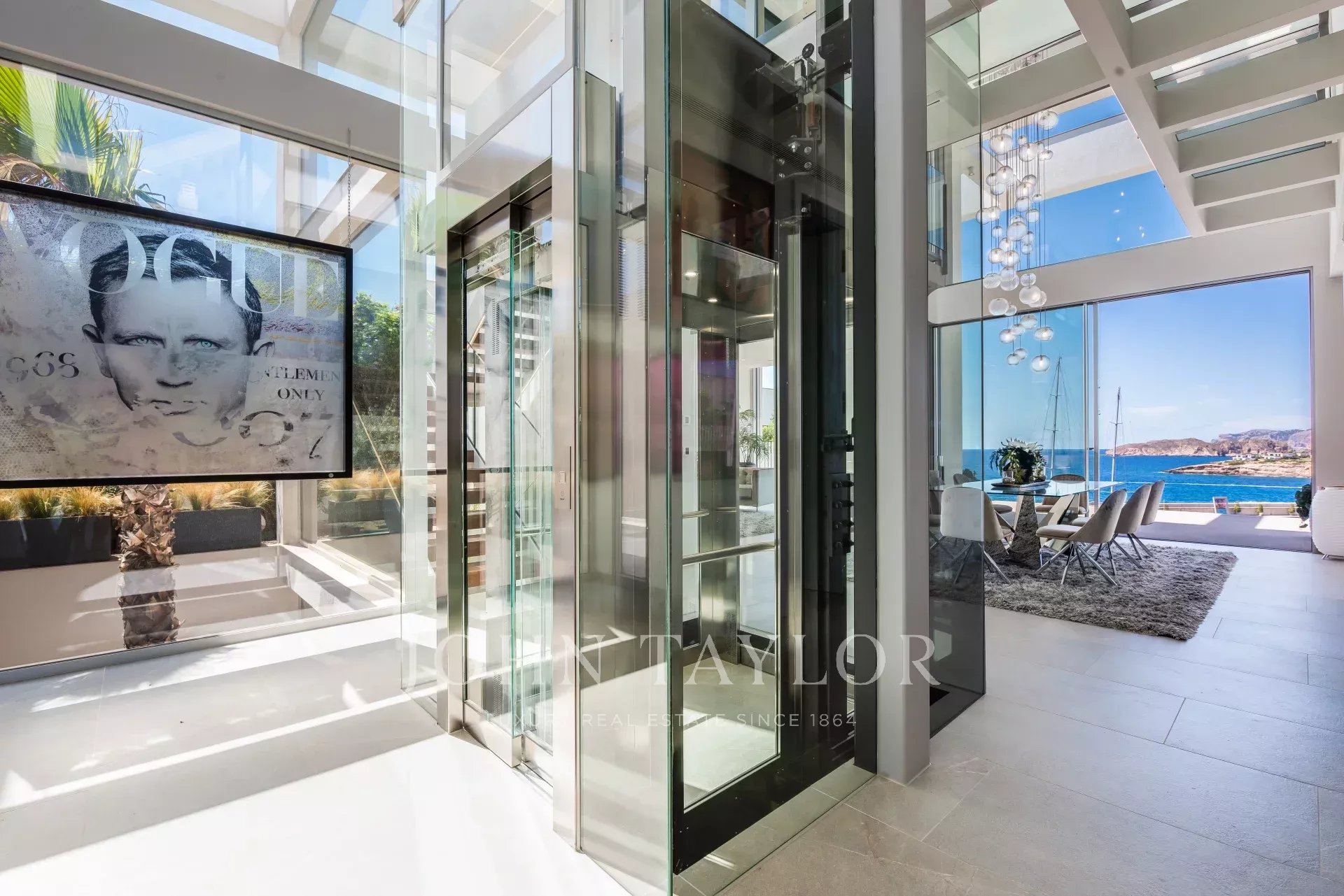 This ultra-modern villa is located in the port of Port Adriano in Santa Ponsa. The unique architectural style with huge window fronts give you freedom. This architectural work of art is distributed over 3 levels connected by a glass elevator, as well as glass corridors etc. With this unique architecture it is meant to bring all the Mediterranean light into this villa. This villa has 4 double bedrooms, each with a bathroom en-suite, a light-flooded living room, open kitchen with state-of-the-art equipment, a fitness room, a home cinema, a wine room, garage and parking spaces for 2 cars are just some of the features of this unique villa.